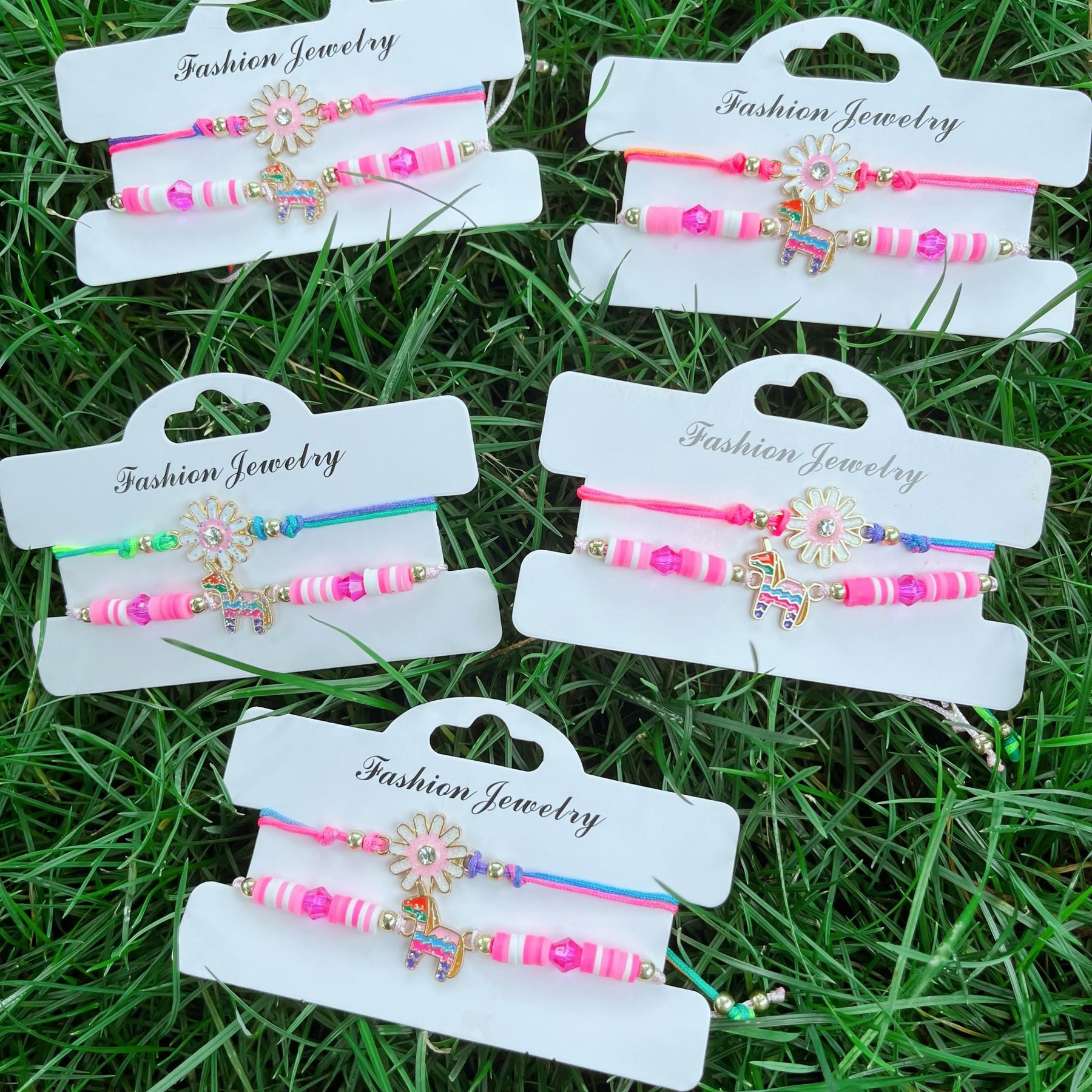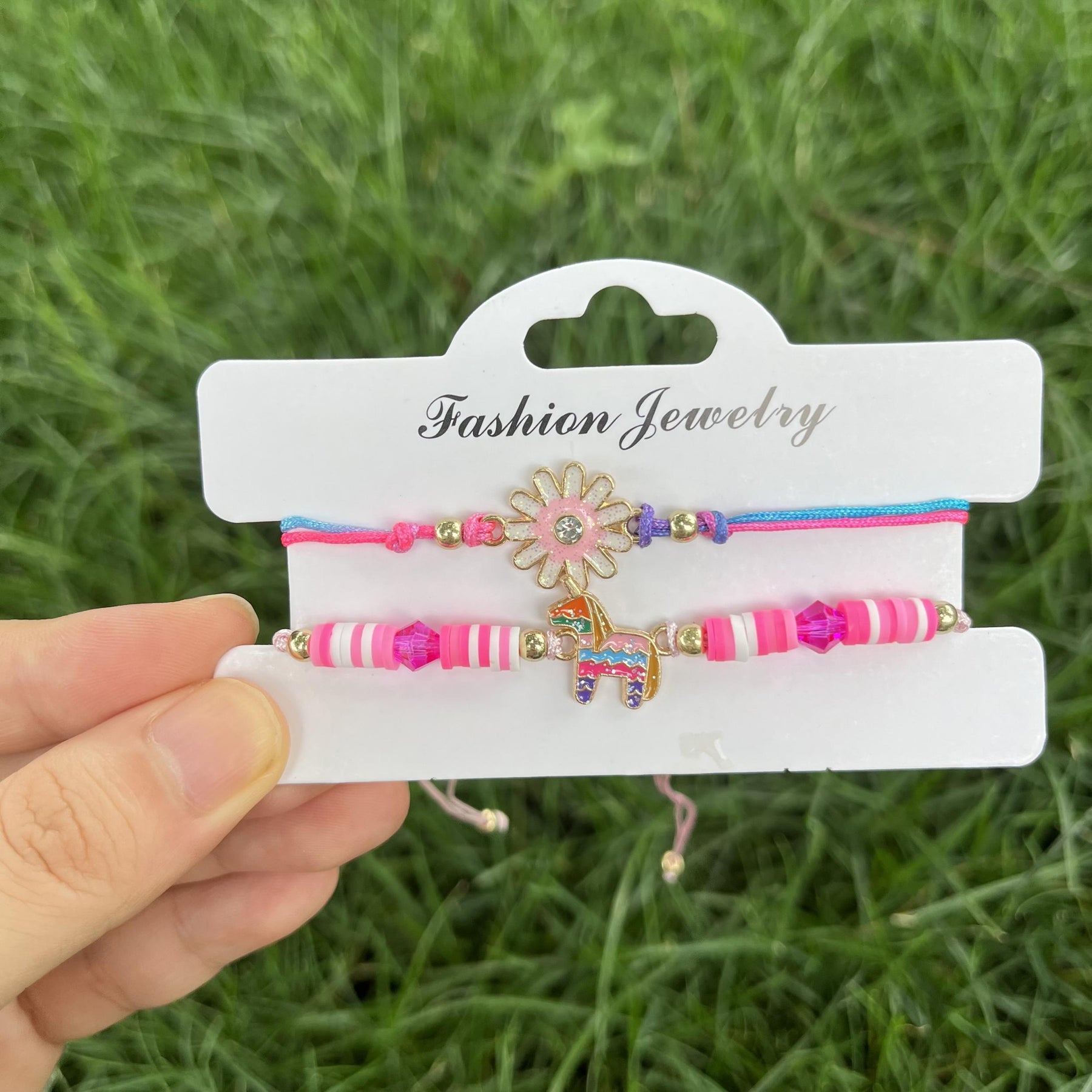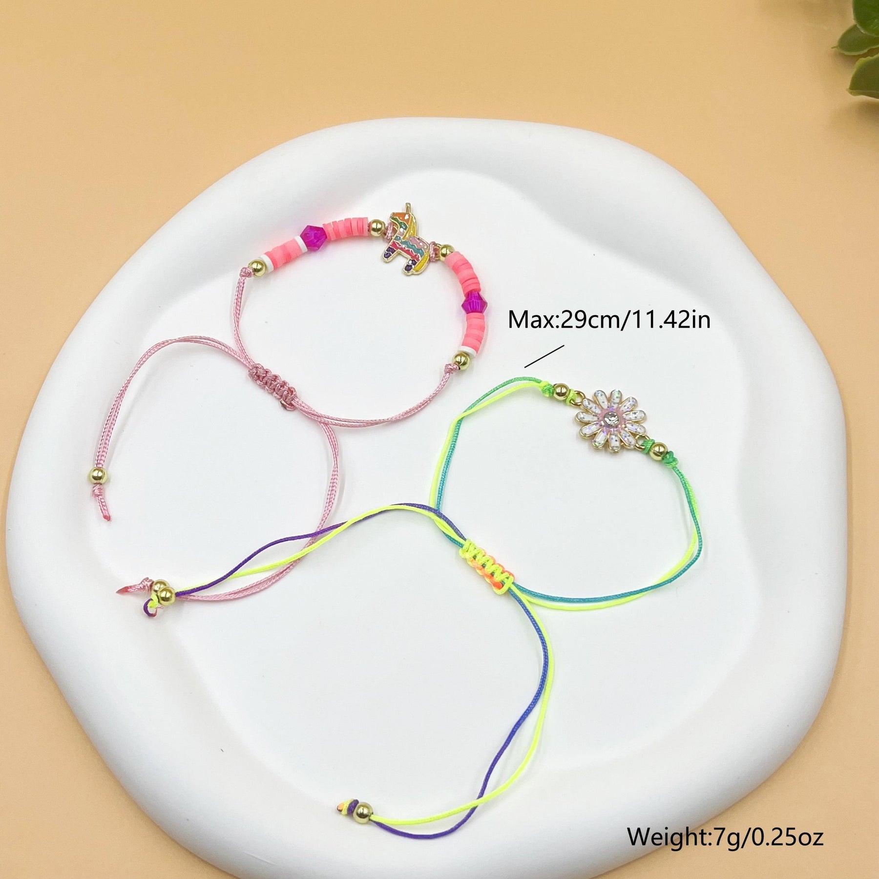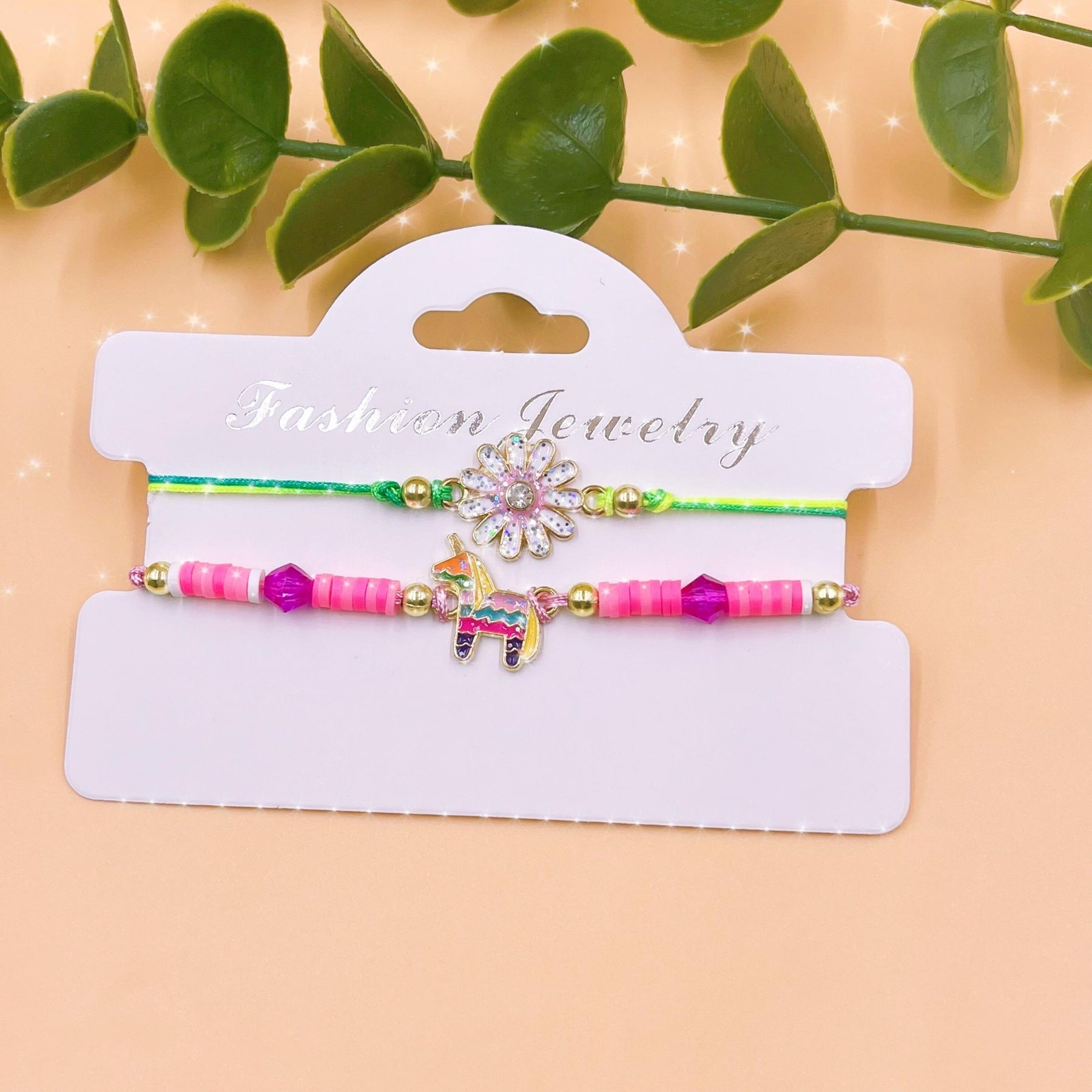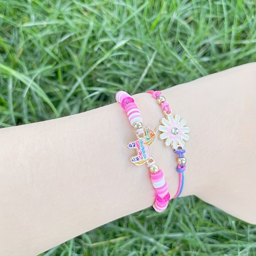 Get this adorable 2-piece set featuring a pink unicorn pendant and a braided bracelet with colorful flowers. Perfect for unicorn lovers and those who adore cute accessories.