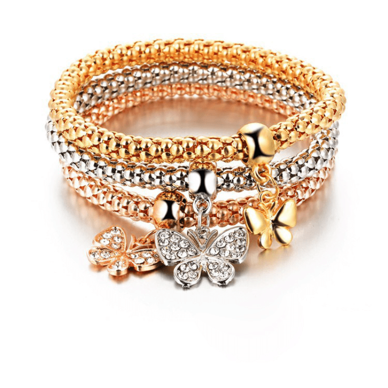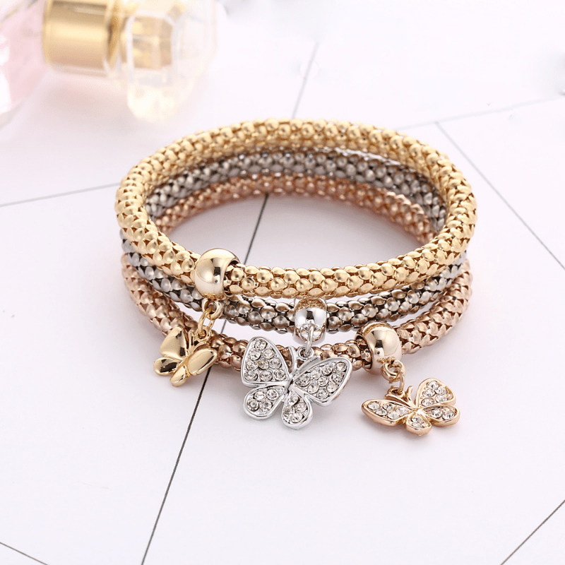 This set includes 3 beautiful bracelets with butterfly shape pendants inlaid with zircon. The bracelets are multilayer and stretchable, perfect for women and girls.