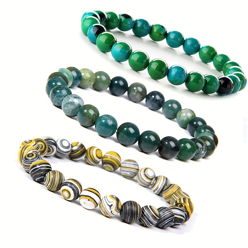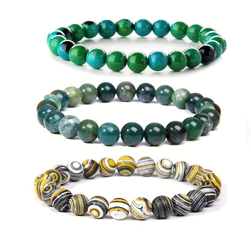 Elevate your style with this set of 3 healing stone bead bracelets for men. The natural stones offer calming energy and a fashionable look.