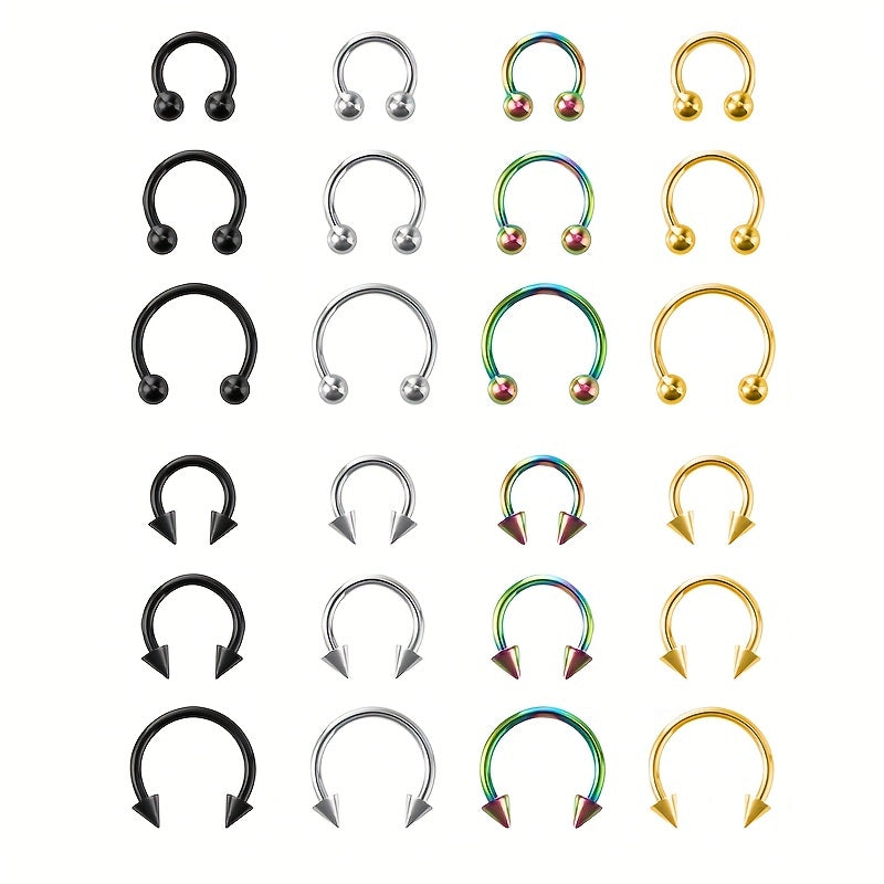 This set includes 3 stainless steel body piercing rings in sizes 6mm, 8mm, and 10mm, perfect for nose, septum, lip, and smiley piercings.