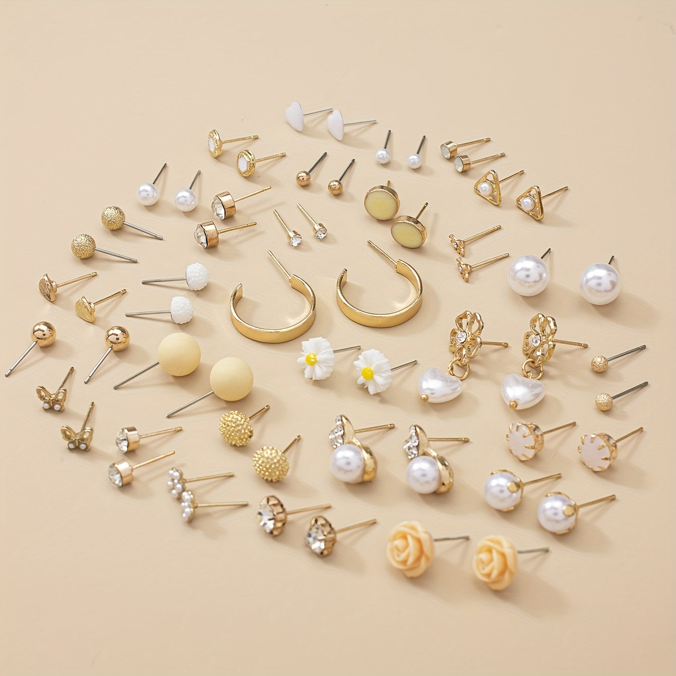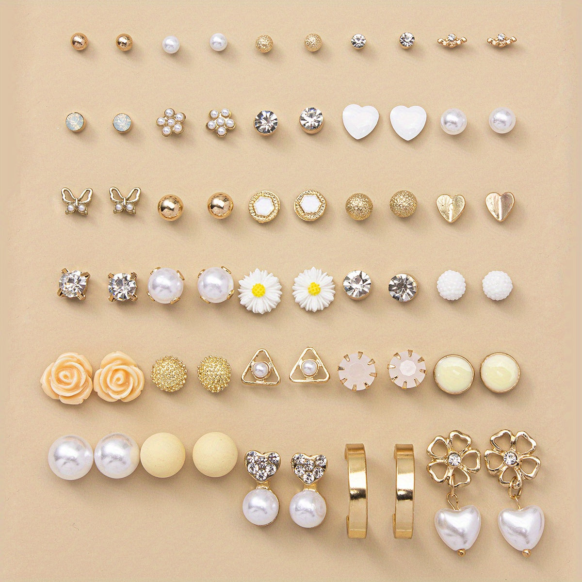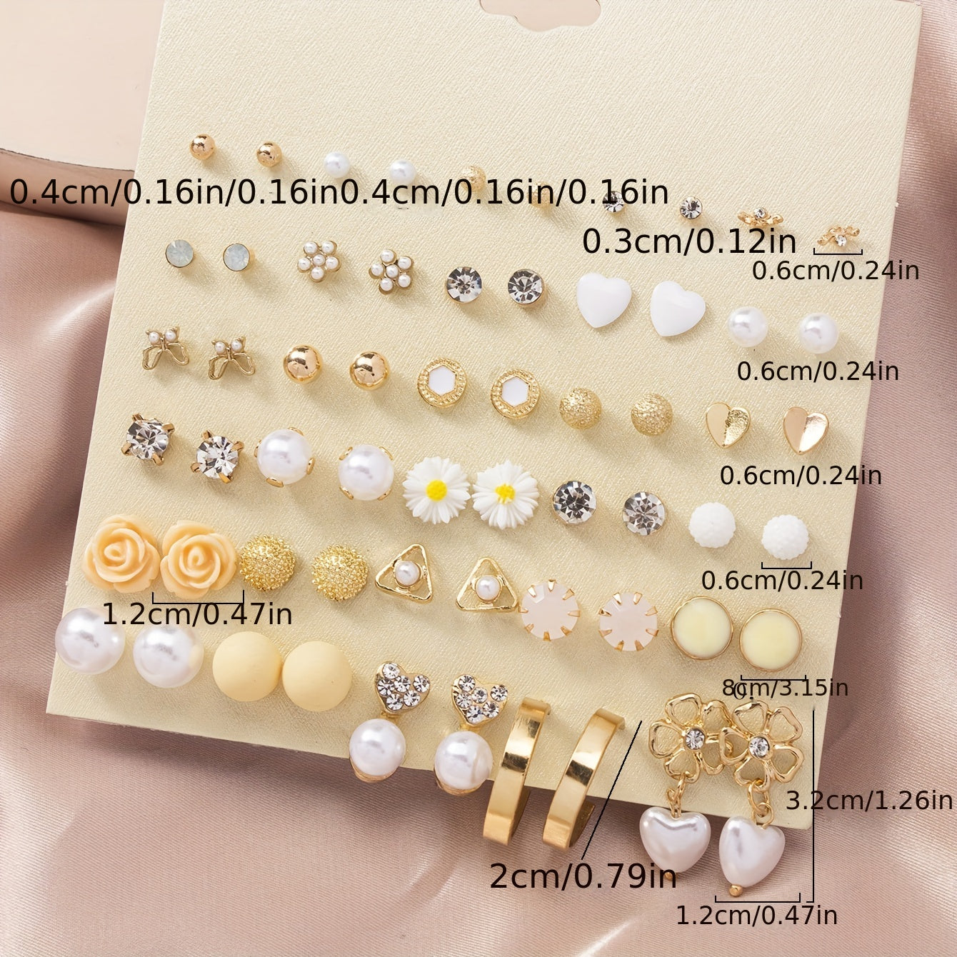 Complete your look with this 30 pairs set of golden stud earrings featuring flower, faux pearl, and rhinestone decoration. Made with zinc alloy, perfect for daily and casual wear.