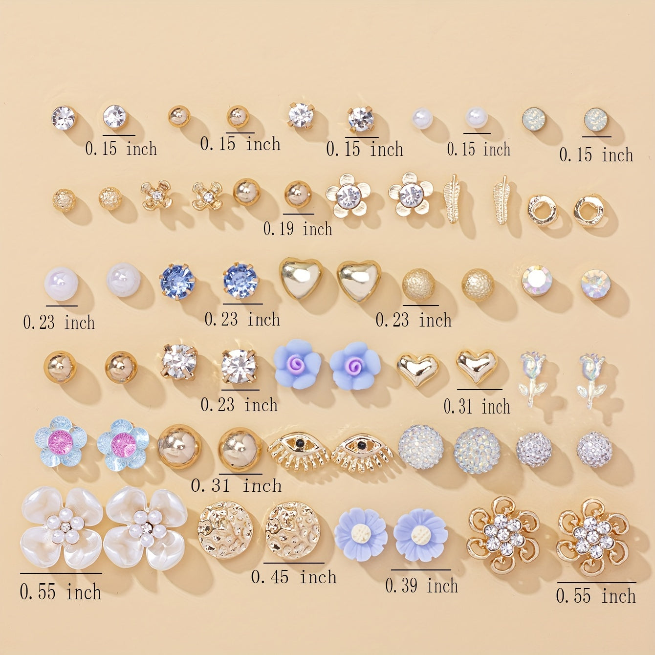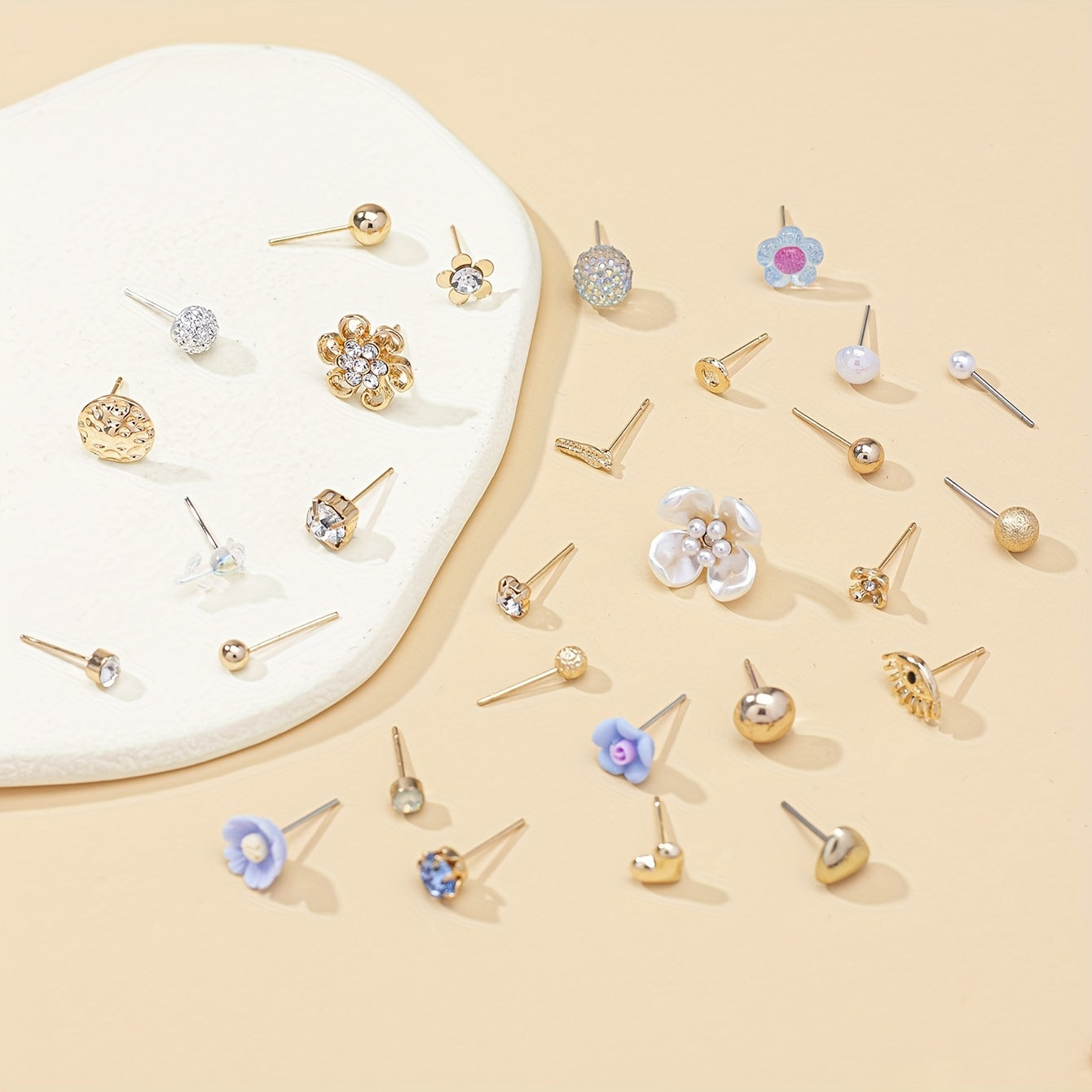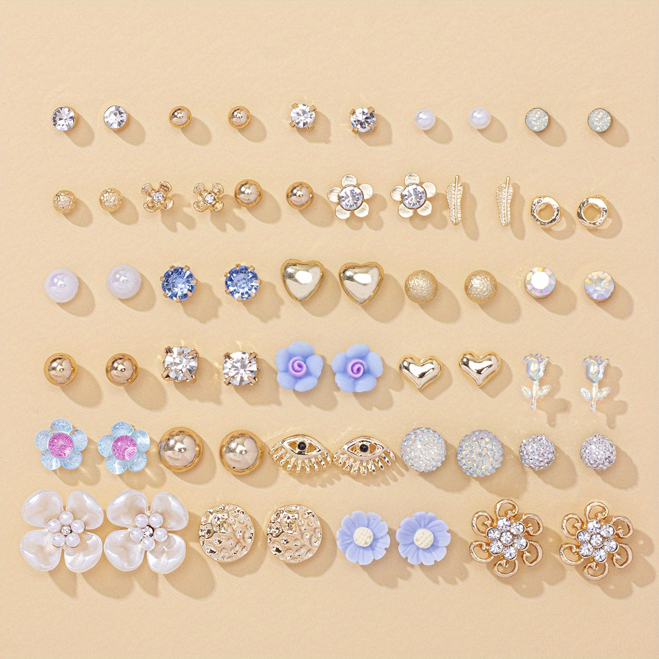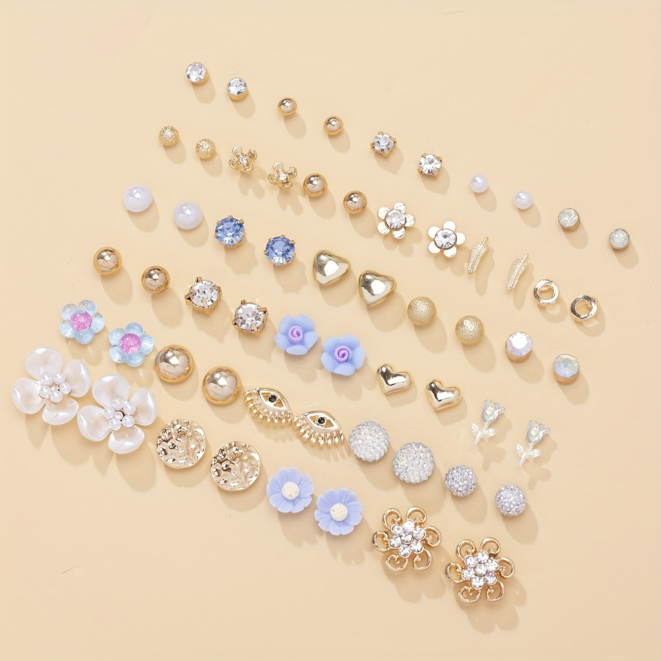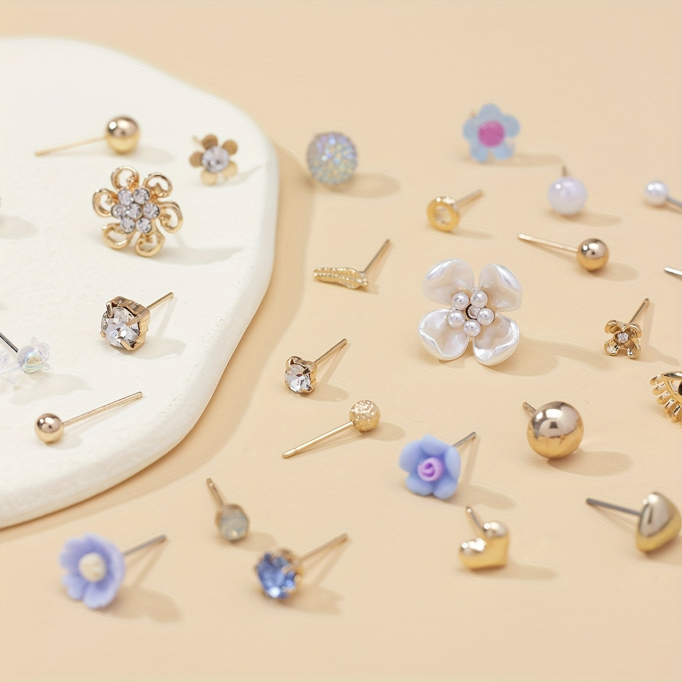 This set includes 30 pairs of stud earrings featuring rose flowers, eyes, stars, love symbols, and leaf designs. Perfect for adding a touch of charm to your outfits.