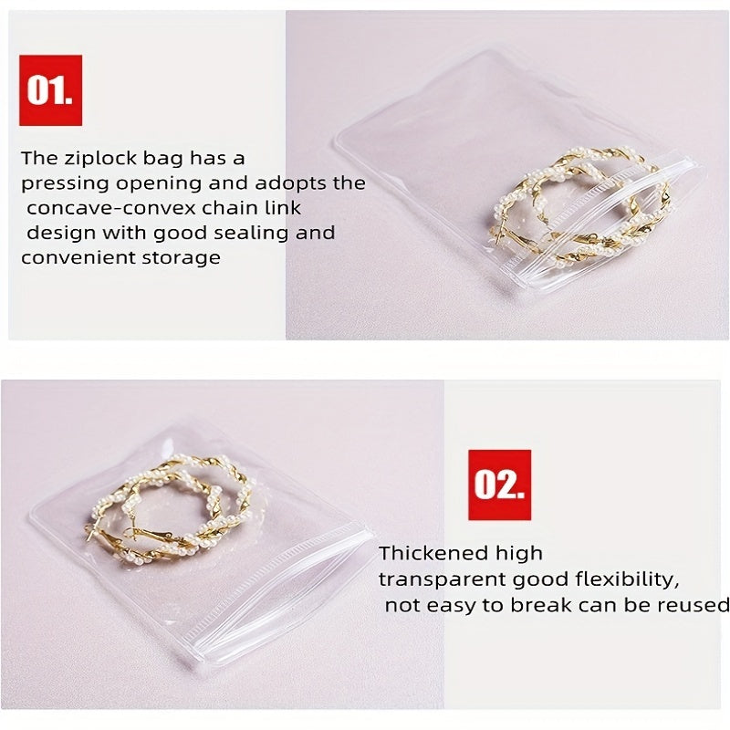 Keep your earrings, studs, and ornaments organized and easily accessible with these transparent PVC bags. Each bag comes with a sealable closure to secure your jewelry items.