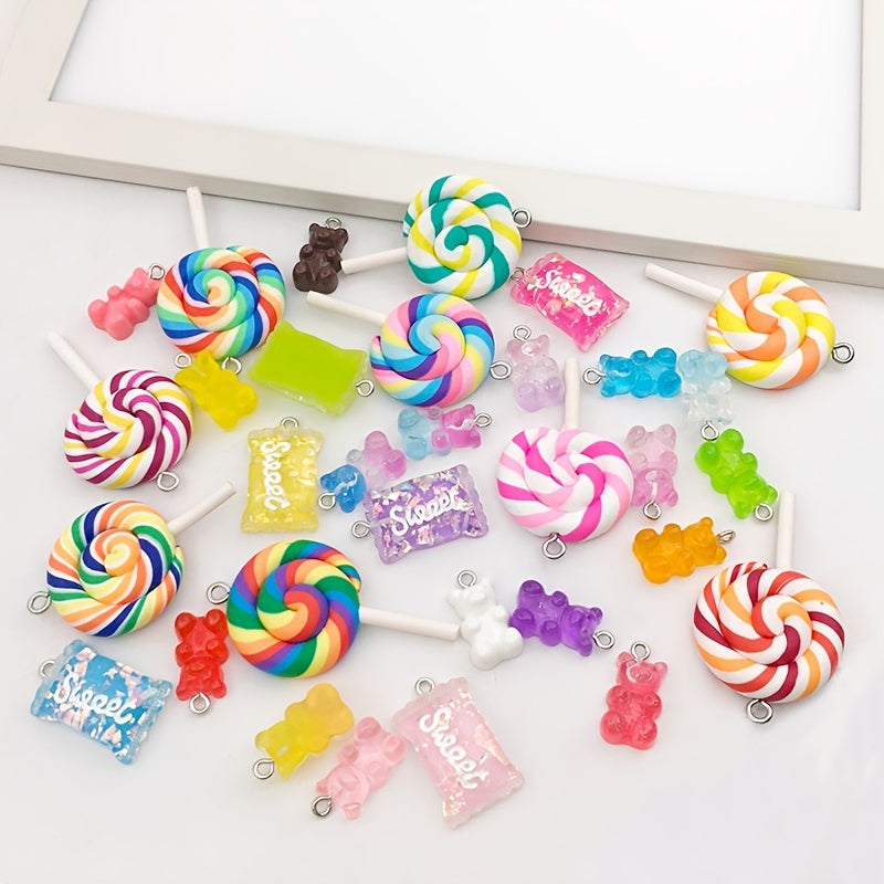 Create your own unique jewelry with these 32 resin charm sets. Perfect for making bracelets and necklaces with cute lollipop and bear designs. Ideal for DIY projects and crafting.