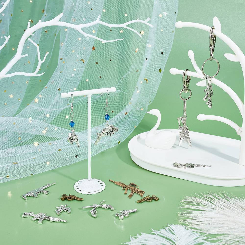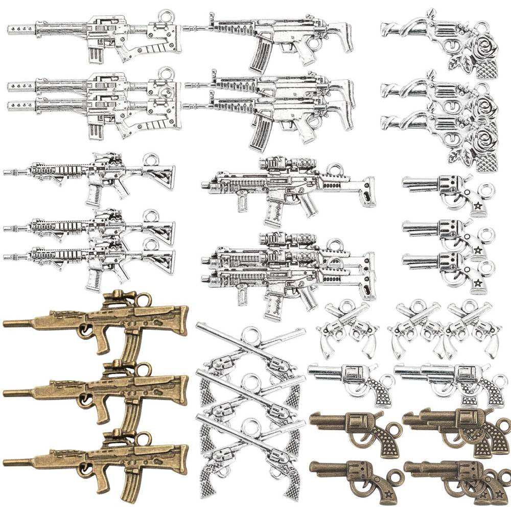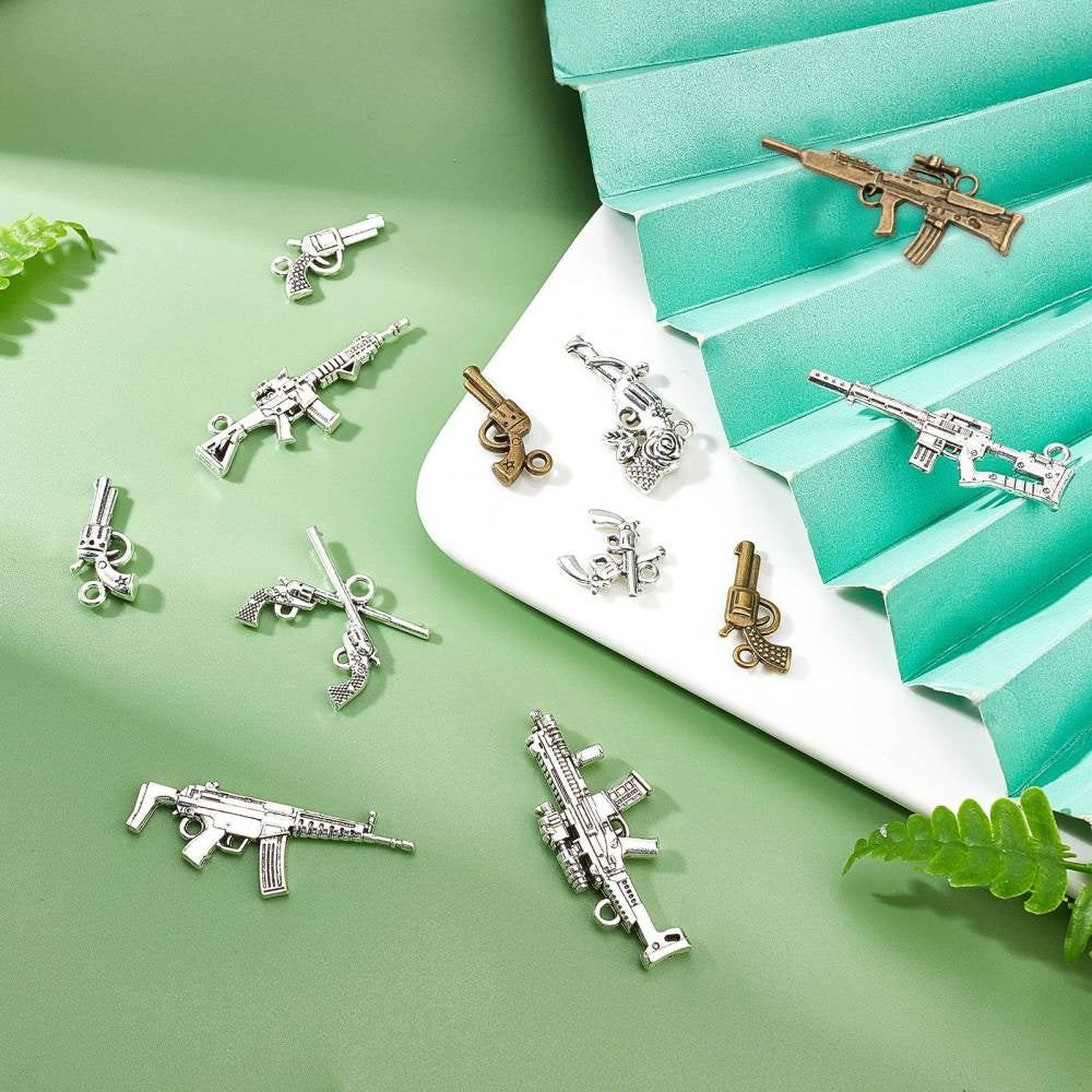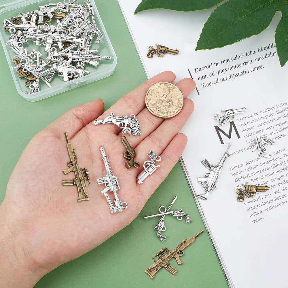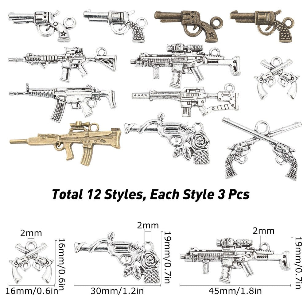 Create unique earrings, bracelets, necklaces, and more with these antique silver or bronze weapon alloy pendants. Each pack includes 36 pendants in 12 different styles, perfect for adding a touch of vintage charm to your accessories.