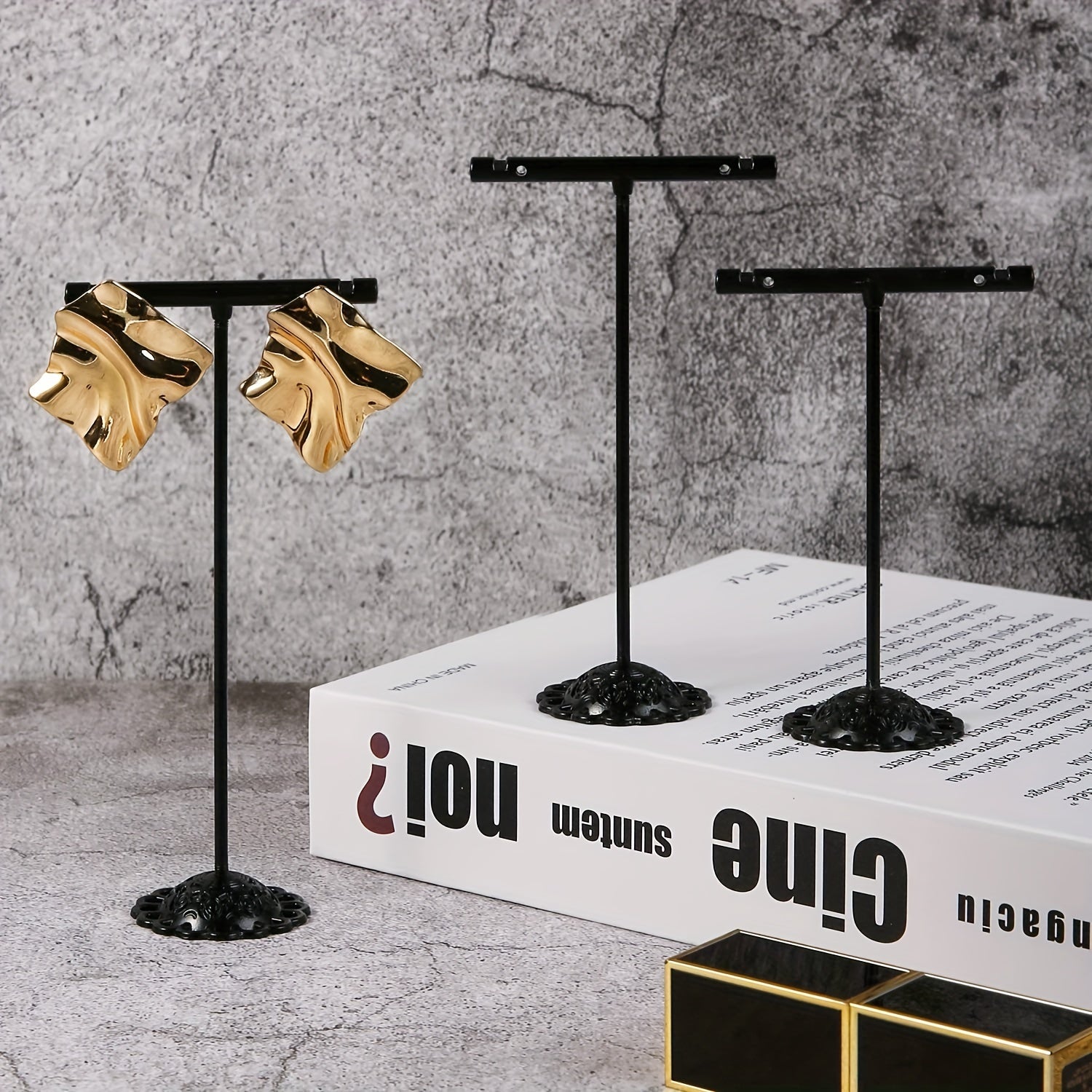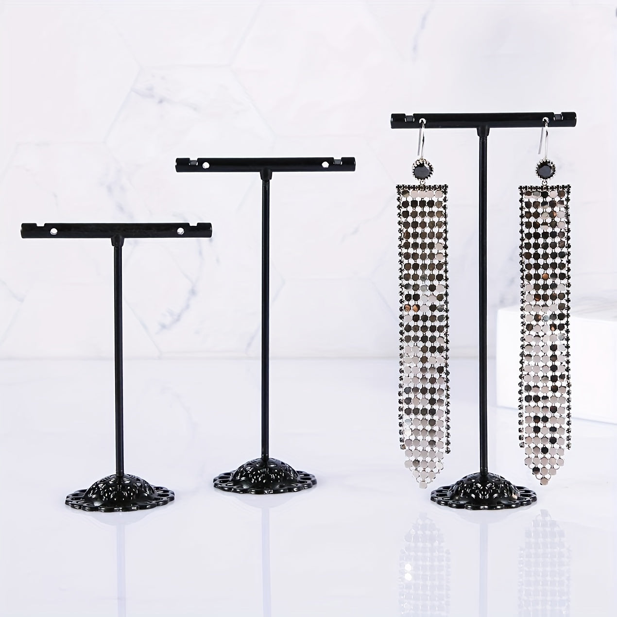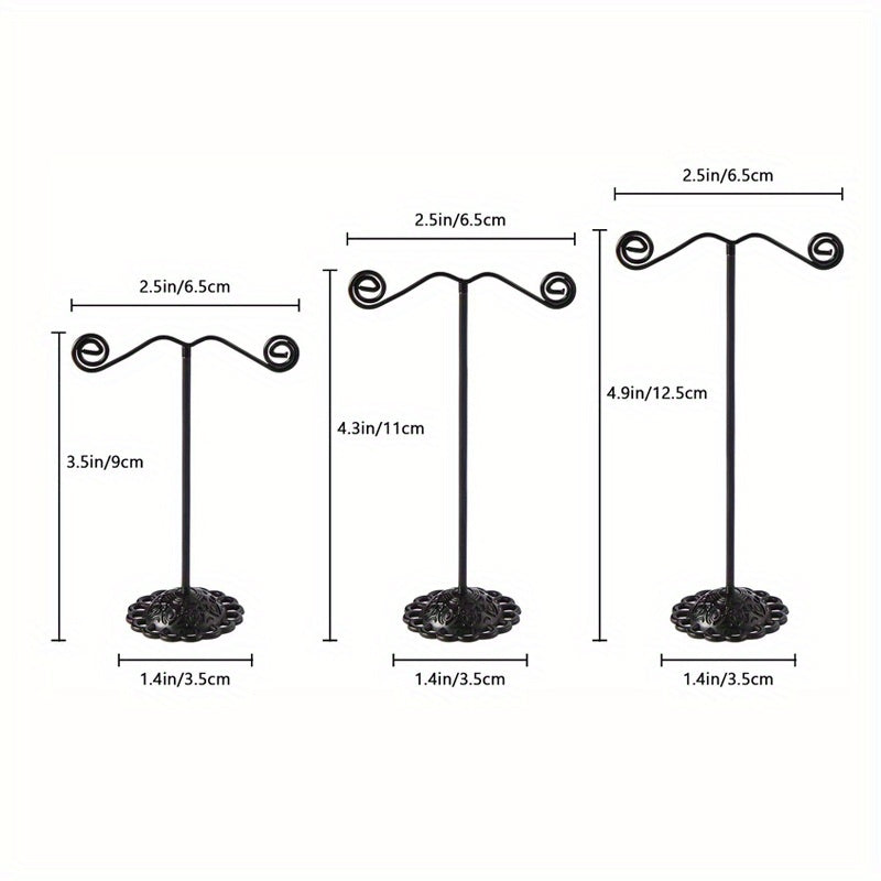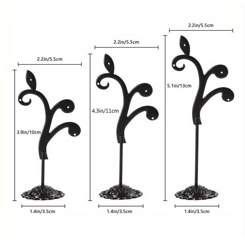 Ideal for photography and retail store display, this 3-piece set includes 7.62-inch, 10.16-inch, and 12-inch metal racks for showcasing earrings.