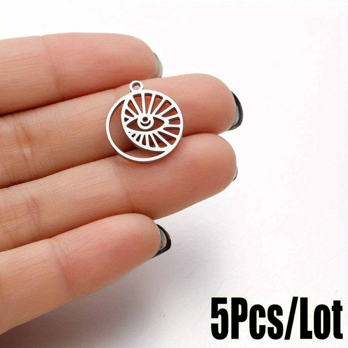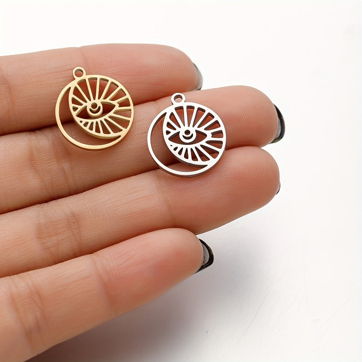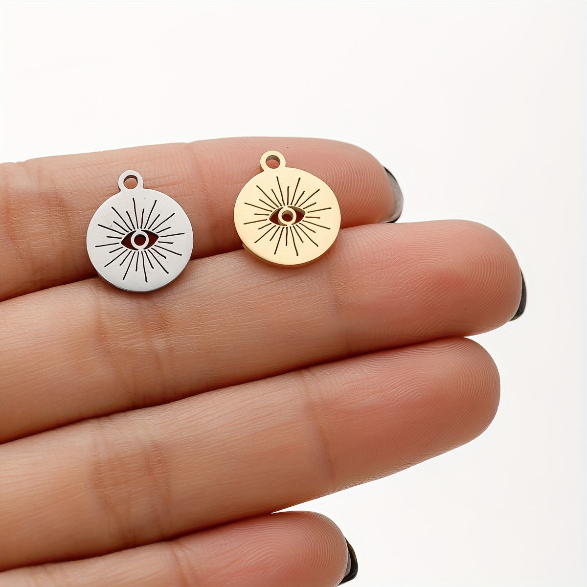 Create stunning earrings, bracelets, necklaces, and more with these stainless steel evil eye charms pendants. Perfect for DIY jewelry enthusiasts.