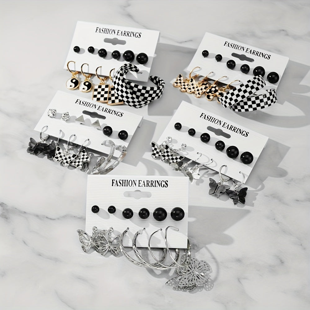 6 Pairs Stud & Dangle Earrings Set Plaid Retro Style Gift