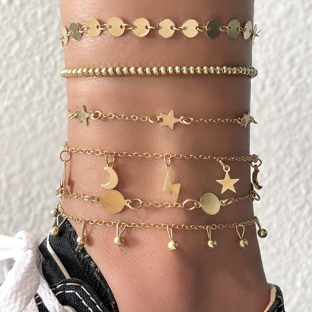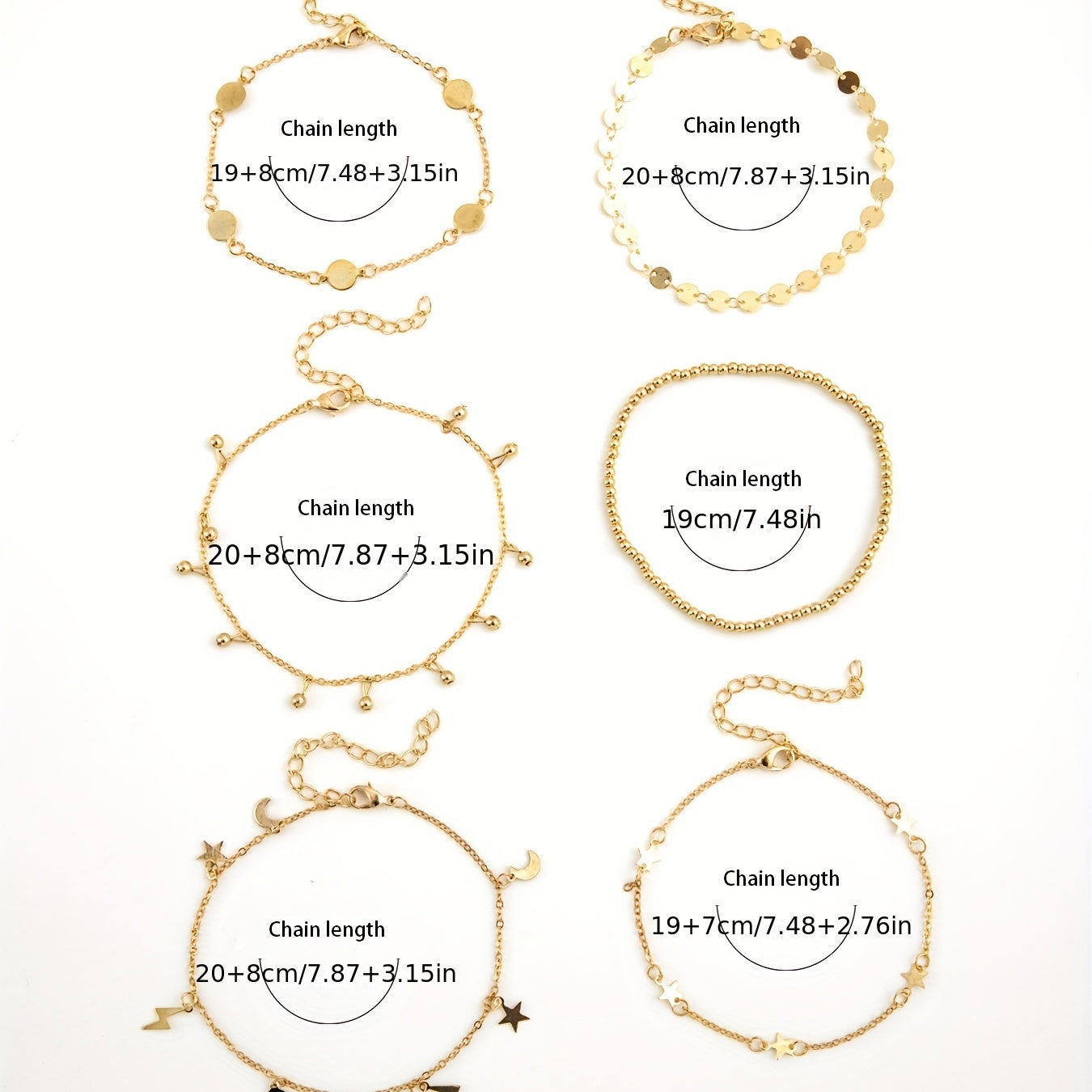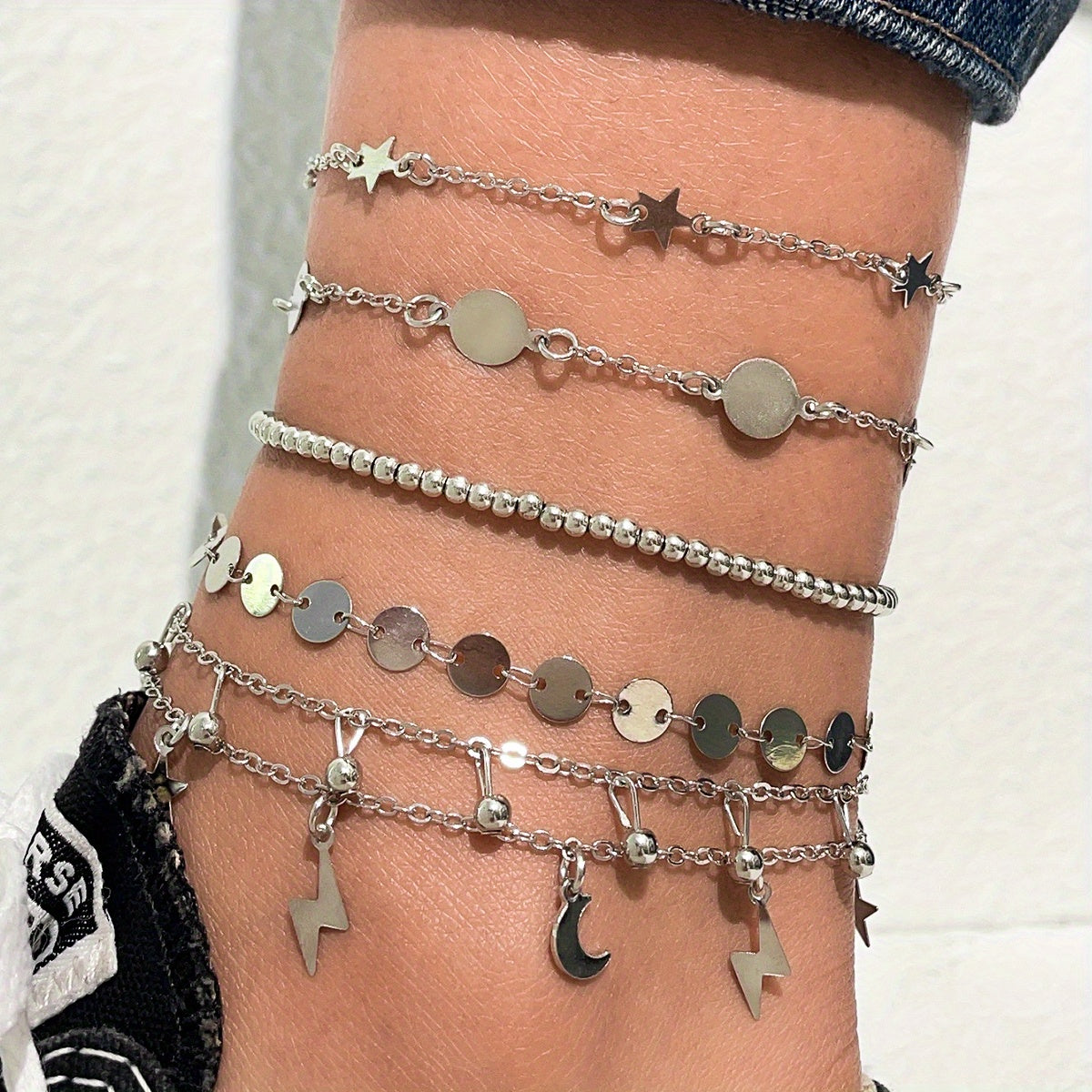 Elevate your style with this set of 6 anklets featuring star, moon, lightning, and other shapes. Perfect for women and girls who love hip hop fashion.