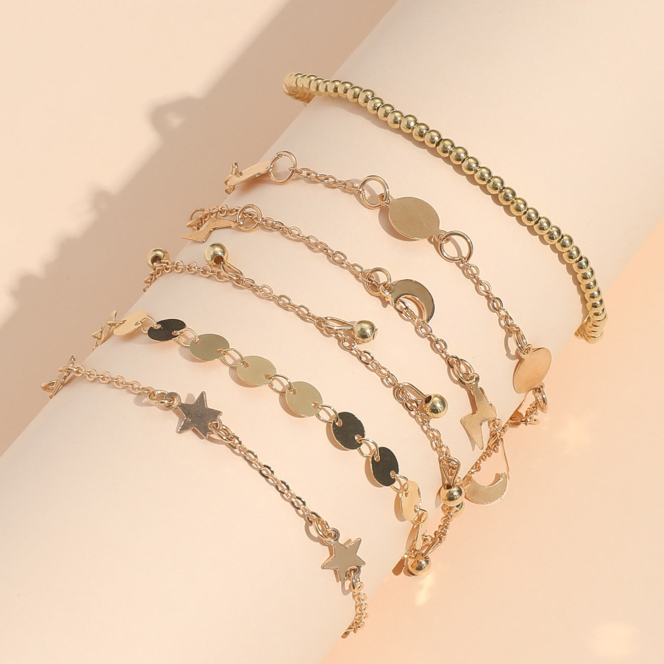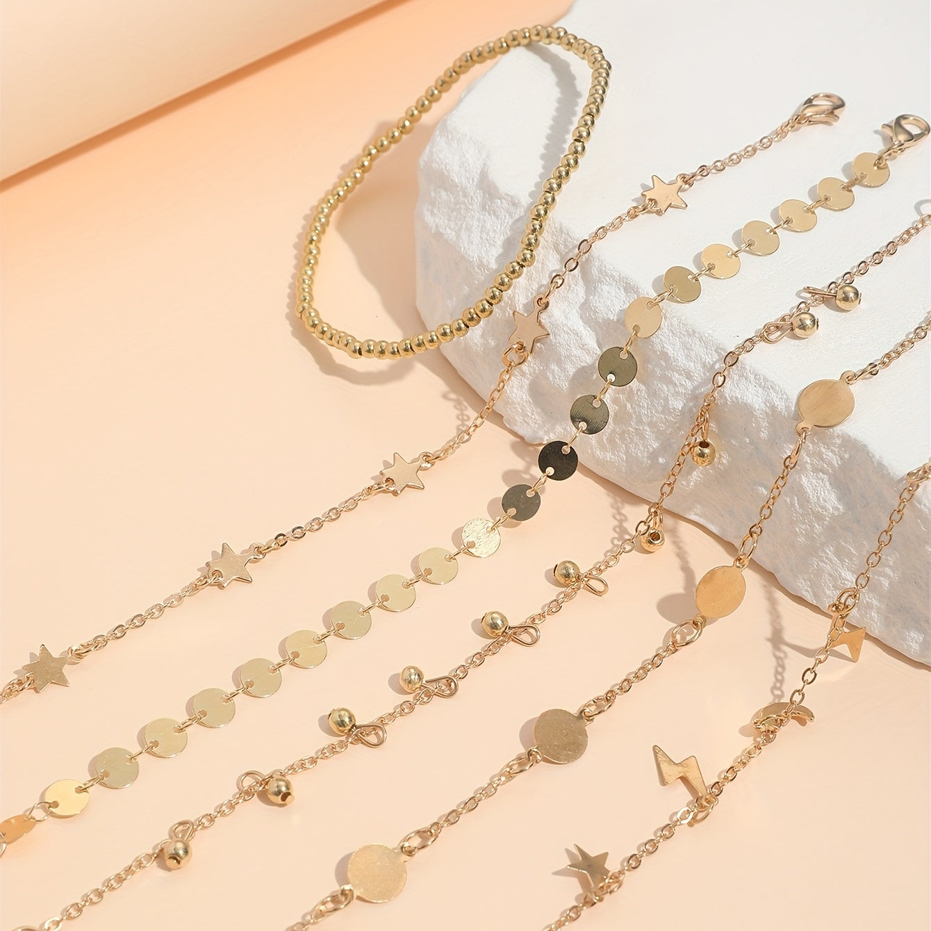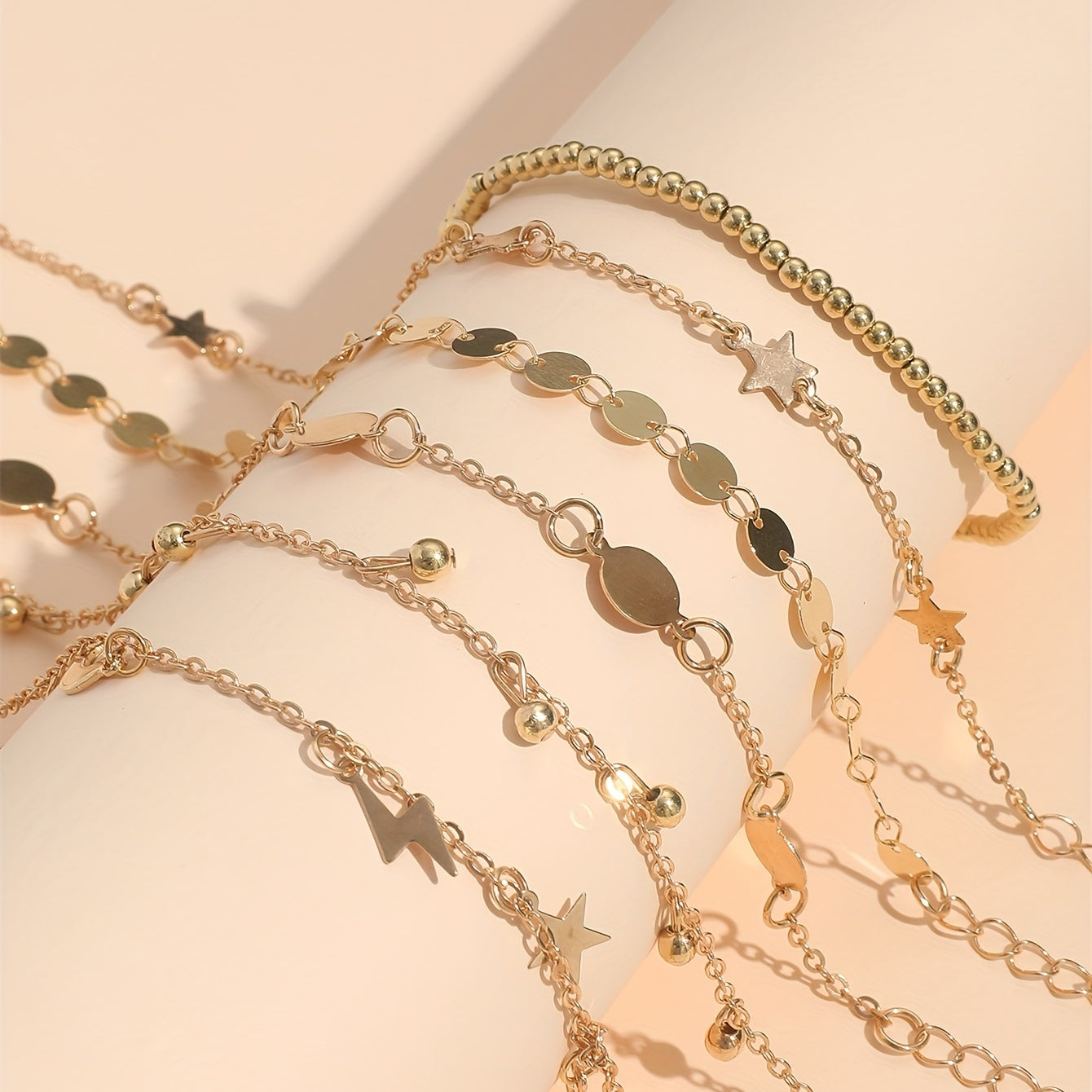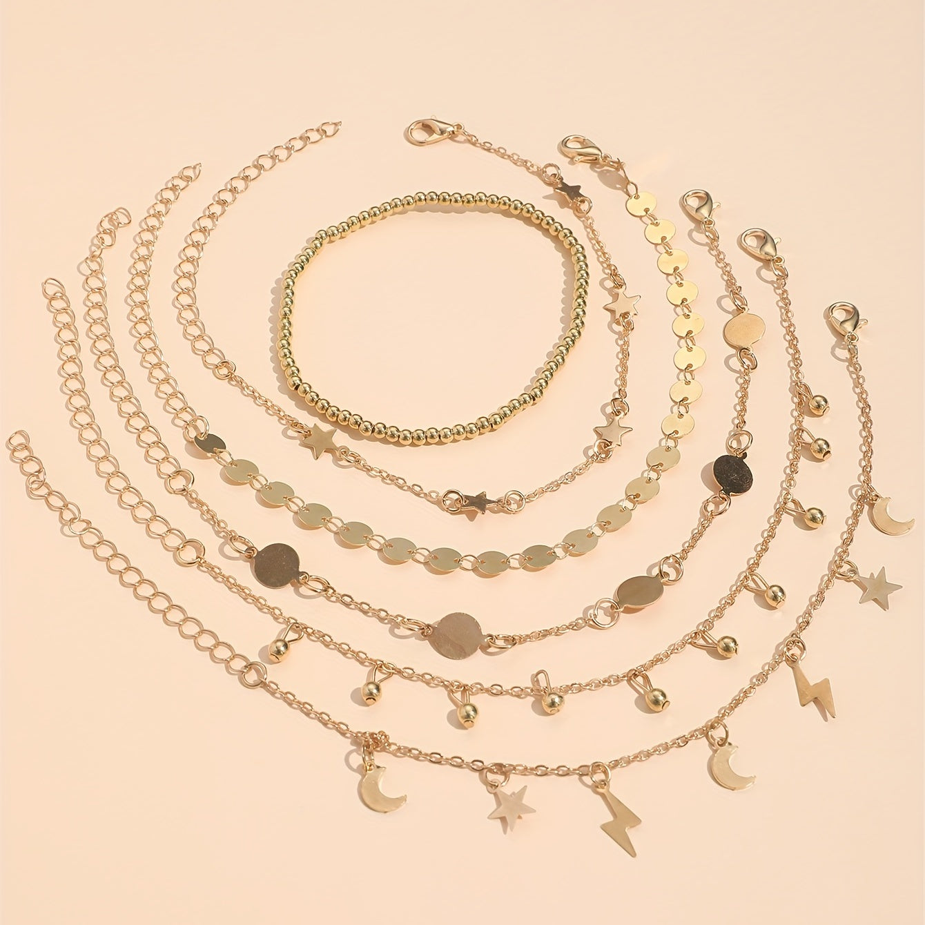 Elevate your style with this set of 6 anklets featuring star, moon, lightning, and other shapes. Perfect for women and girls who love hip hop fashion.