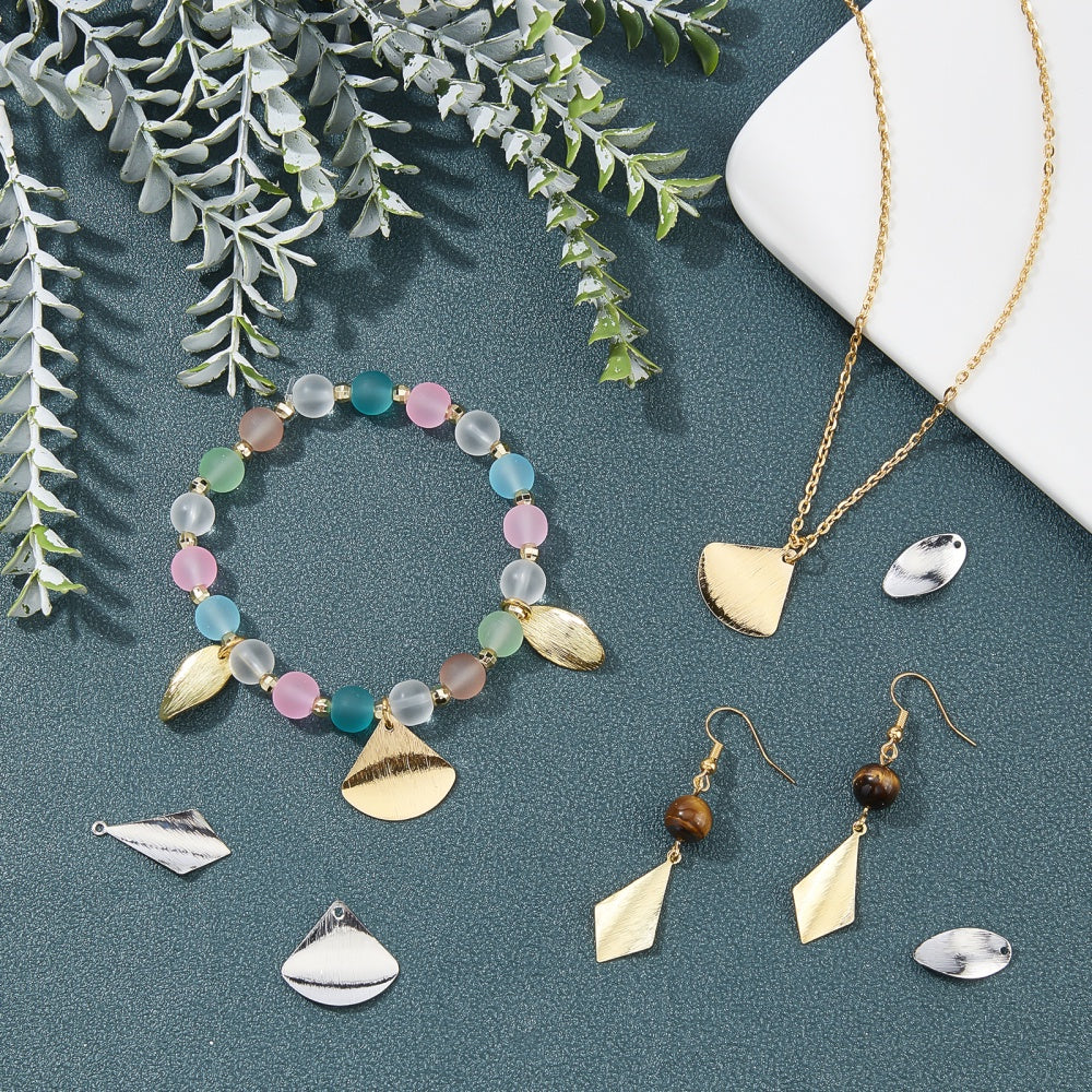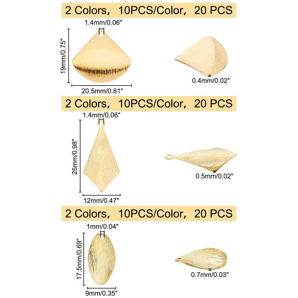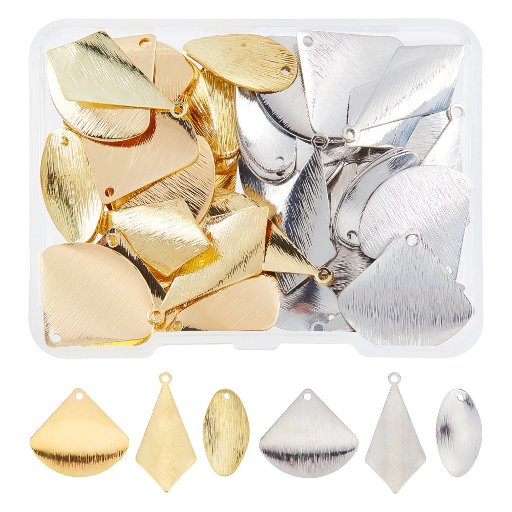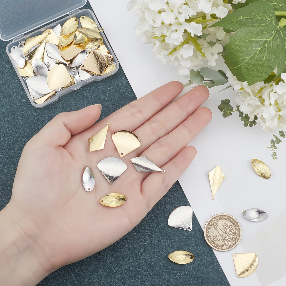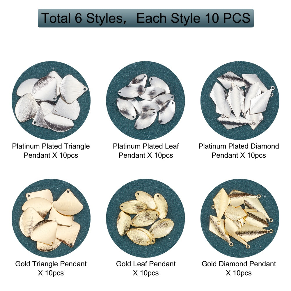 This box contains 60 pieces of brass stamping blanks in 3 different styles - rhombus, triangle, and leaf shape. Perfect for creating unique jewelry pieces.