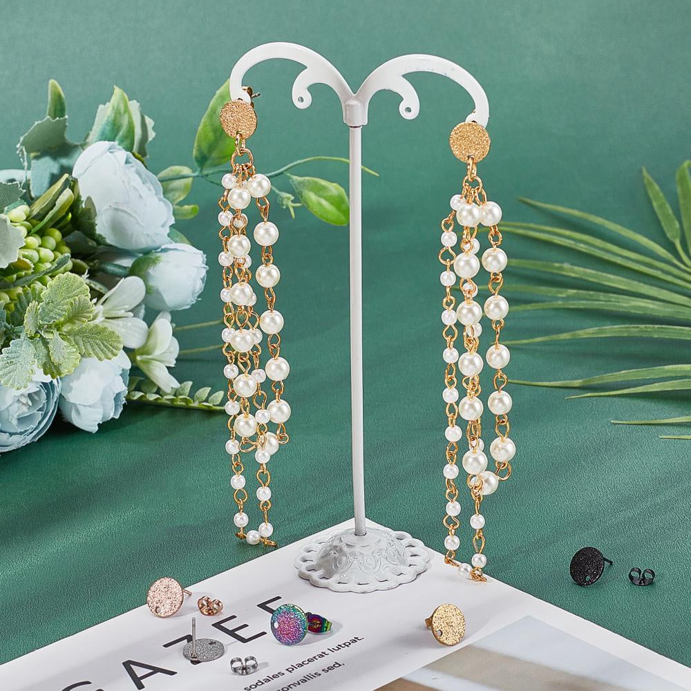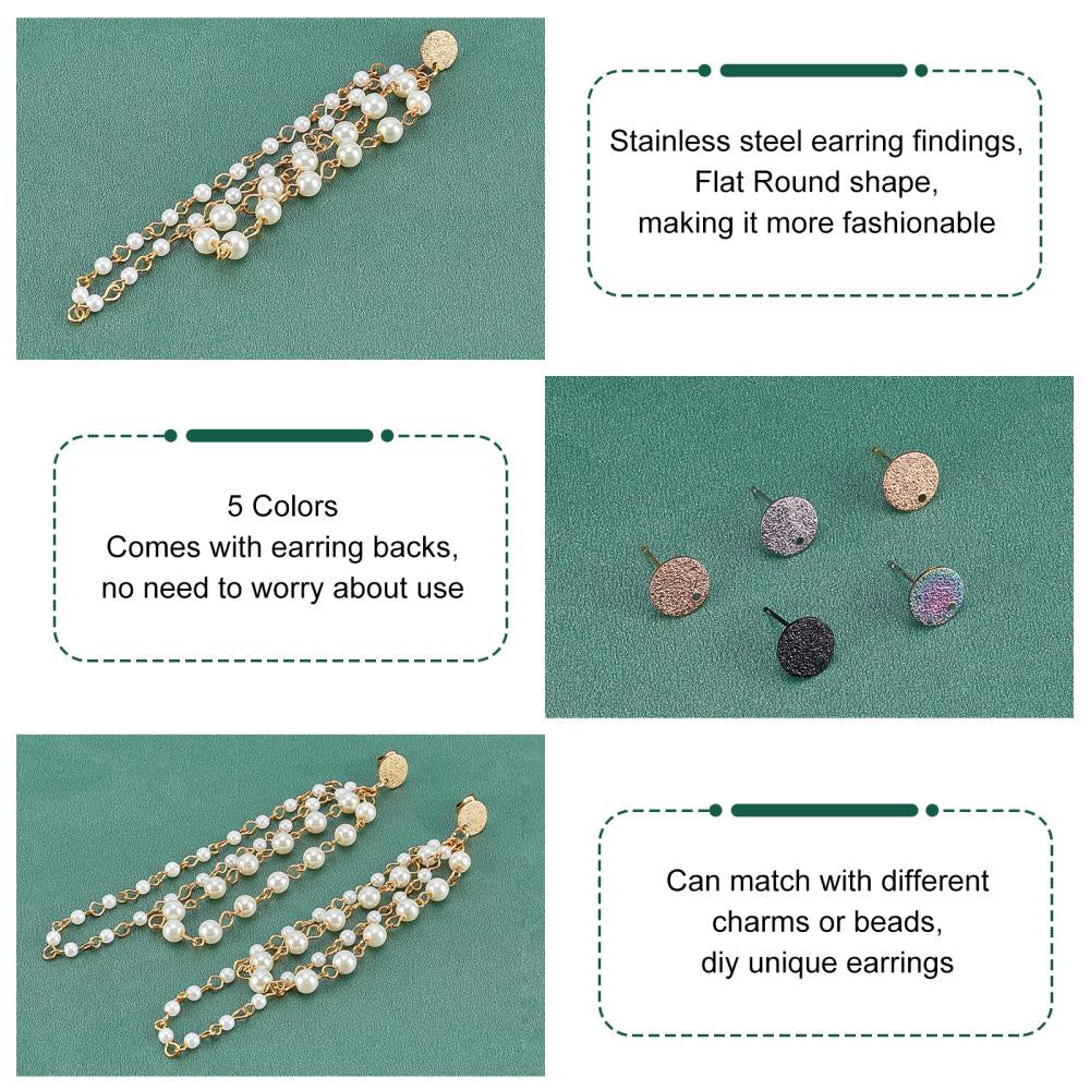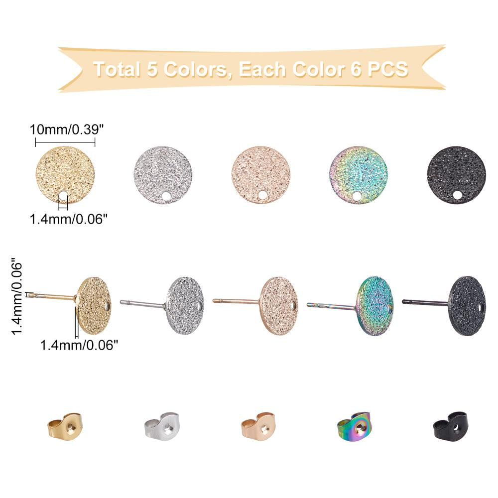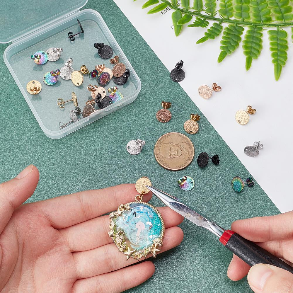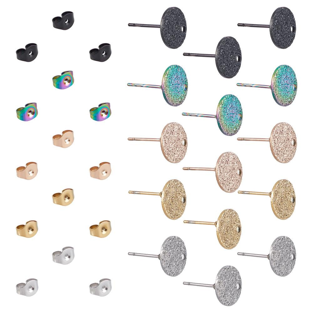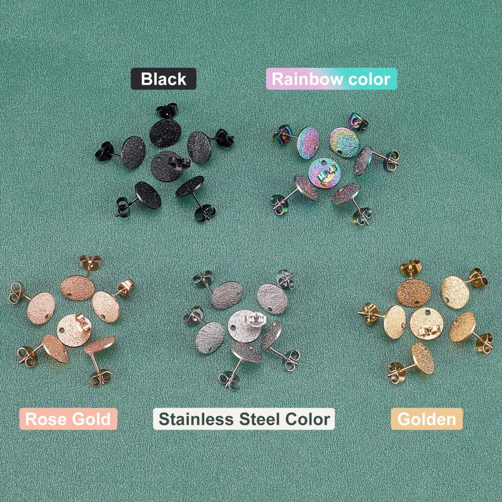 High-quality stainless steel earring findings in 5 colors with ear nuts, earring backs, and loop flat round charms. Each charm has a hole size of 1mm and a pin size of 0.8mm.