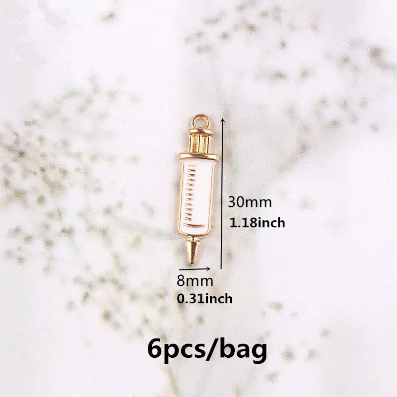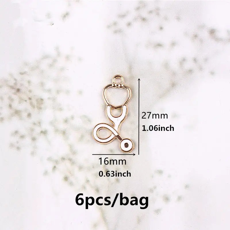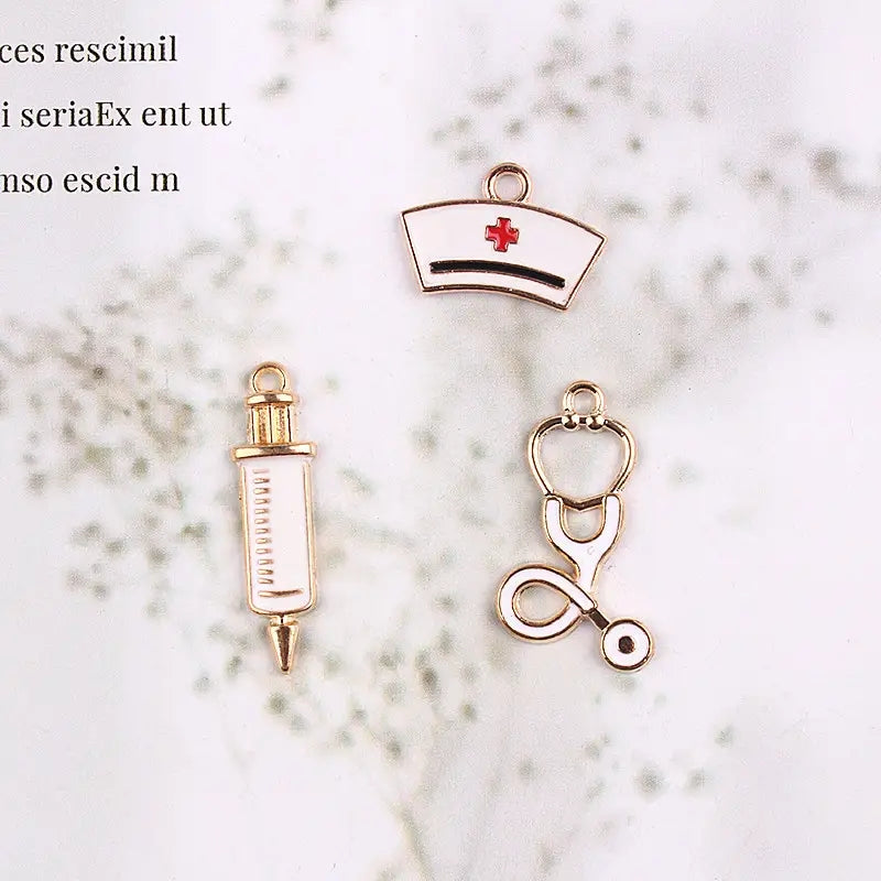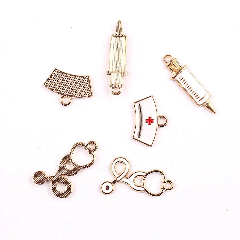 This set includes 6 adorable nurse-themed enamel pendants in the shape of a syringe, stethoscope, and nurse cap. Perfect for creating your own unique earrings, bracelets, necklaces, and other accessories.