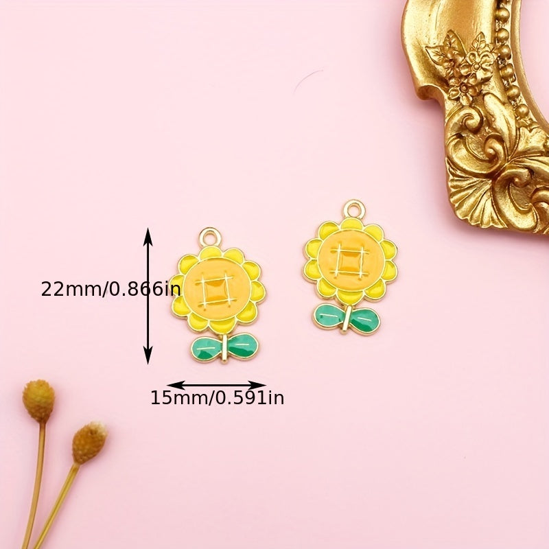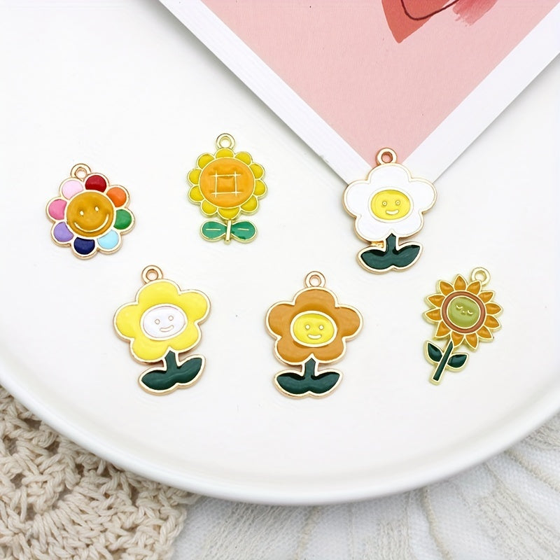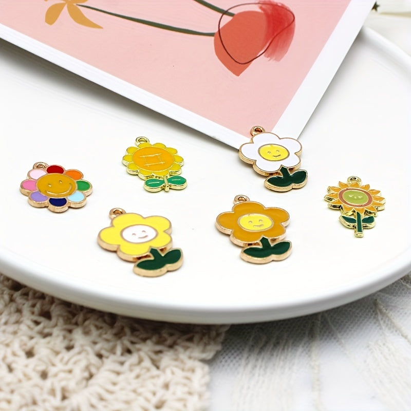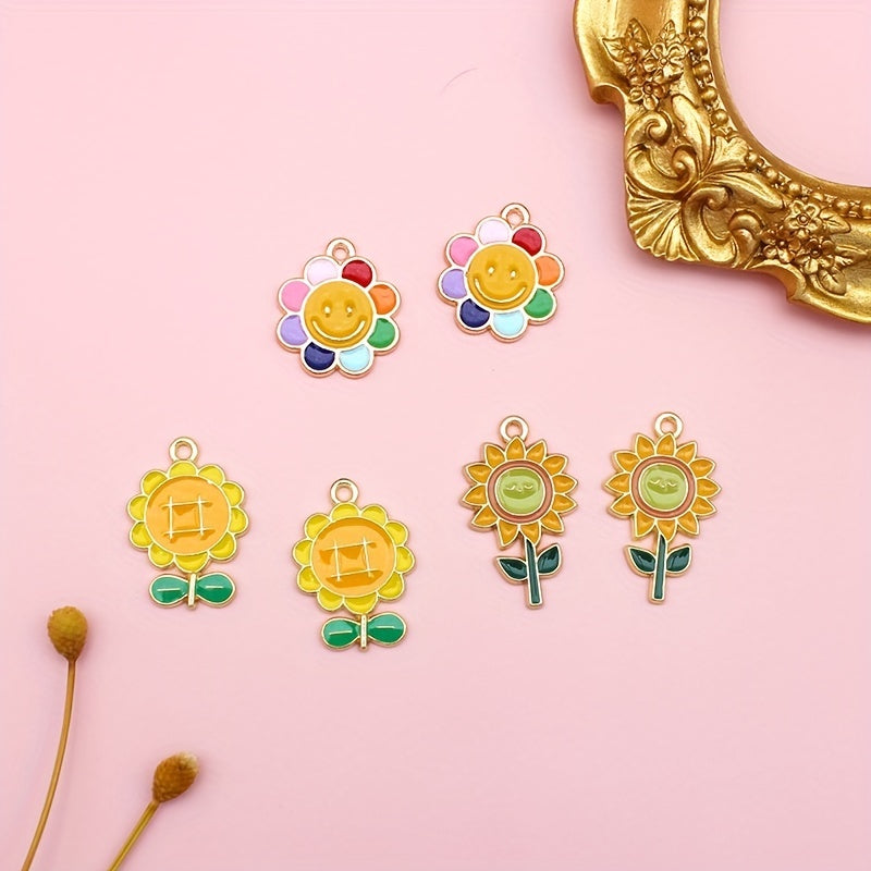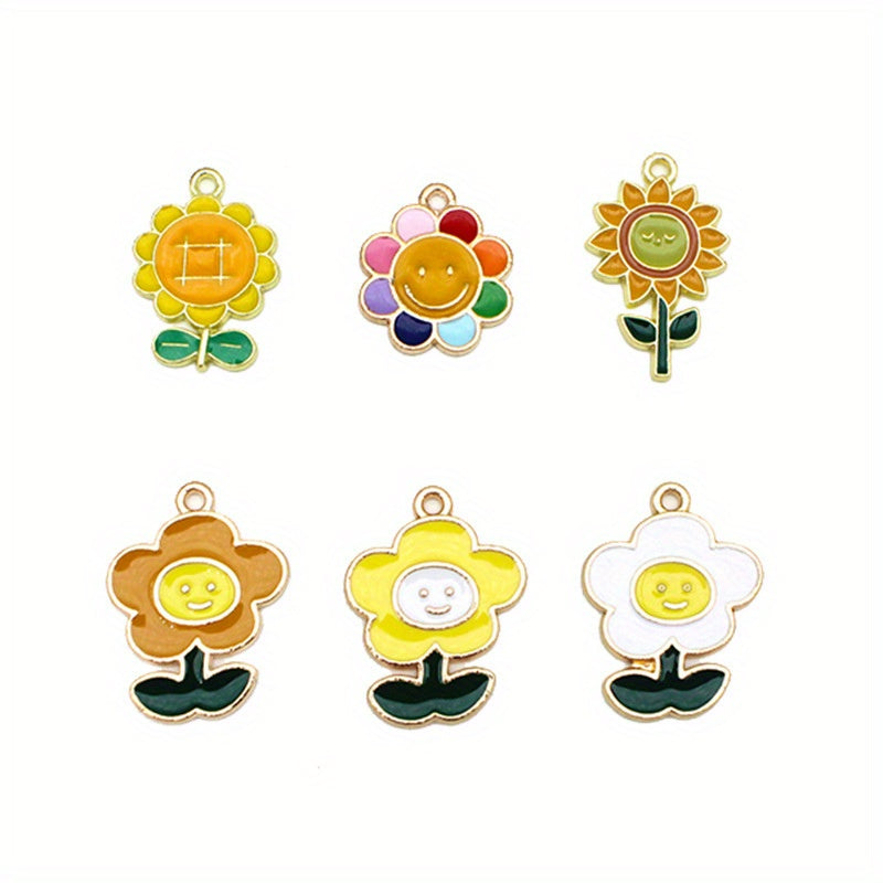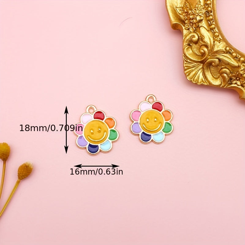 Create cheerful jewelry with this set of 6 colorful rainbow happy face sunflower enamel alloy pendants. Perfect for earrings, bracelets, and necklaces.
