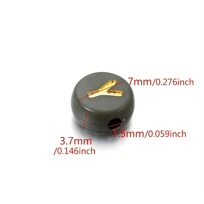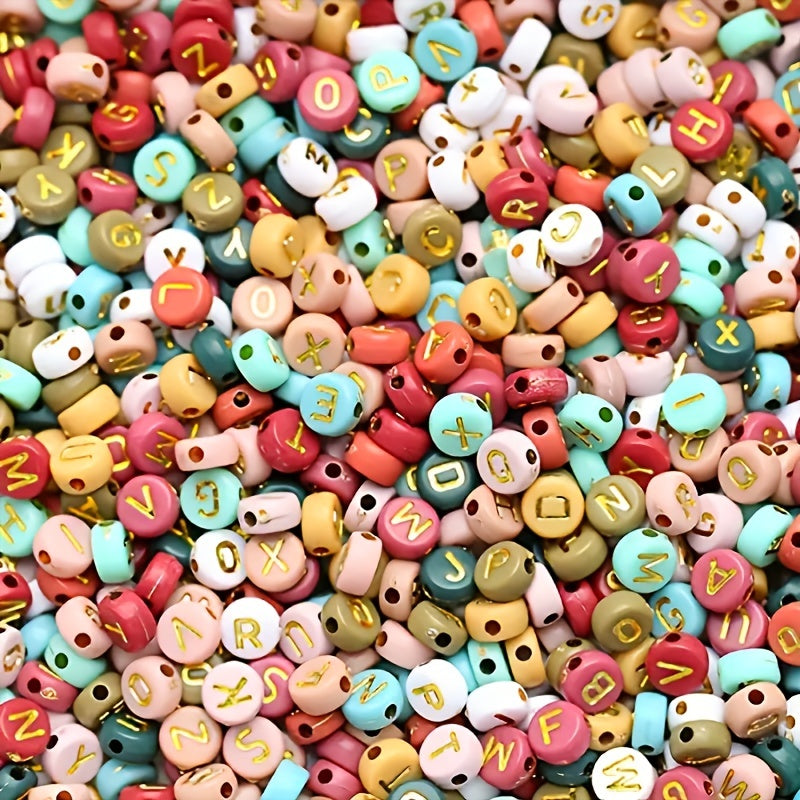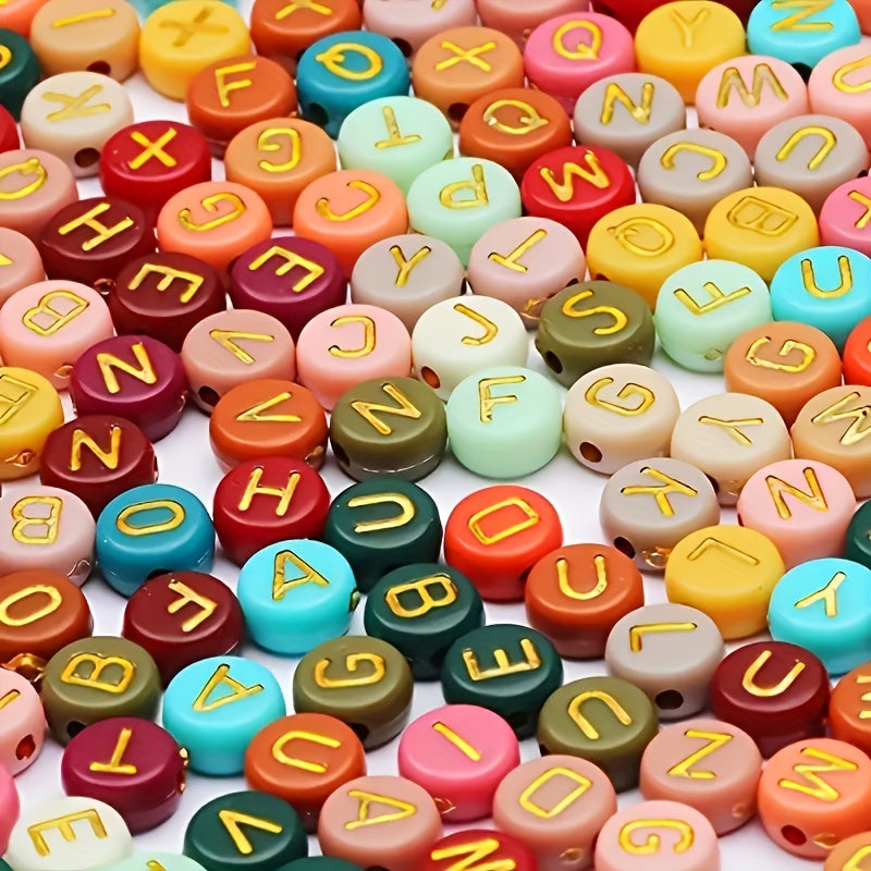 These colorful acrylic beads are perfect for creating earrings, bracelets, necklaces, and other accessories. Each bead features a golden letters pattern on a flat round shape.