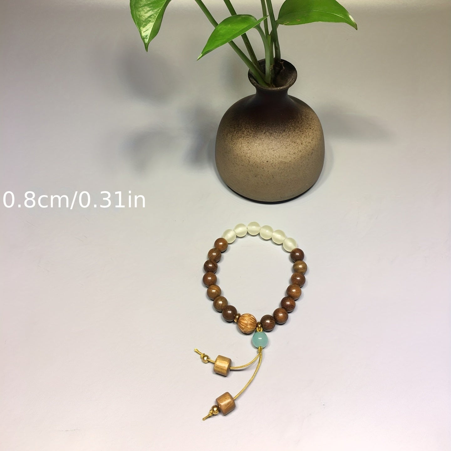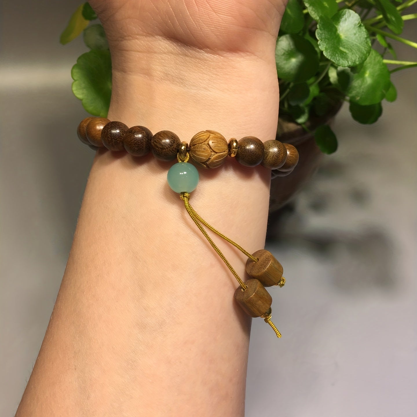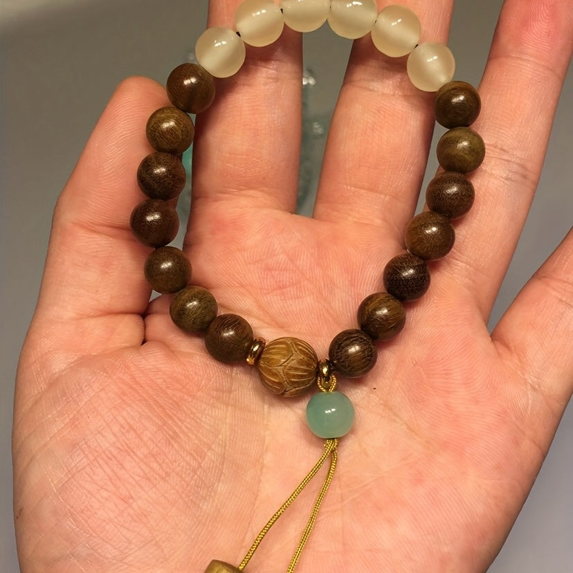 This stretchable bracelet features natural green sandalwood beads that promote healing and good luck energy. It also includes chakra stones for balance and positivity. Perfect for prayer and meditation.