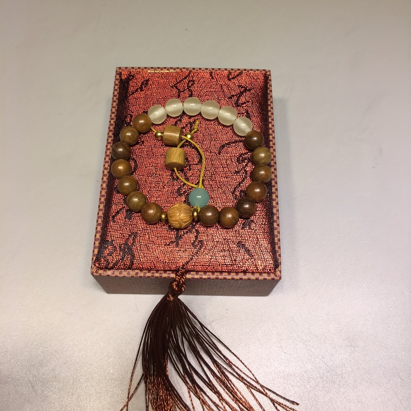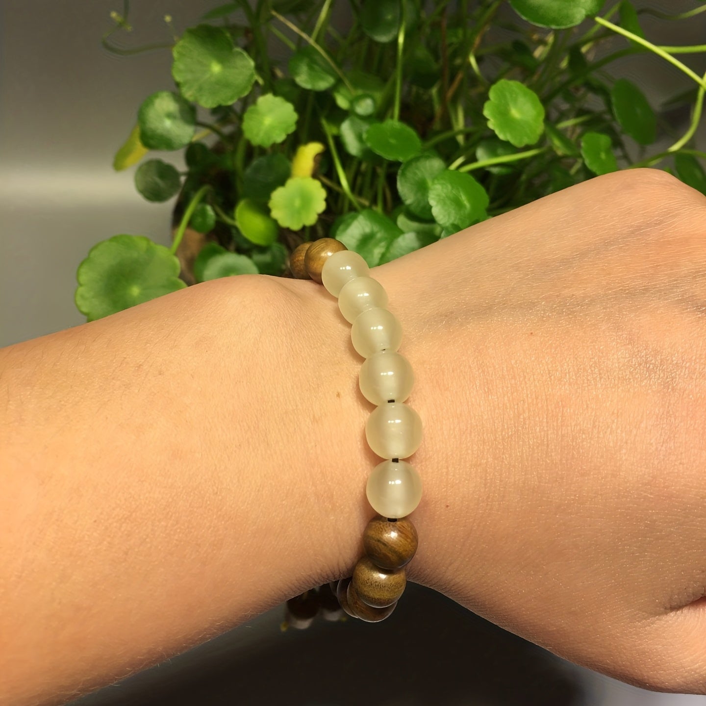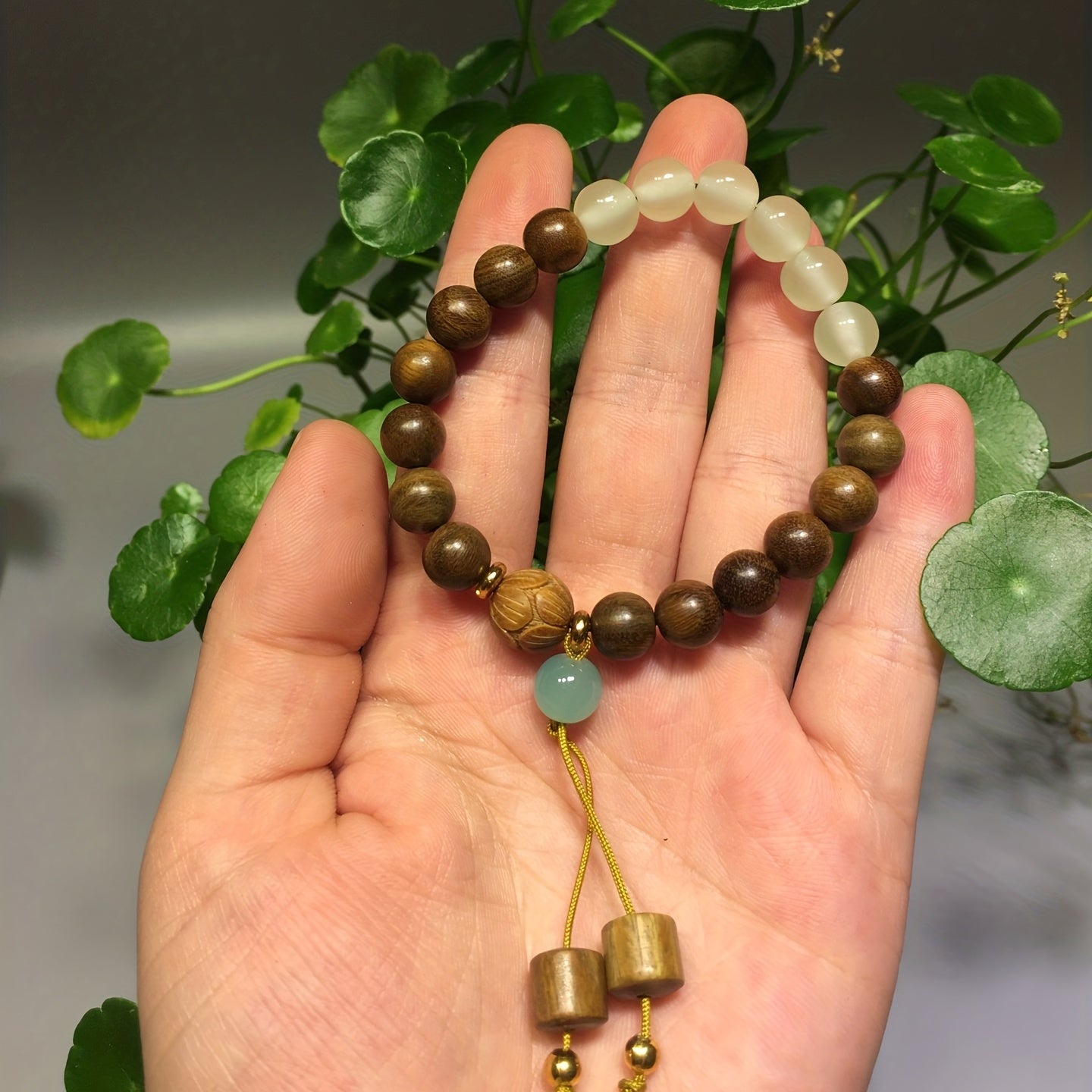This stretchable bracelet features natural green sandalwood beads that promote healing and good luck energy. It also includes chakra stones for balance and positivity. Perfect for prayer and meditation.