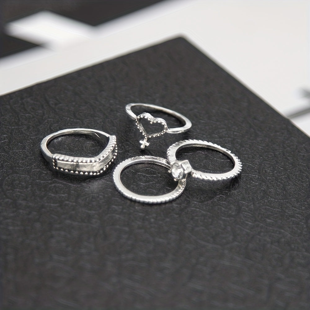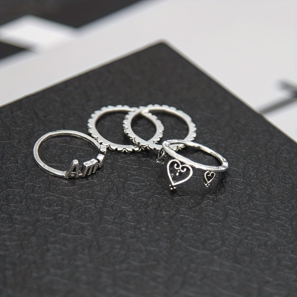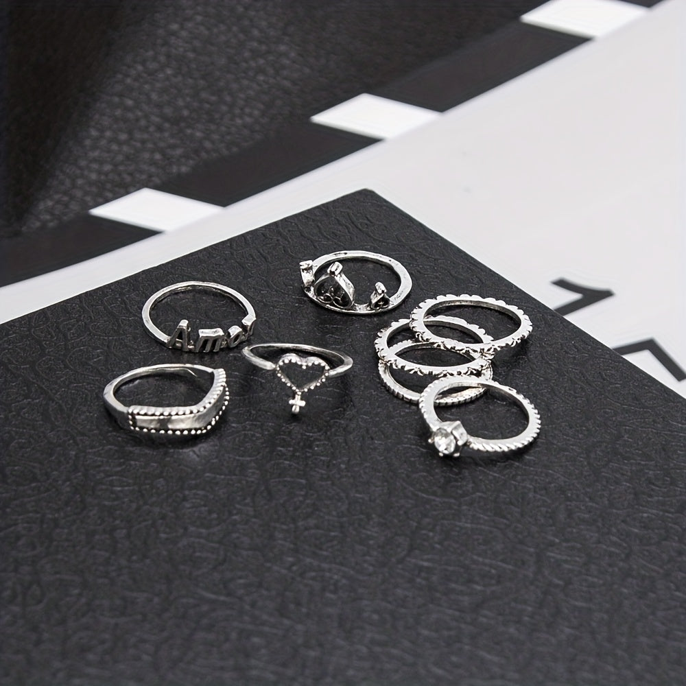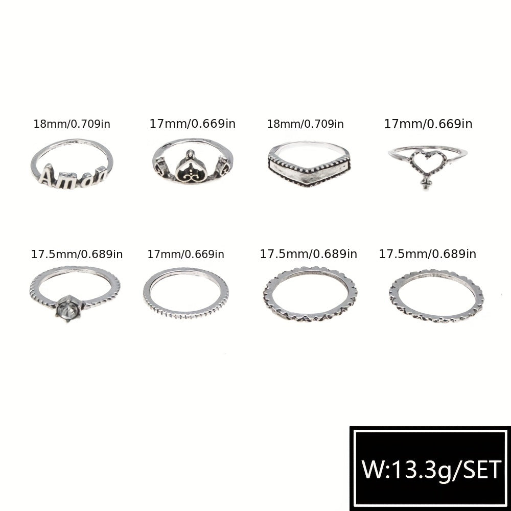 Add a touch of boho chic to your look with this set of 8 stacking rings featuring V shape, heart, and cross patterns. Perfect for daily wear or parties, these rings can be mixed and matched to create your own unique style.