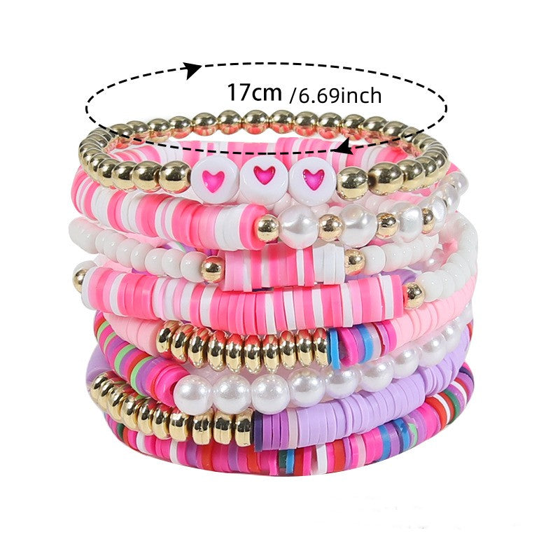 Adorn your outfit with this set of 8 pink faux pearl bracelets. Perfect for a Y2K-inspired look, these soft pottery beads are stackable for a trendy style.