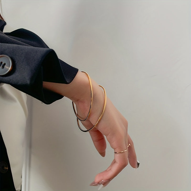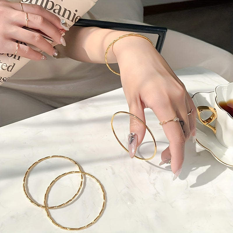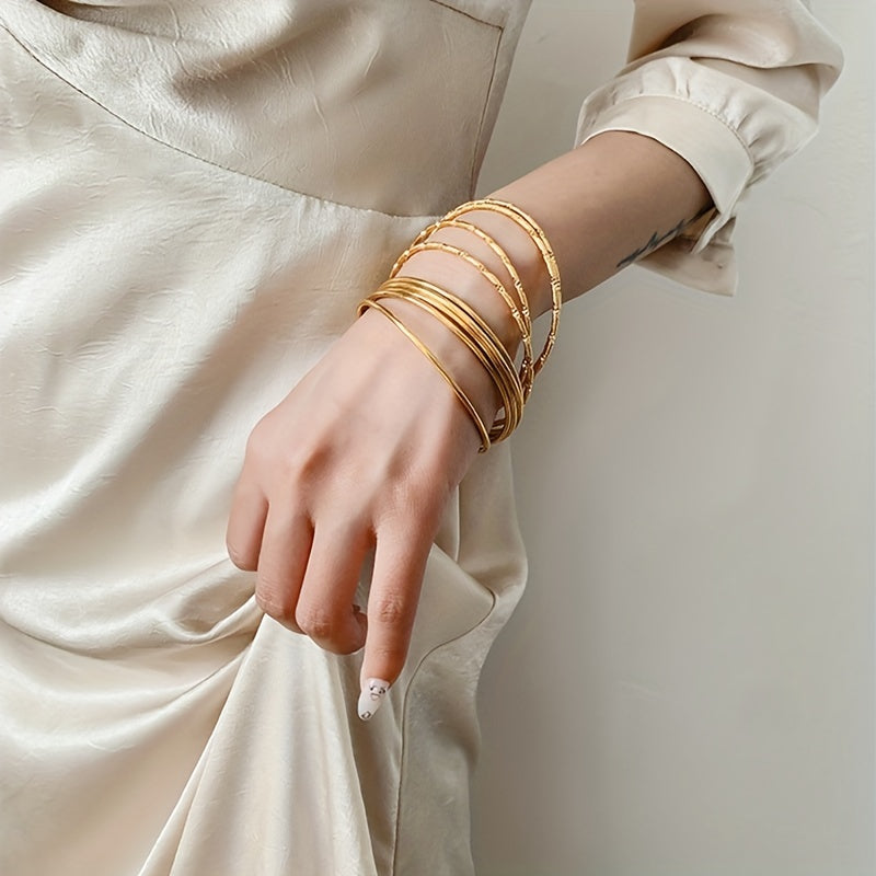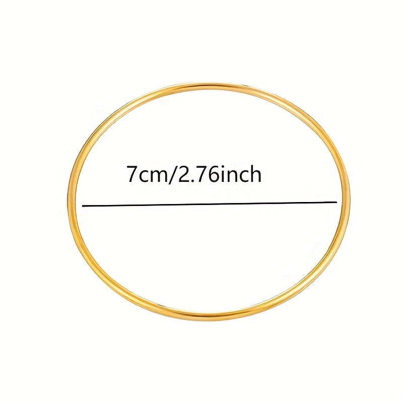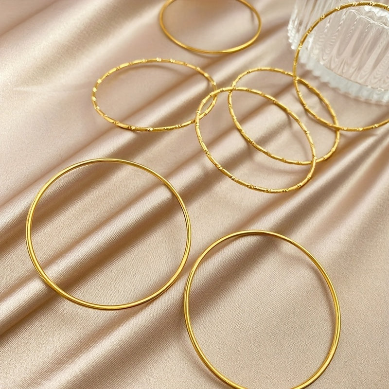 This set includes 8 round shape bangle bracelets made of durable alloy. Perfect for a delicate and minimalist look. Great as a gift for someone special.