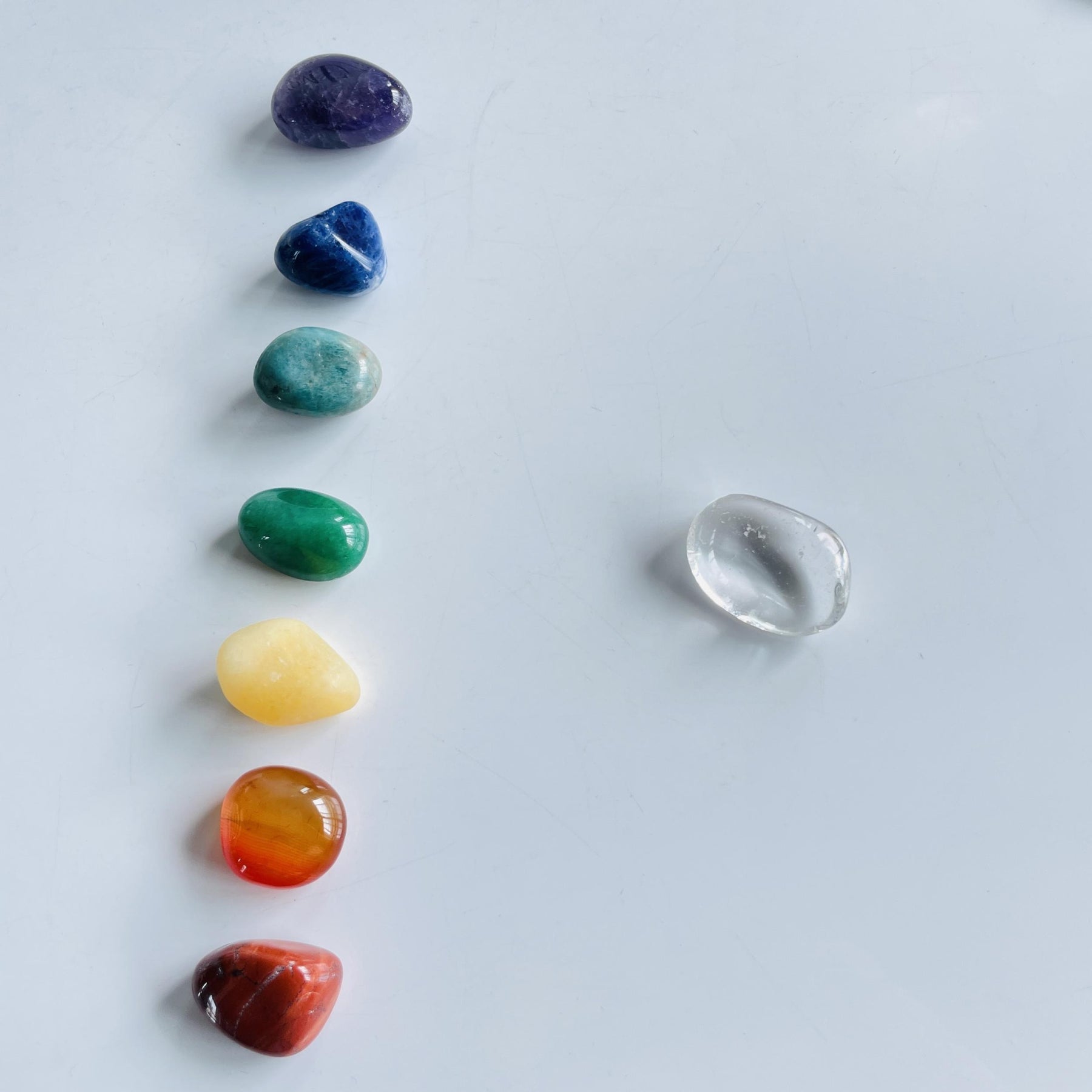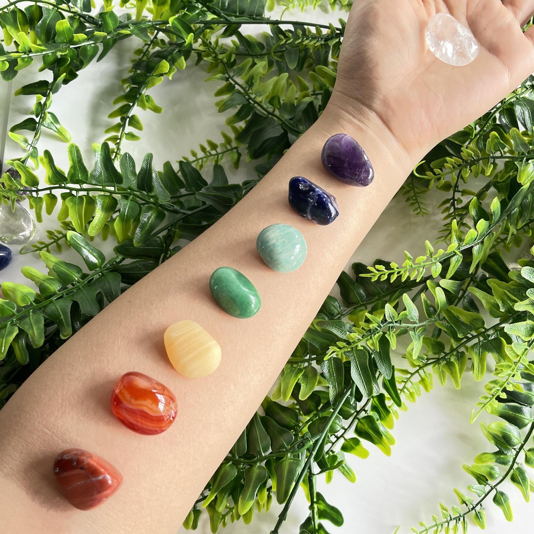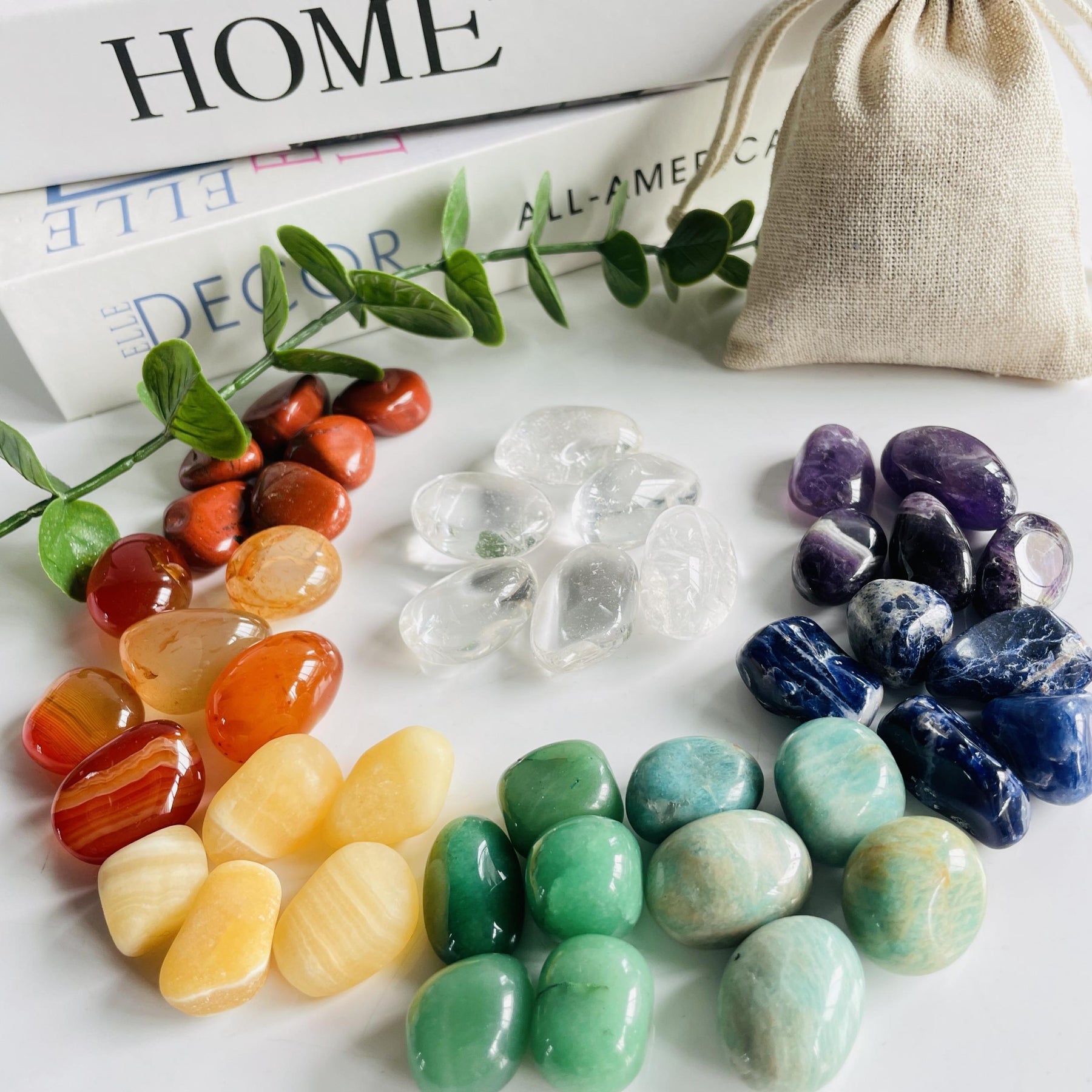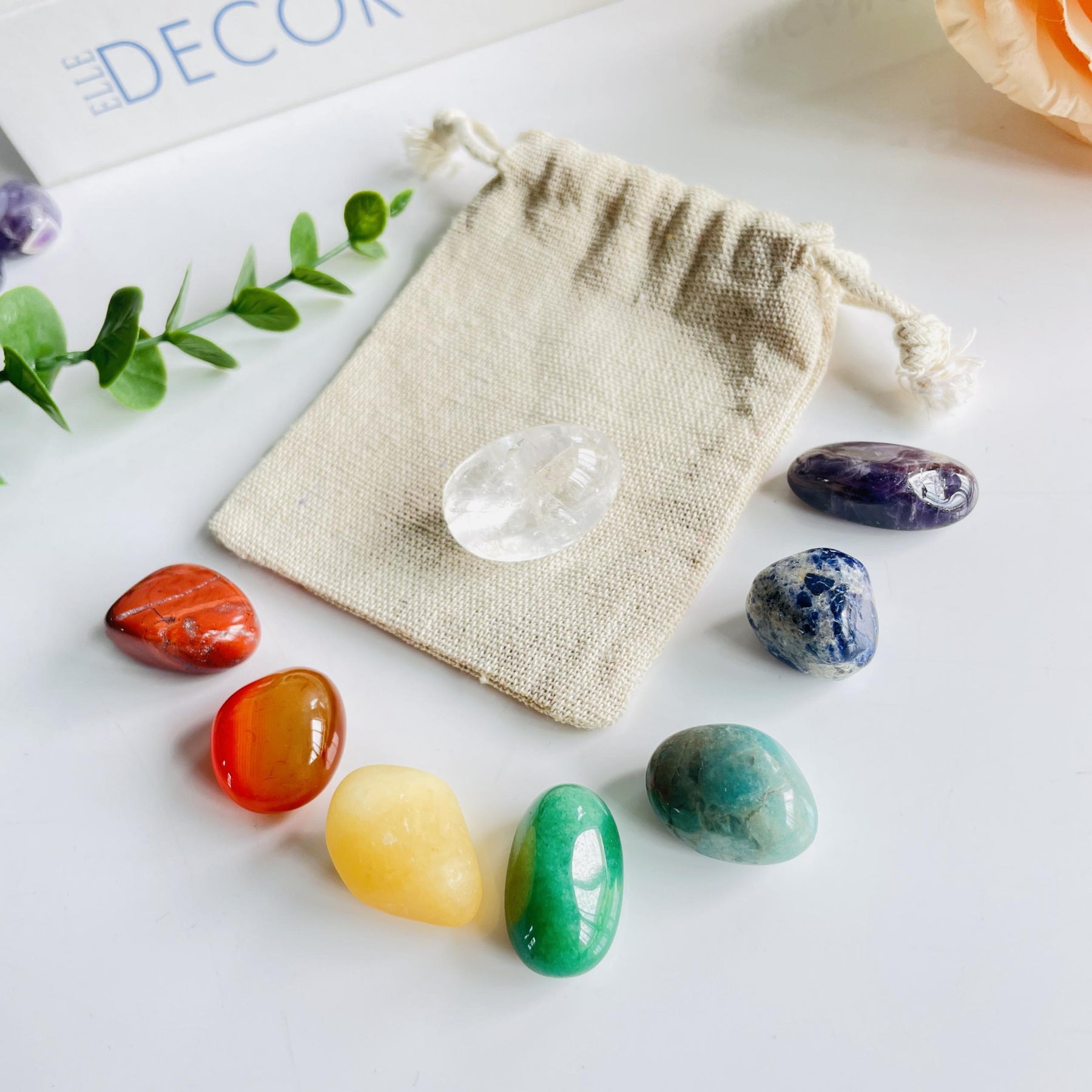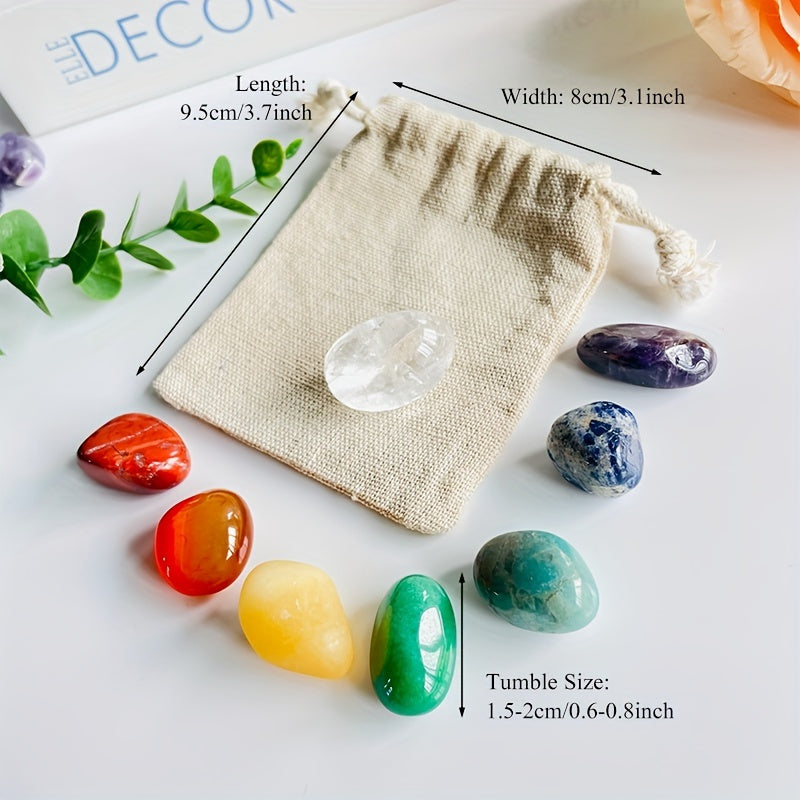 Bring balance and strength to your energy with this set of 8 tumble gemstones in a convenient linen drawstring bag. Each crystal is meant to purify and energize, making it ideal for daily use.