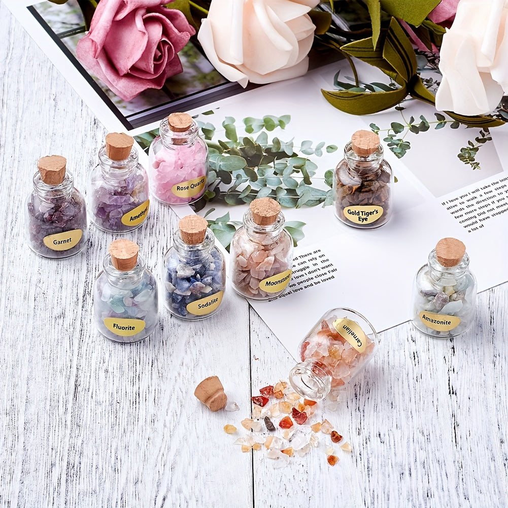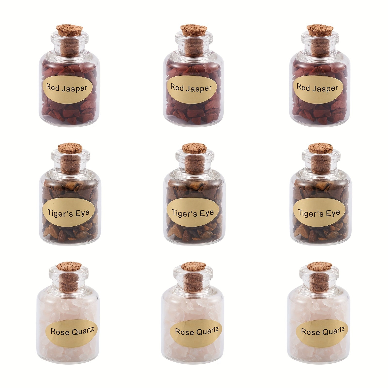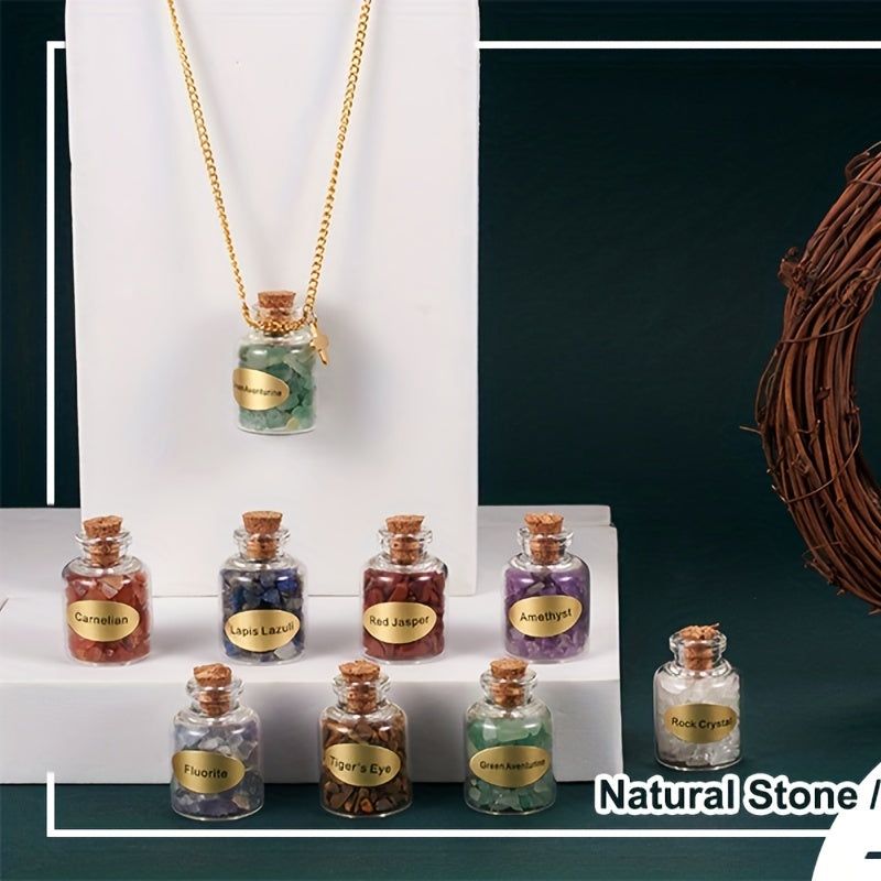 Get a set of 9 bottles with mixed natural and synthetic stone chips for DIY jewelry projects. Create unique pendants or accessories with these colorful stones.