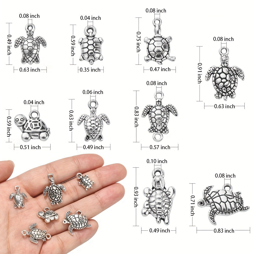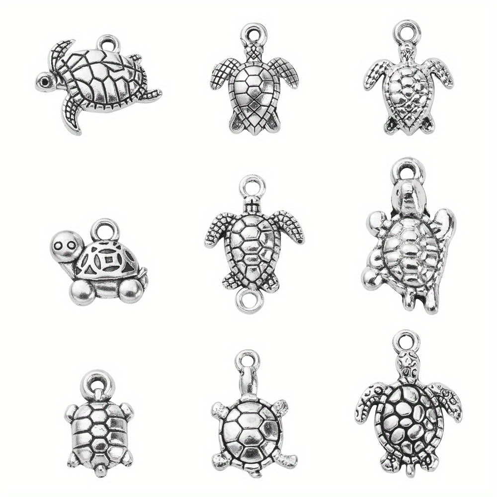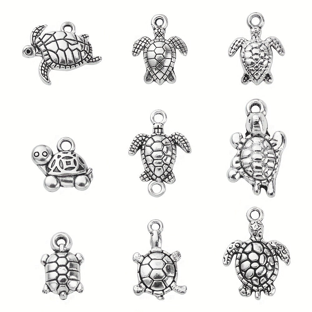 Collection of 90pcs turtle charms in 9 different styles, perfect for crafting bracelets, earrings, and necklaces. Made of high-quality alloy.
