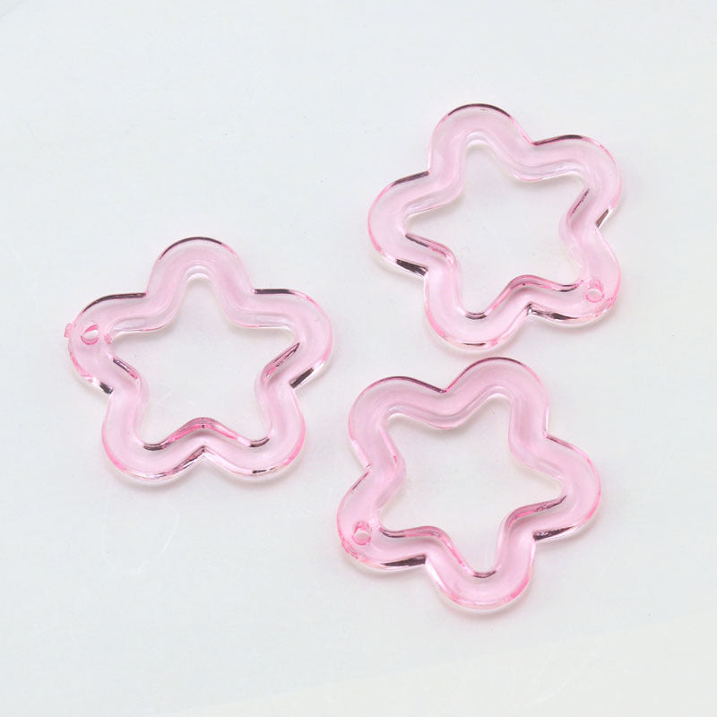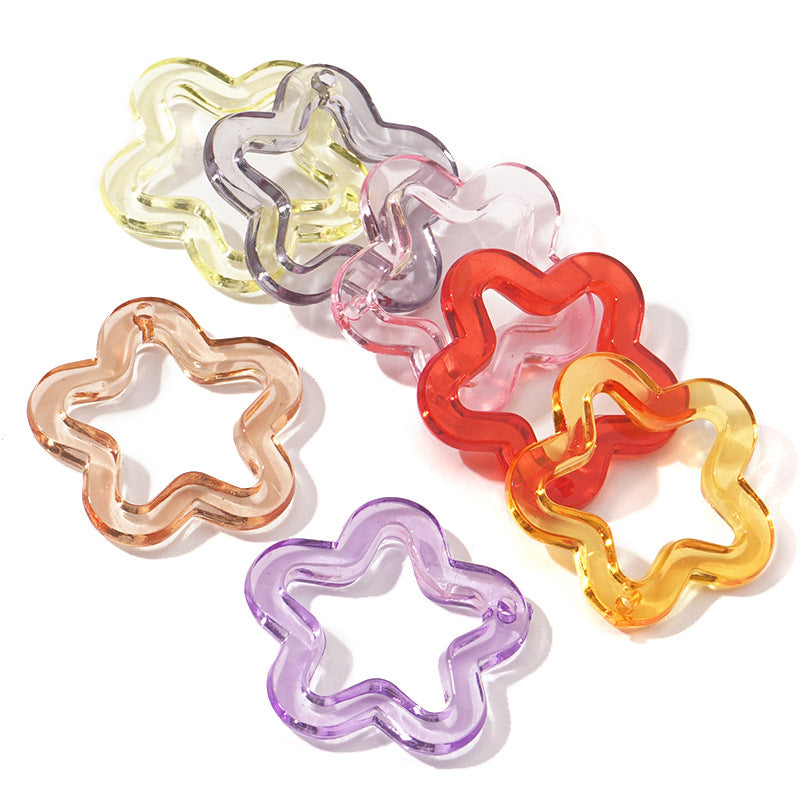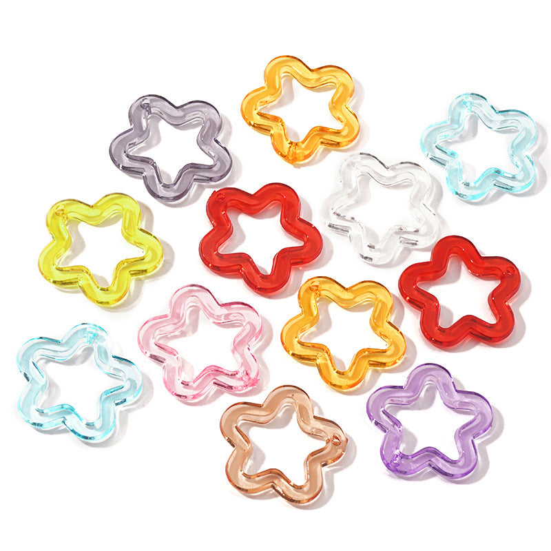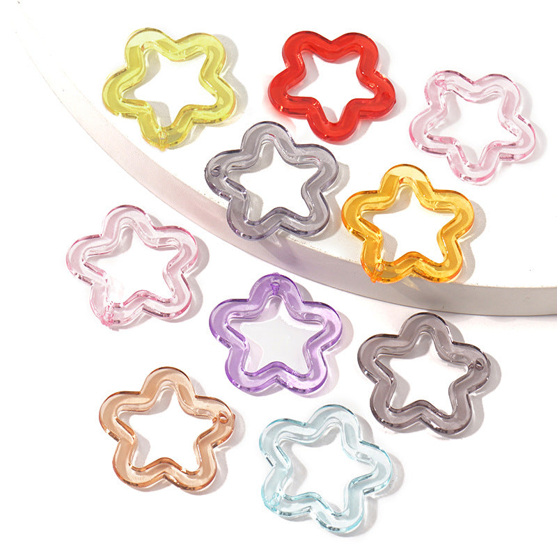This set includes 30, 50, or 100pcs of acrylic transparent pentagram, flower, plum key chain pendants for DIY bracelet, necklace, and mobile phone chain making.