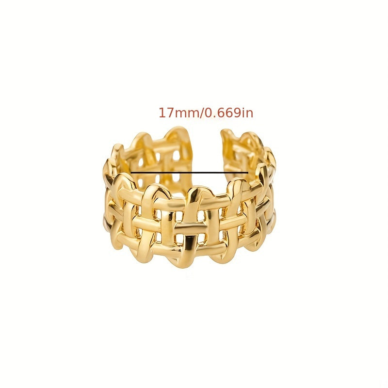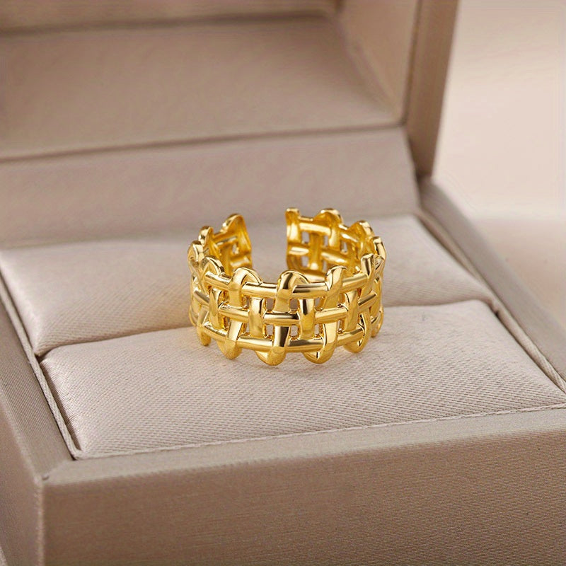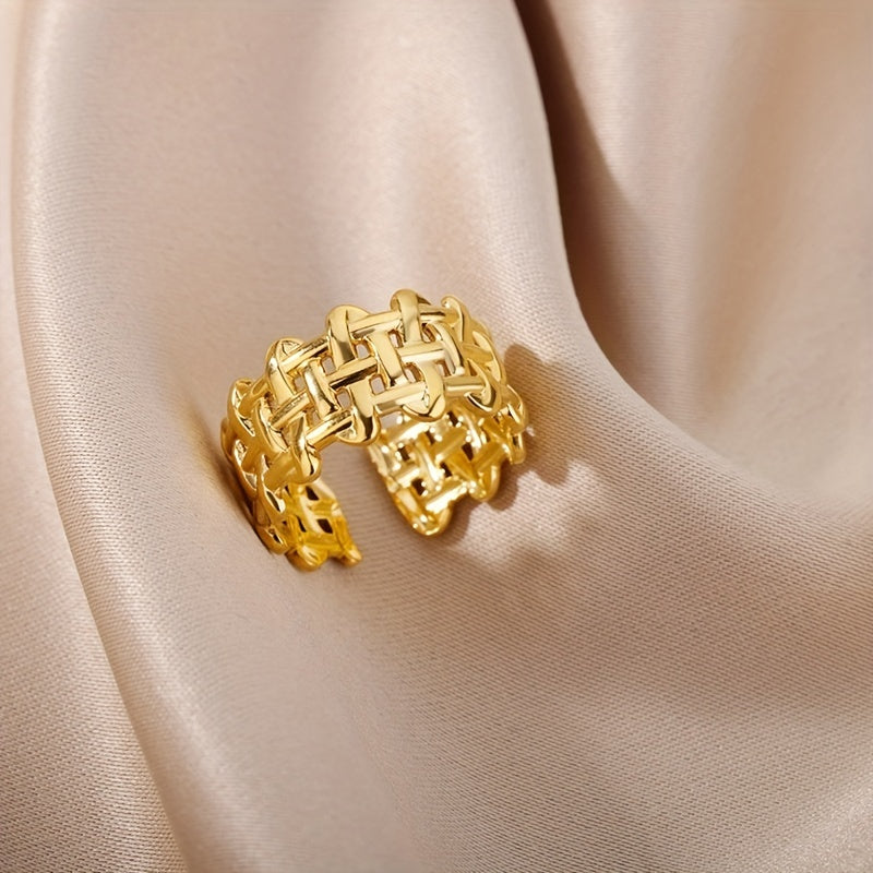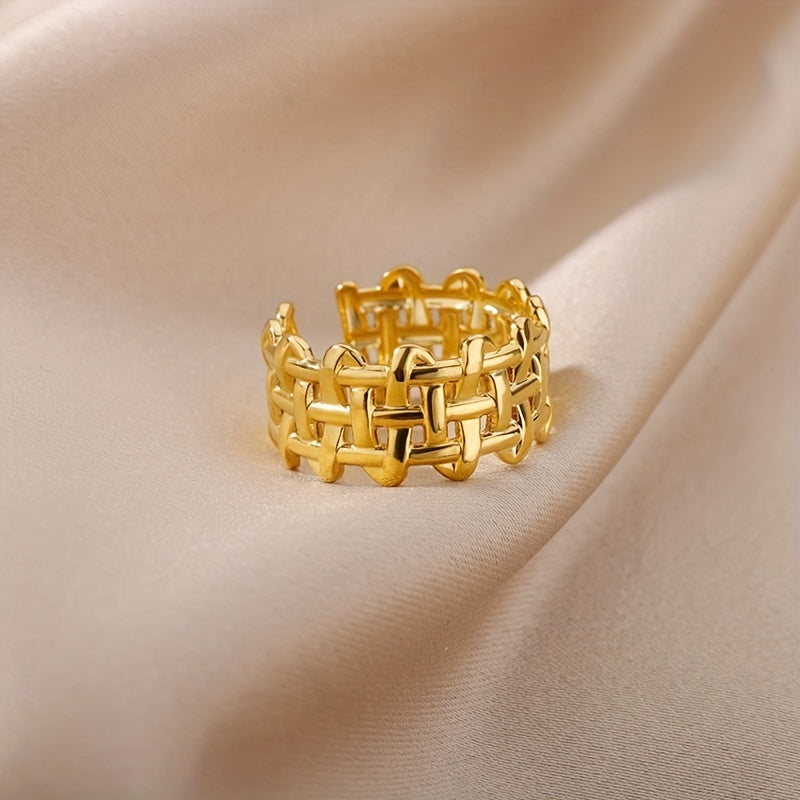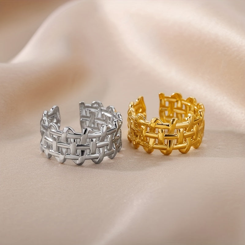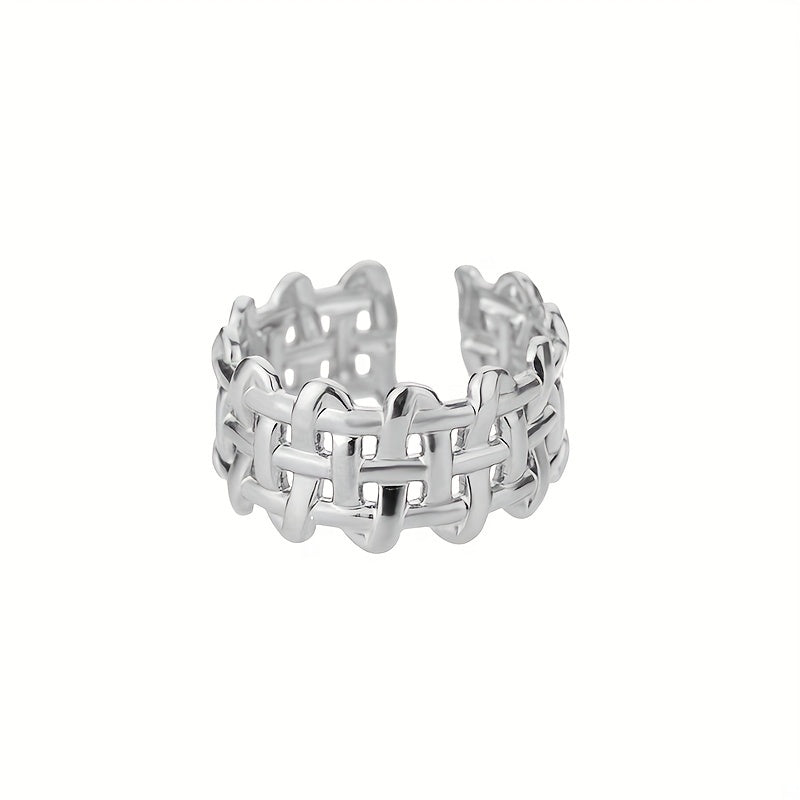 This unique unisex ring is made of stainless steel and features a creative braided open design. The ring is adjustable, making it a perfect fit for anyone.