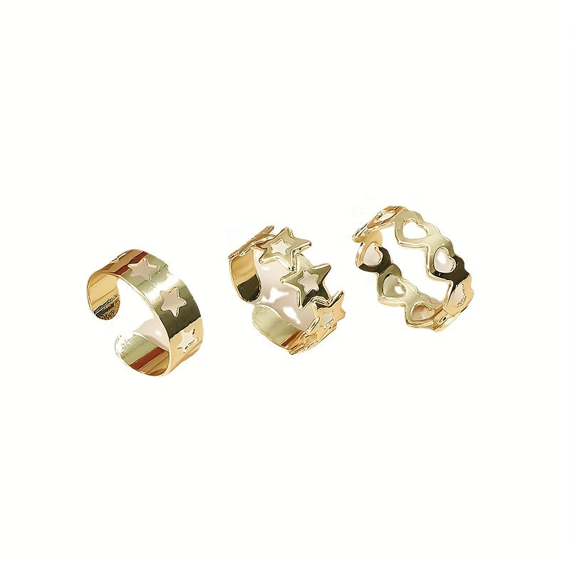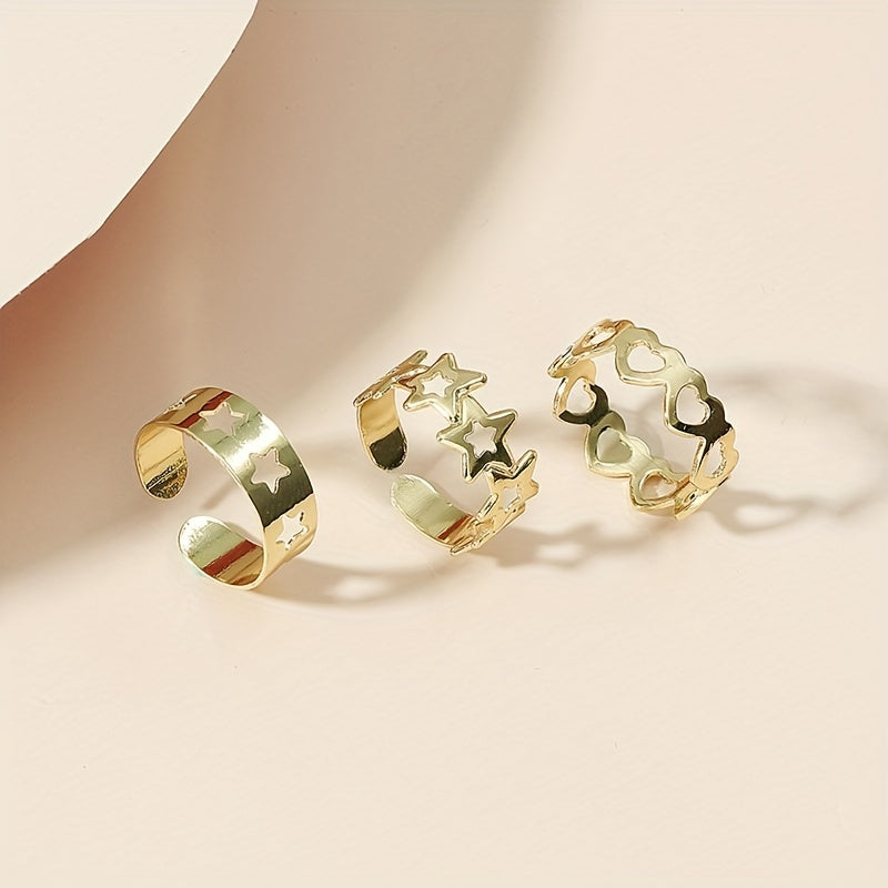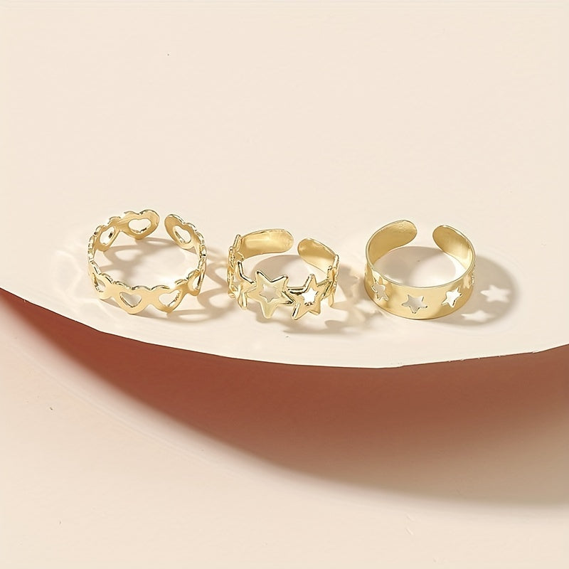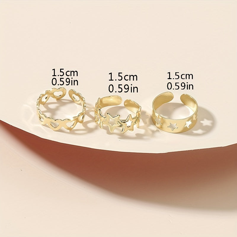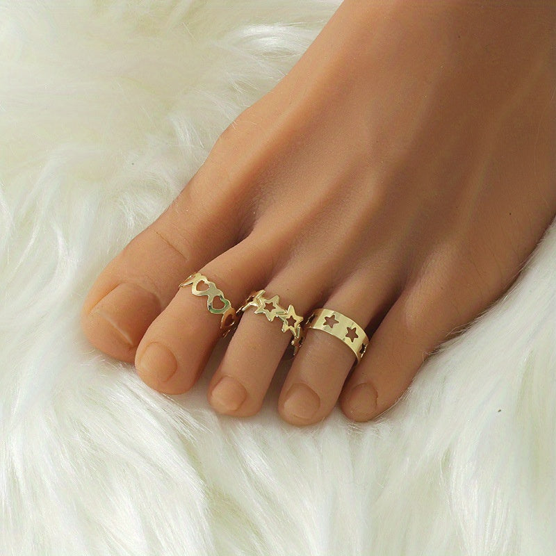 This ring set features an adjustable design with star, love, and heart shapes. It is hollow out and perfect for both fingers and toes.