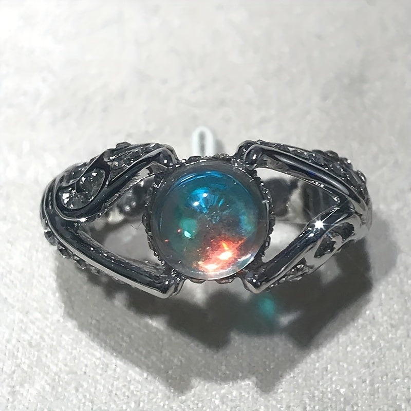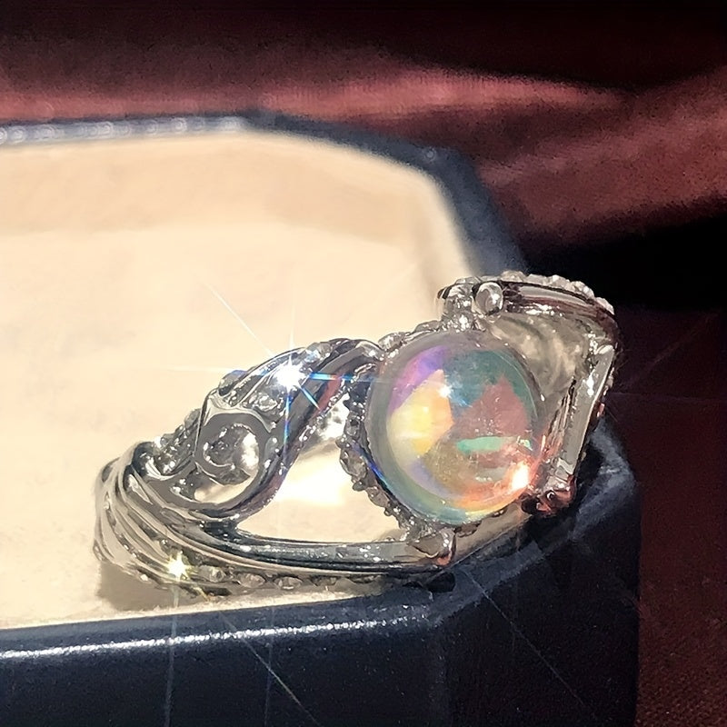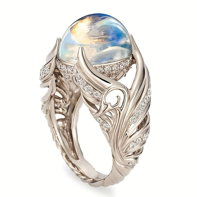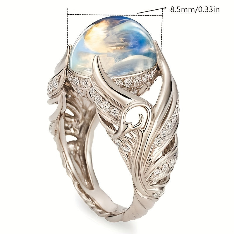 This creative ring features angel wings design with artificial diamonds and a colorful moonstone inlay. Suitable for both men and women.