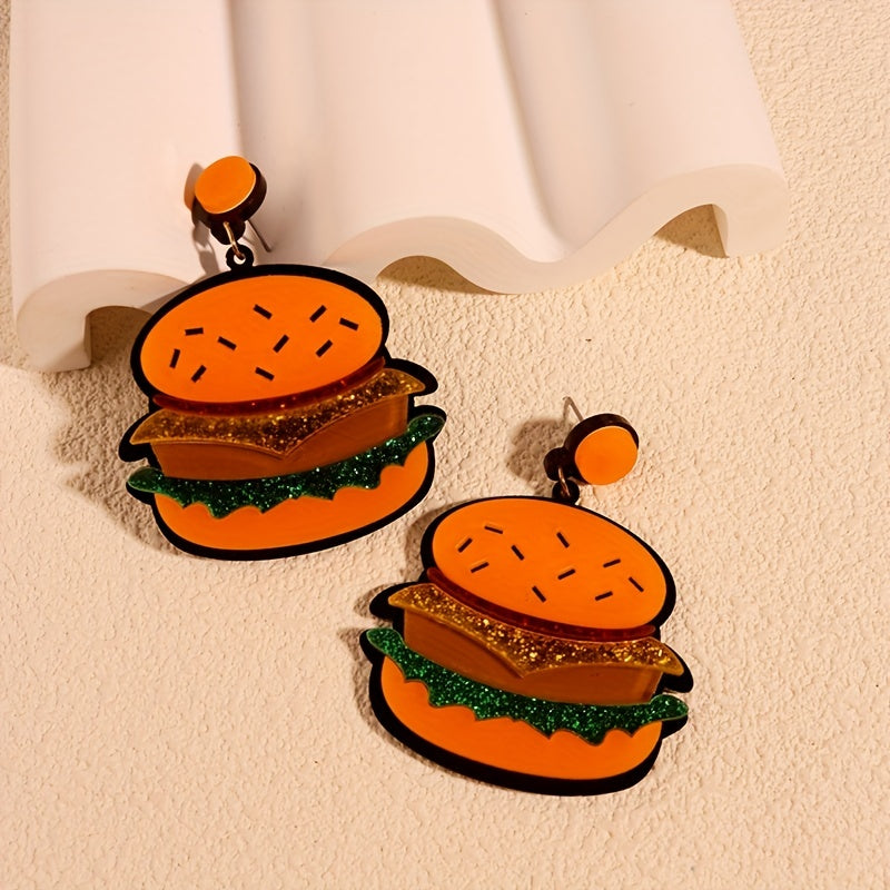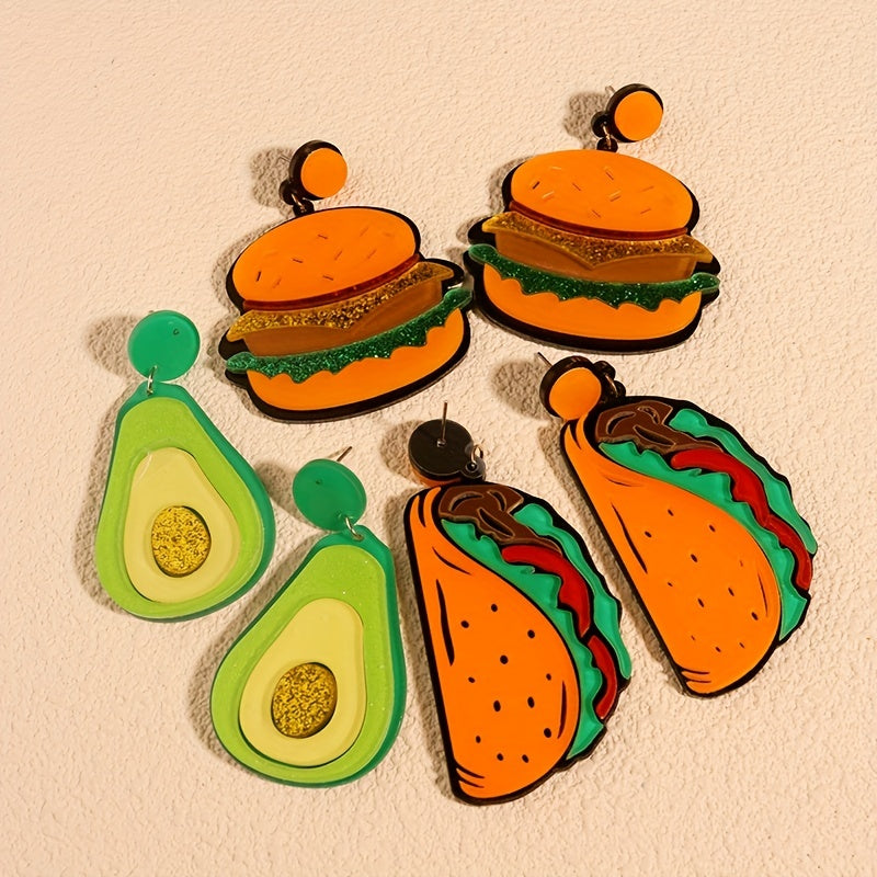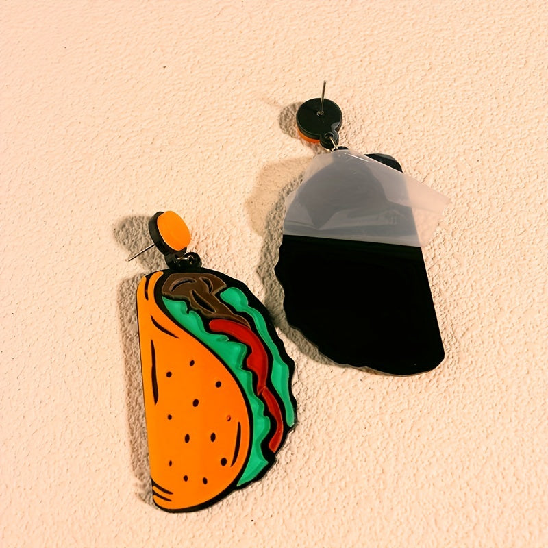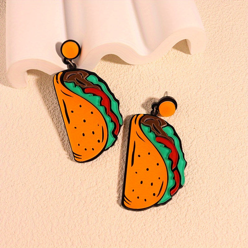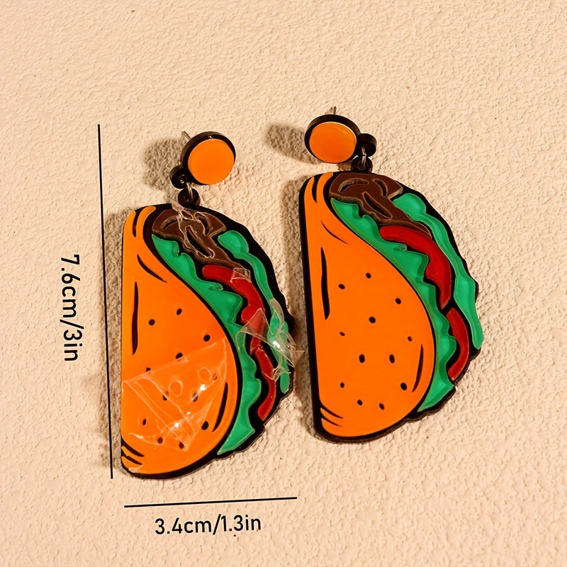 These fun and quirky dangle earrings feature a design inspired by Mexican cuisine, making them a perfect accessory for taco lovers. The earrings are made of acrylic and are lightweight for comfortable wear.
