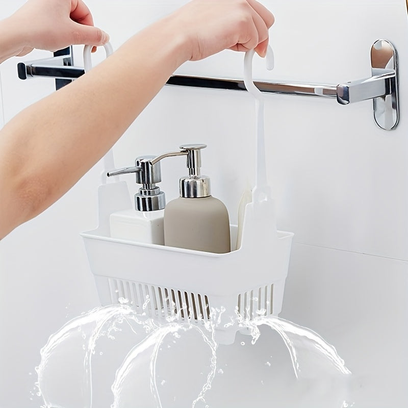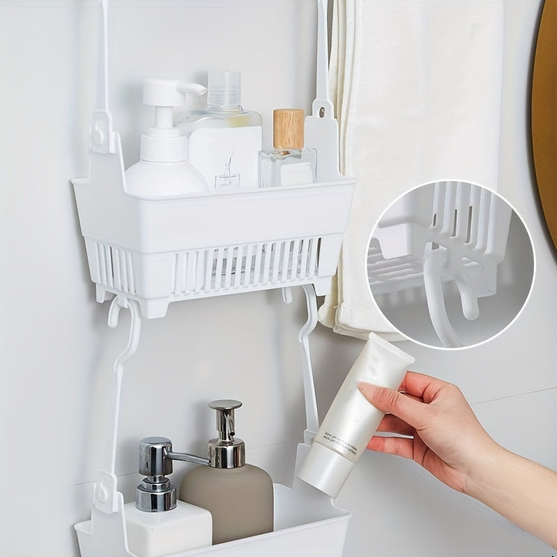 This hanging toiletries storage basket is a useful addition to your bathroom. It can be stacked for more storage space and features a drain design to keep items dry.
