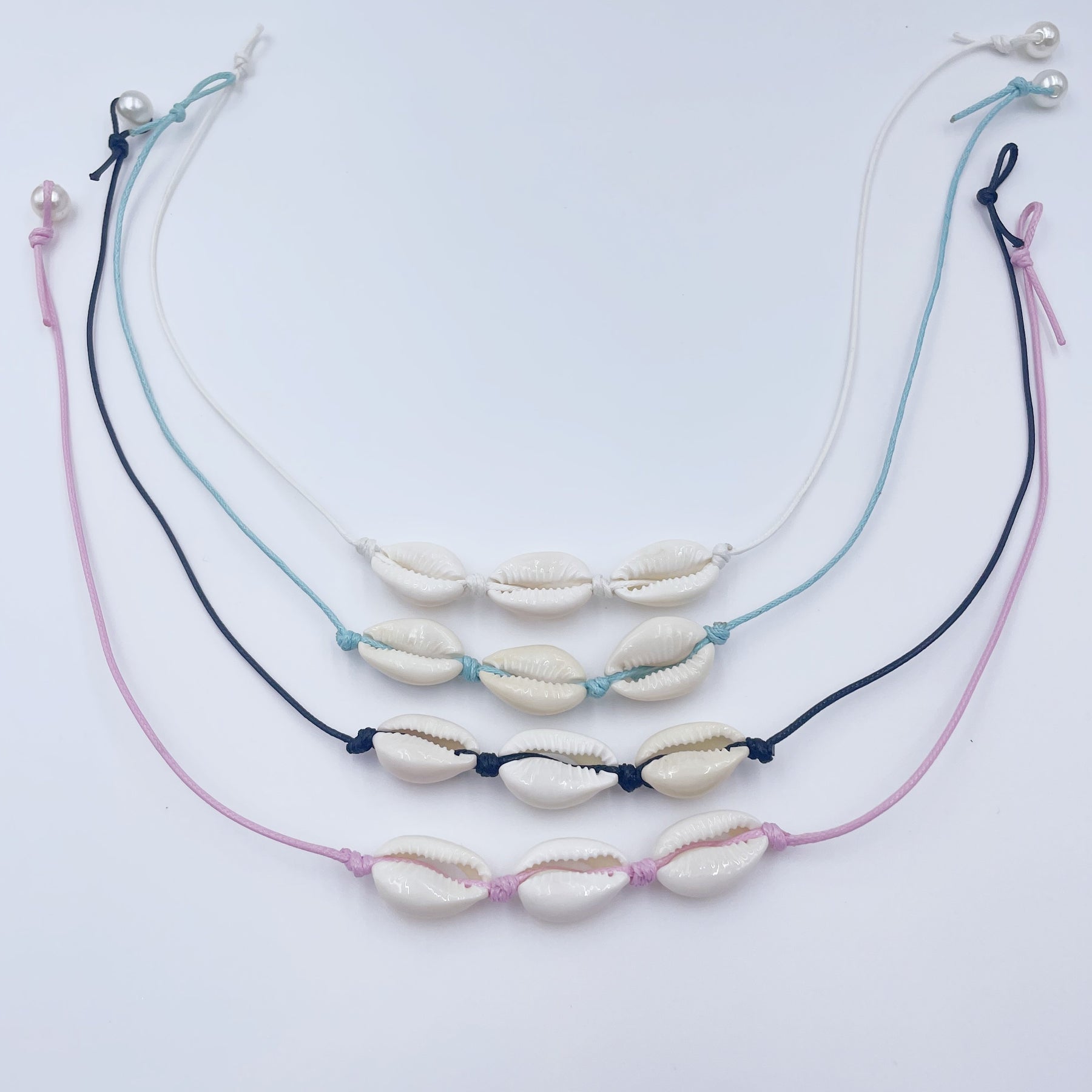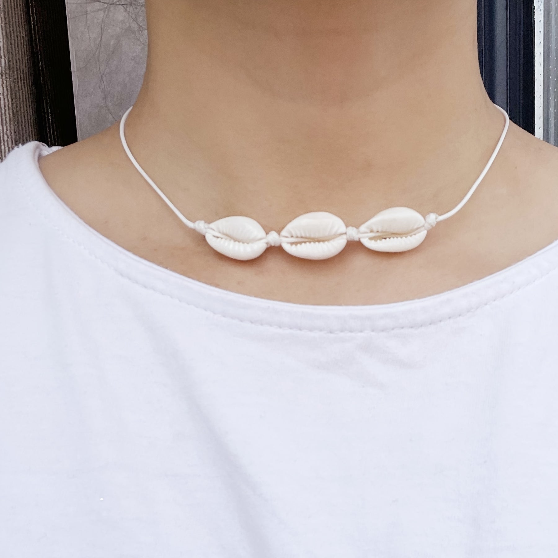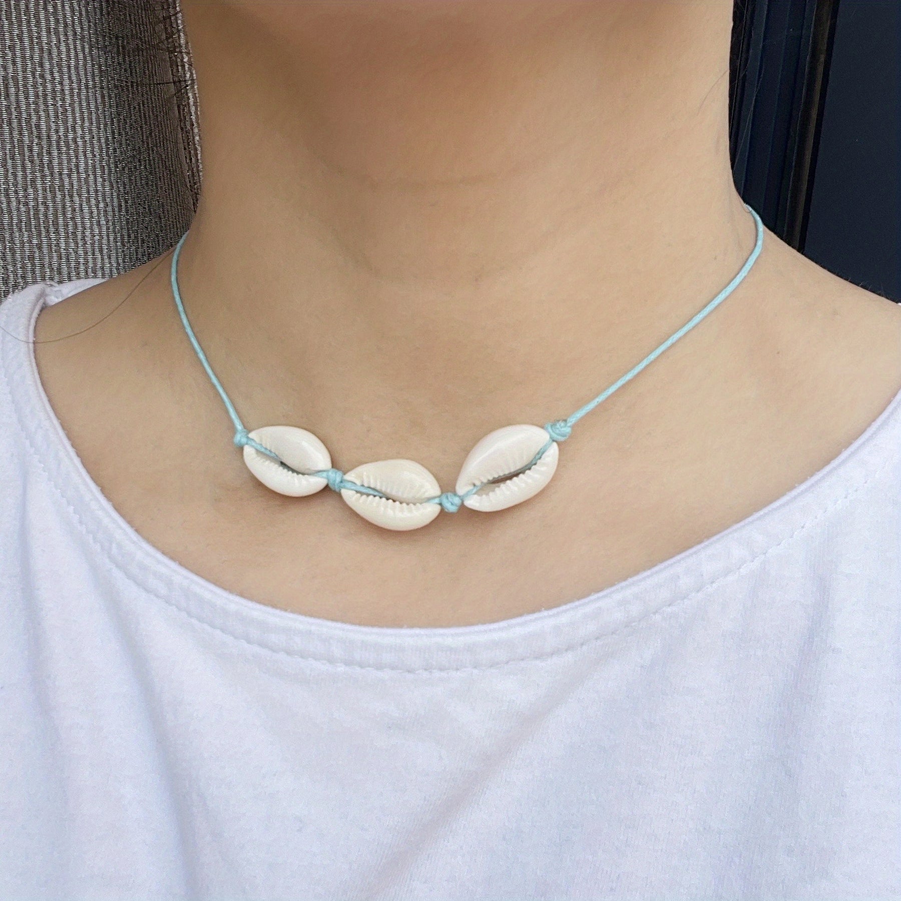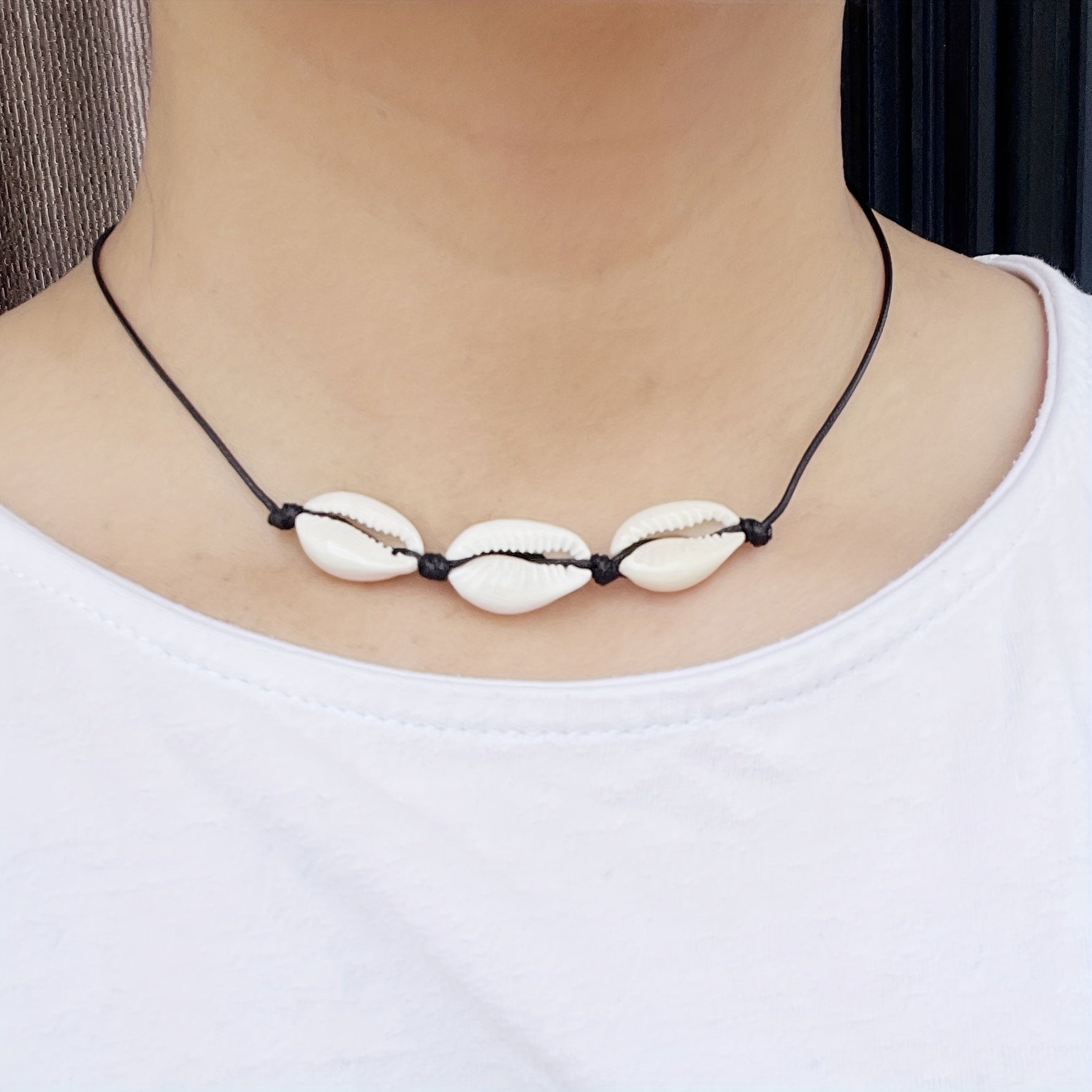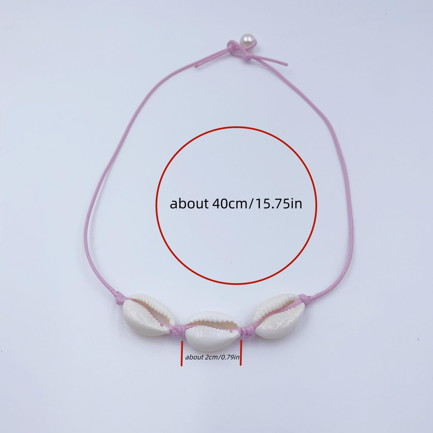 This natural shell necklace features a wax line design for a bohemian look. The braided pearl choker adds a touch of elegance to any outfit.