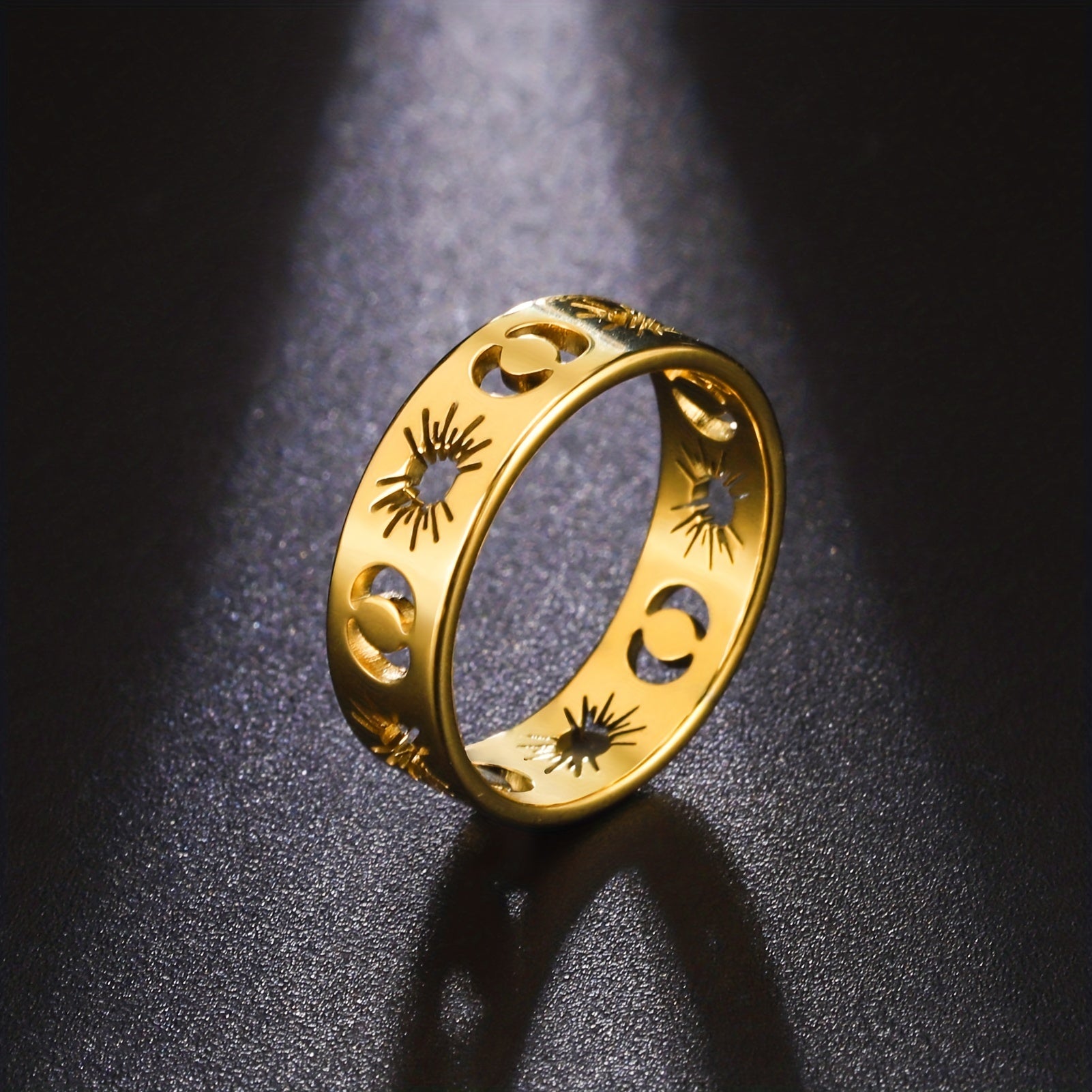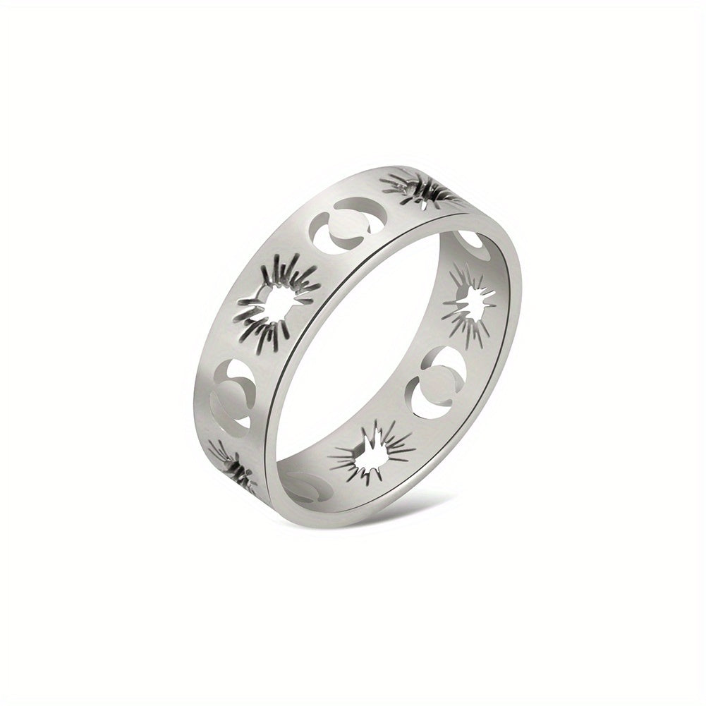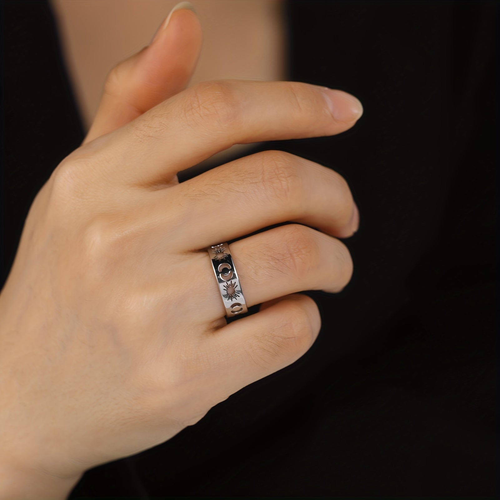 This Bohemian Aesthetics Hollow Sun & Moon Ring is a stylish accessory for men. Made of stainless steel, it features a unique design that showcases the sun and moon. Perfect as a gift or for personal use.