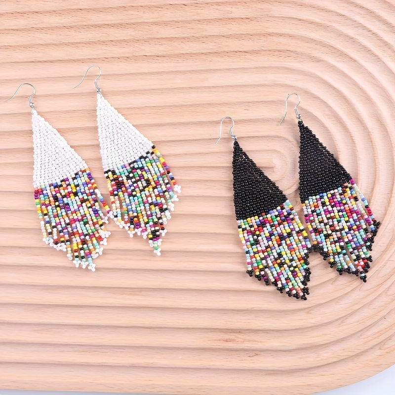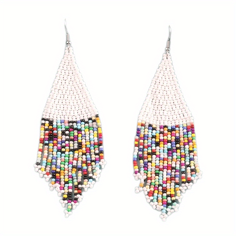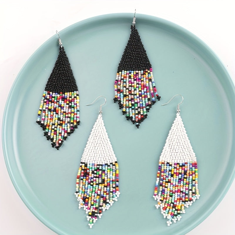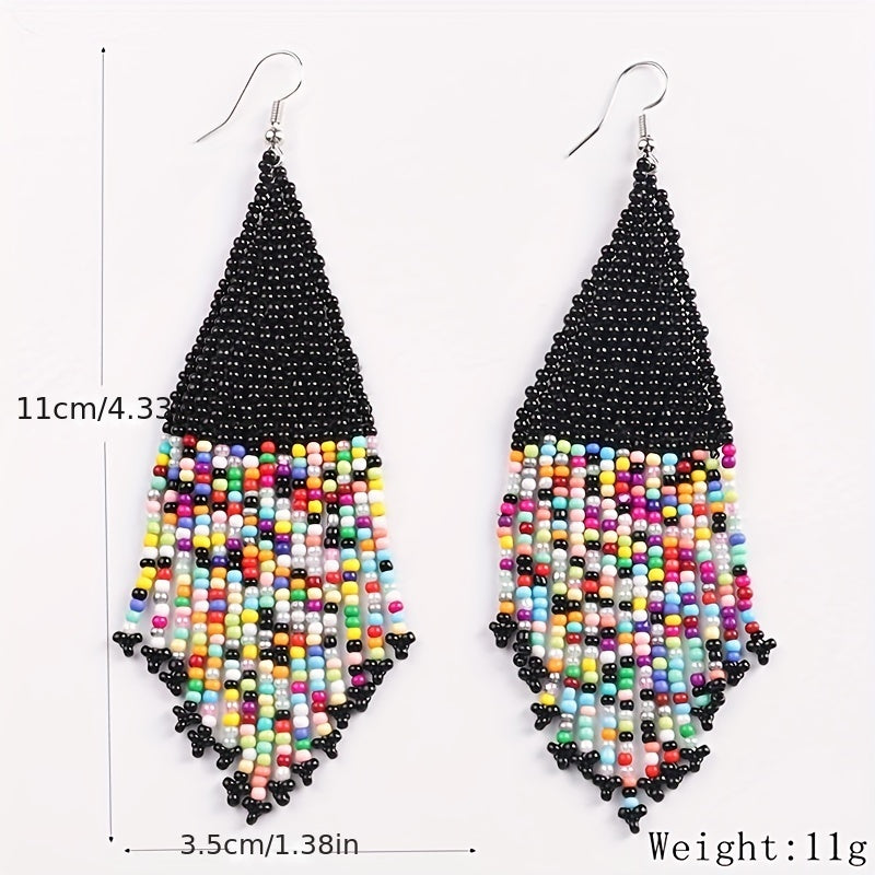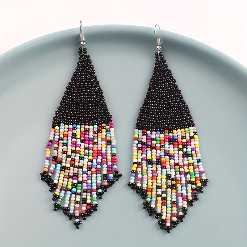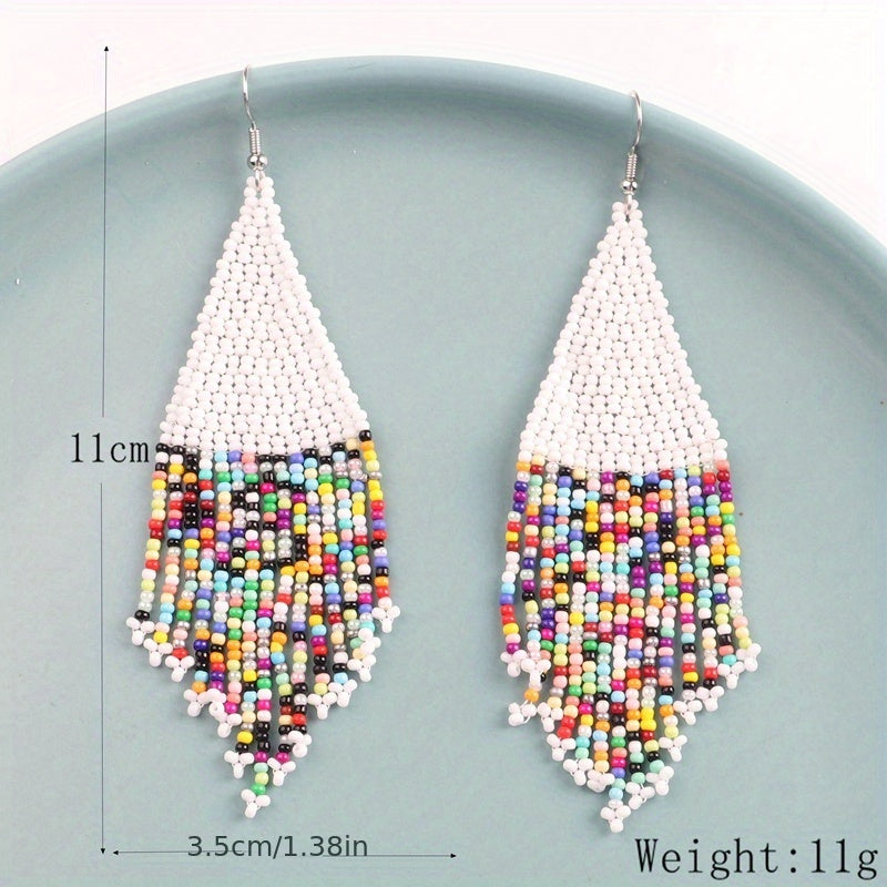 Add a touch of Bohemian style with these handwoven tassel earrings featuring contrasting rice beads. Perfect for a unique and ethnic look.