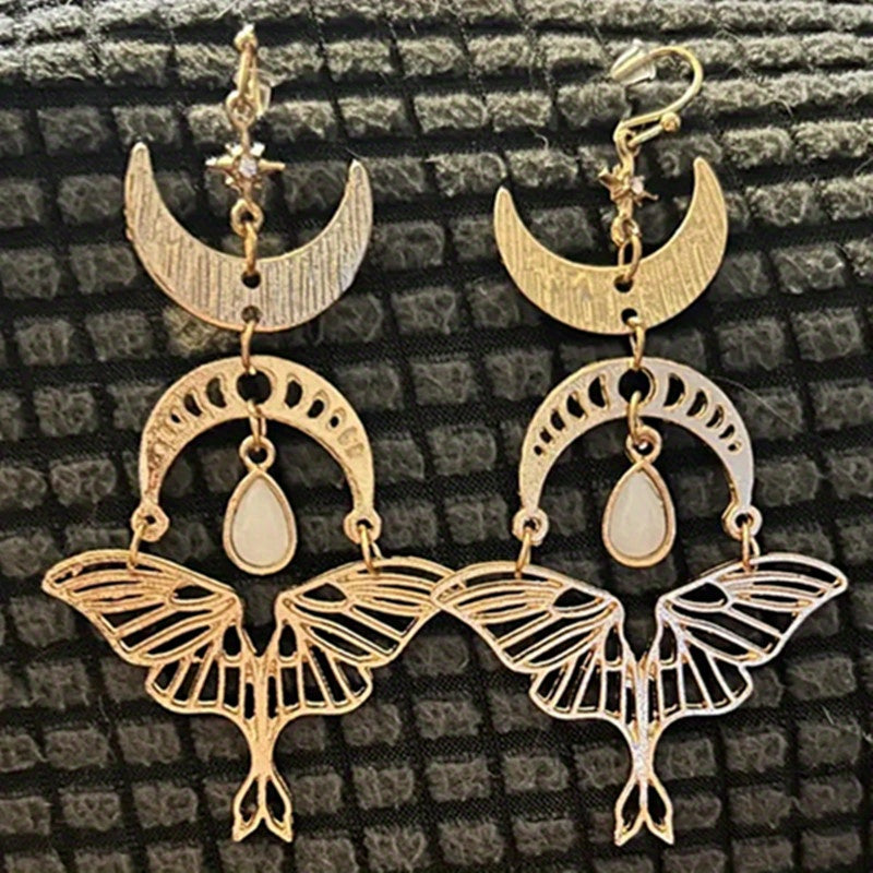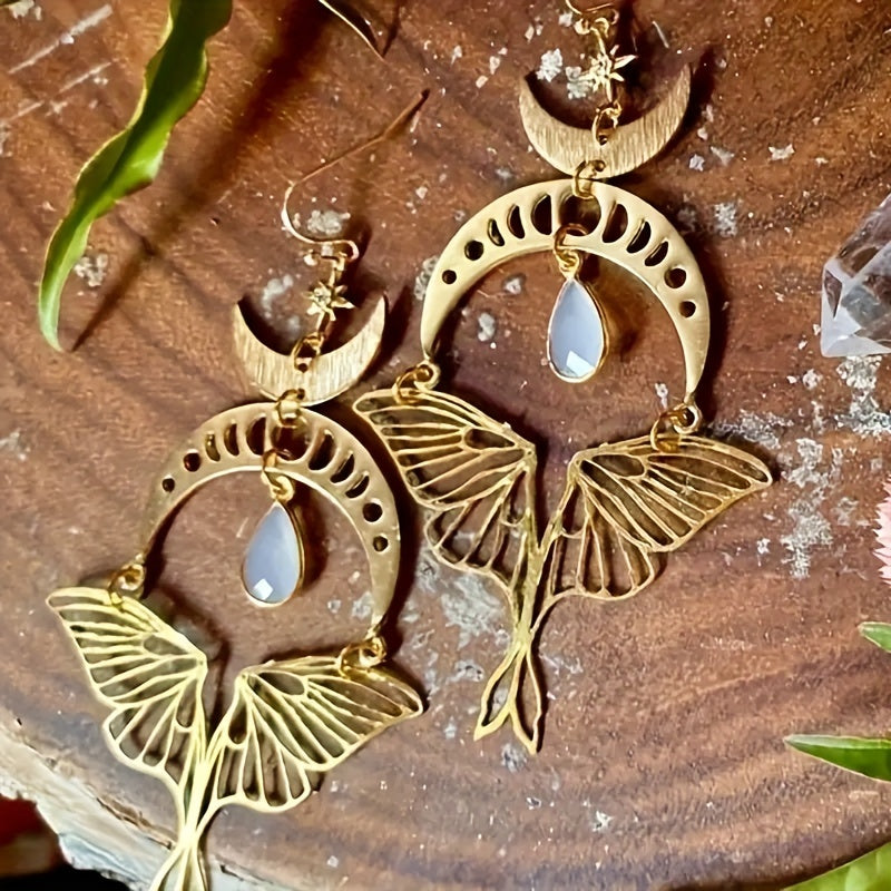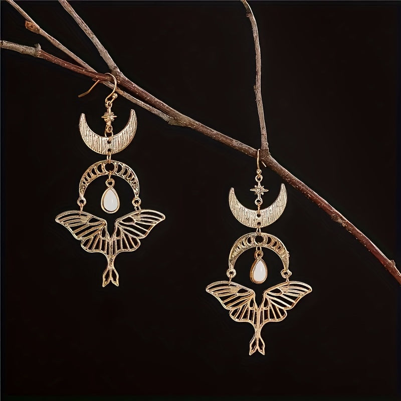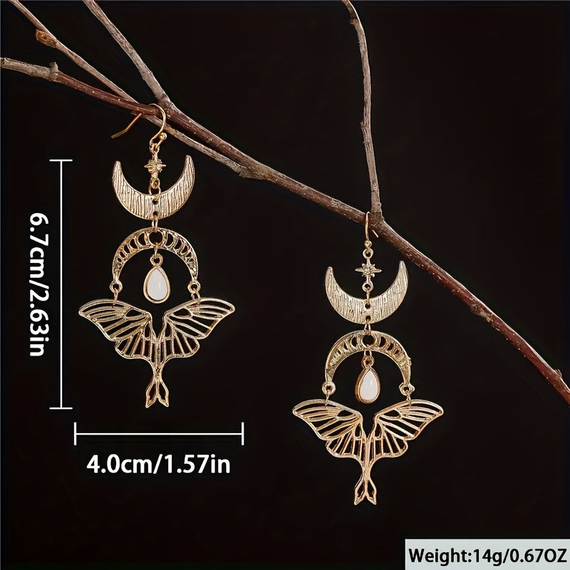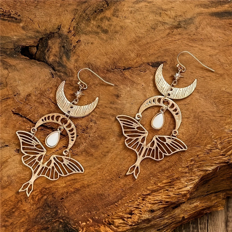 Add a touch of vintage bohemian flair to your look with these men's earrings featuring a hollow moon wing pattern and inlaid moonstone. Perfect for the free-spirited man.