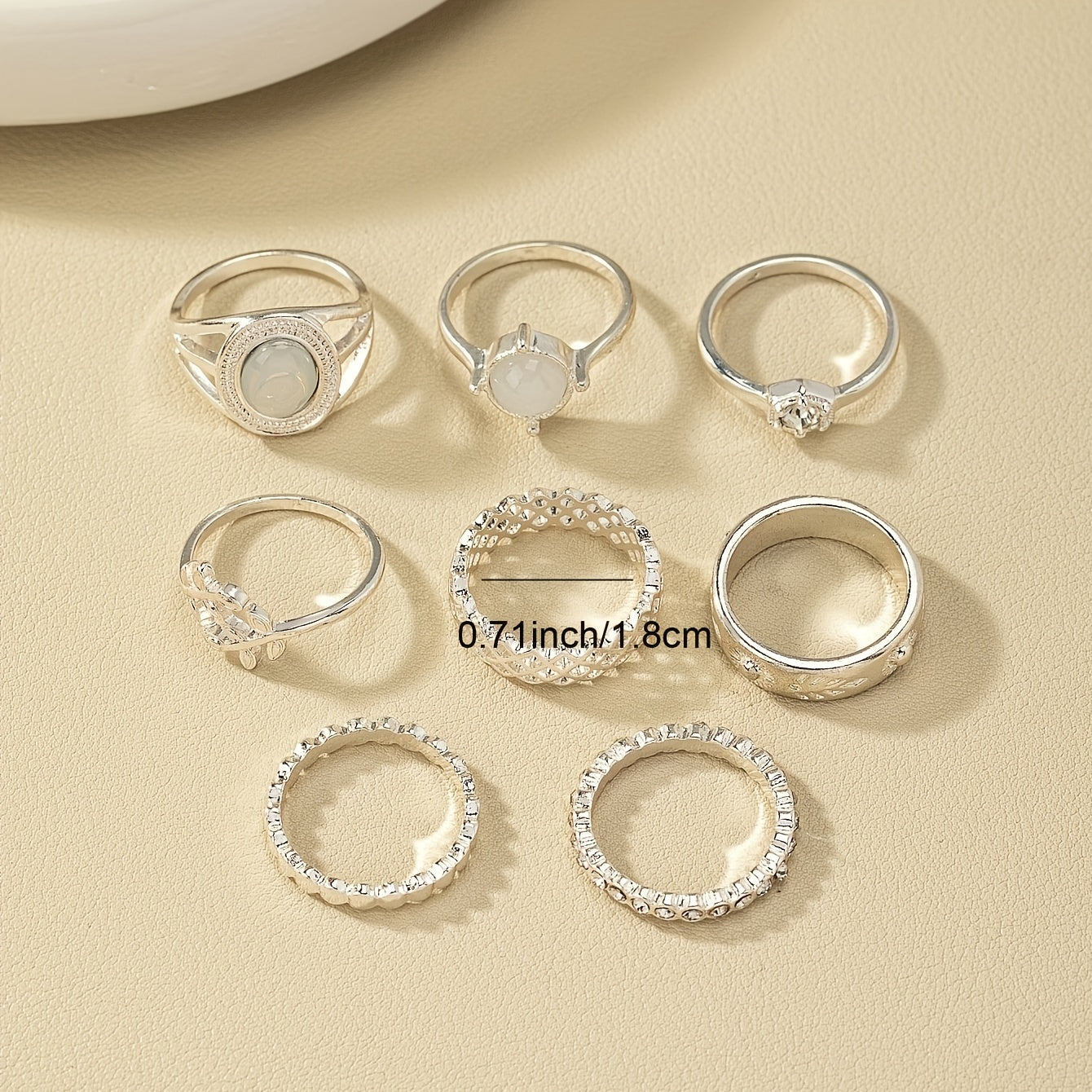 Add a touch of bohemian flair to your look with these delicate stacking rings. Featuring a mix of moonstone stones and intricate carving craftsmanship, these silver-plated rings are perfect for adding a unique and stylish touch to any outfit.