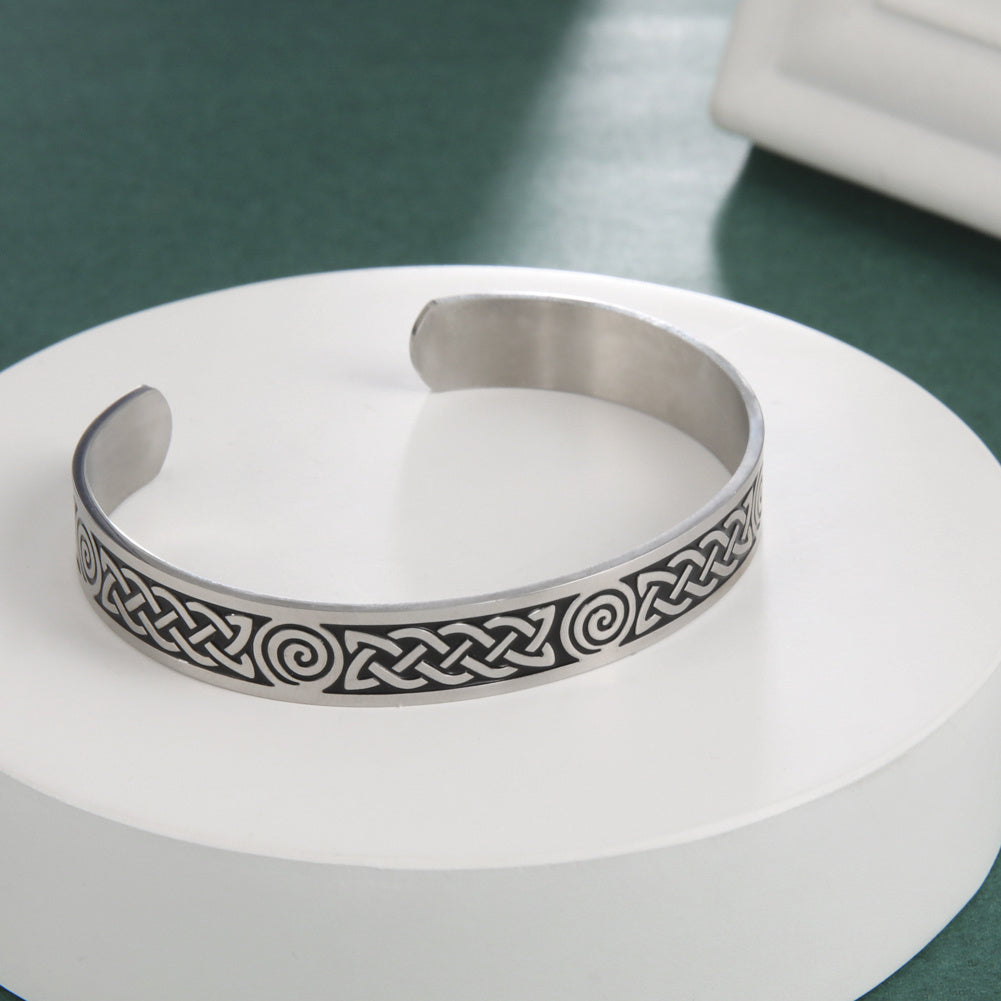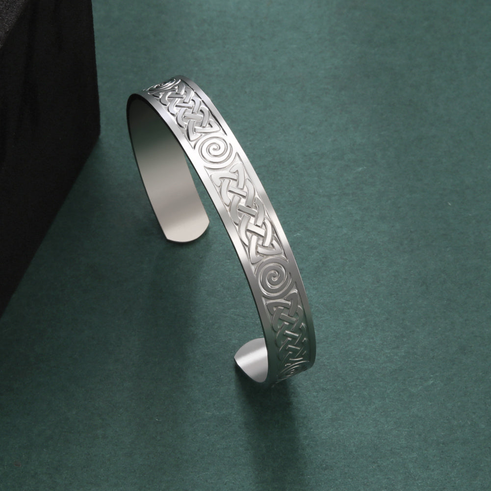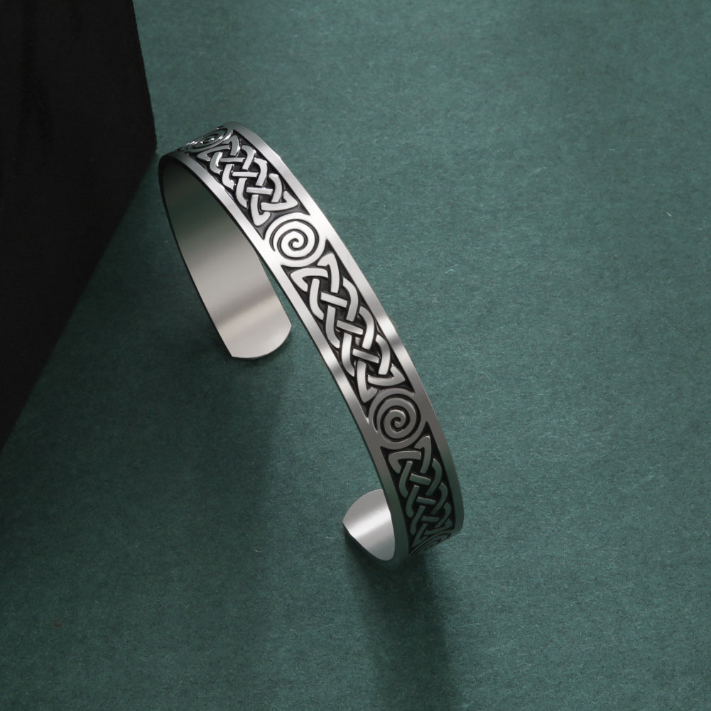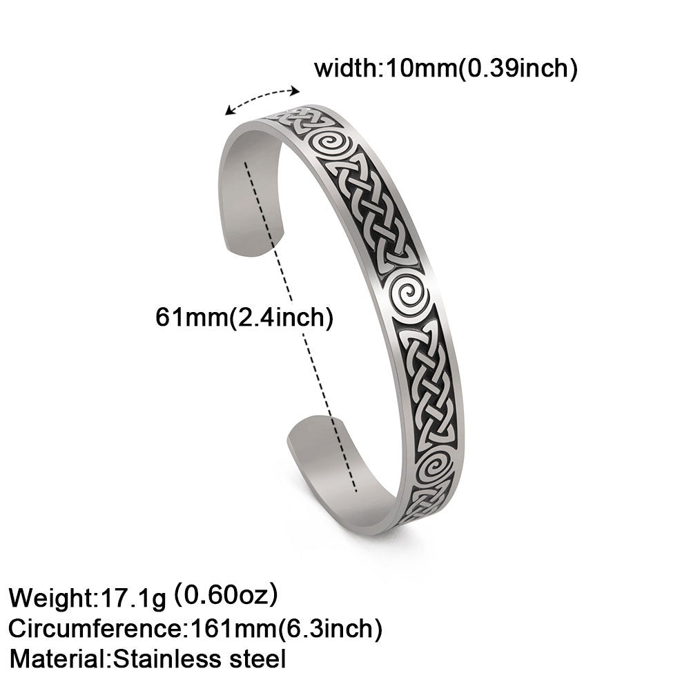 This cuff bangle for men features a Celtic knot spiral design and is made of silvery stainless steel. It is a great piece of retro Viking jewelry that adds a stylish touch to any outfit.