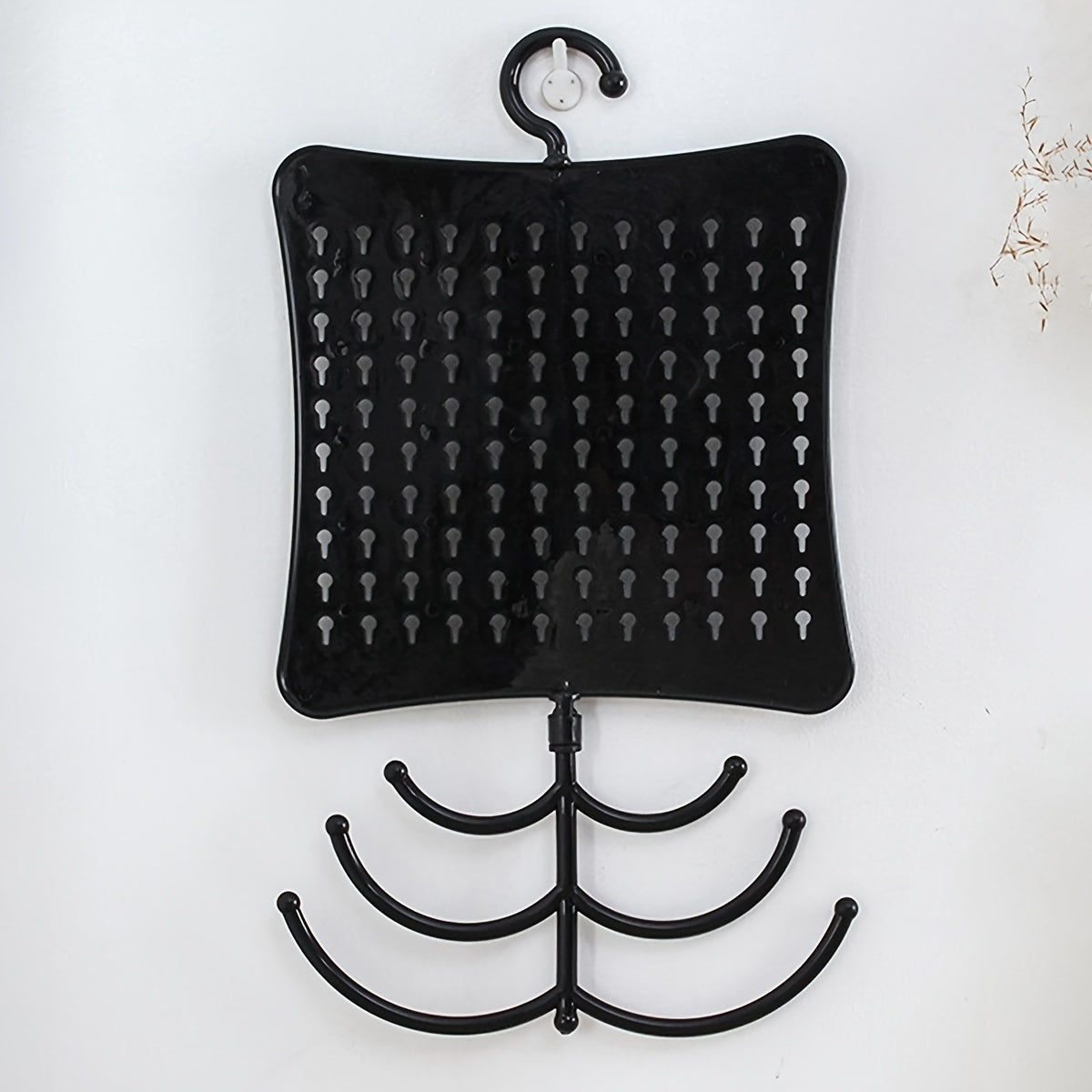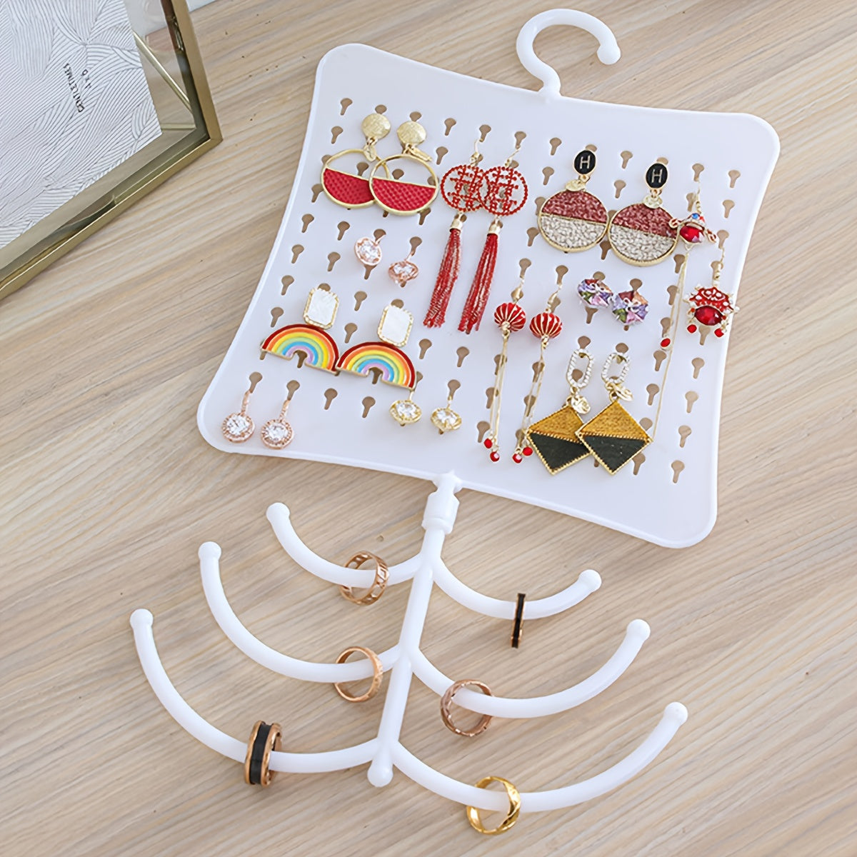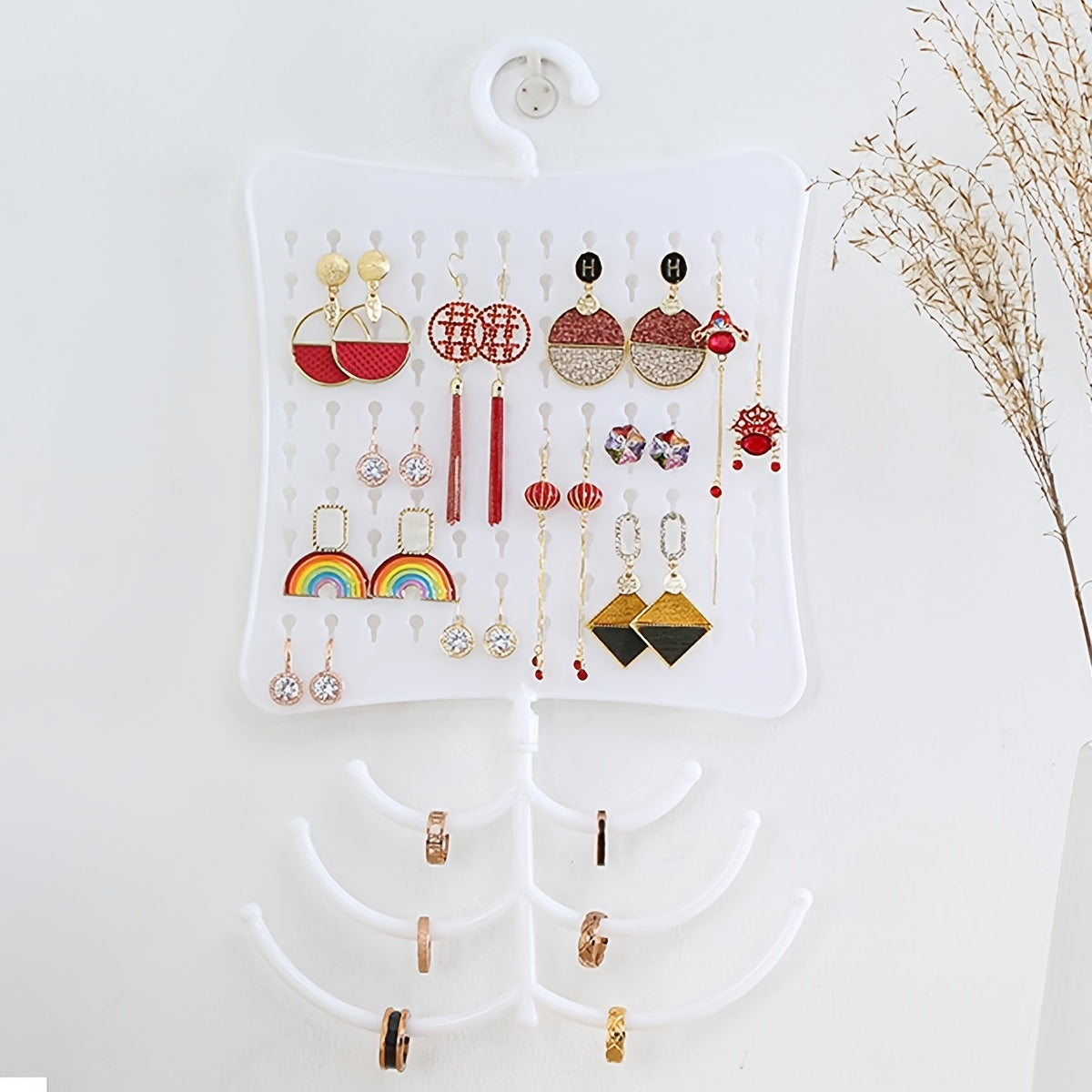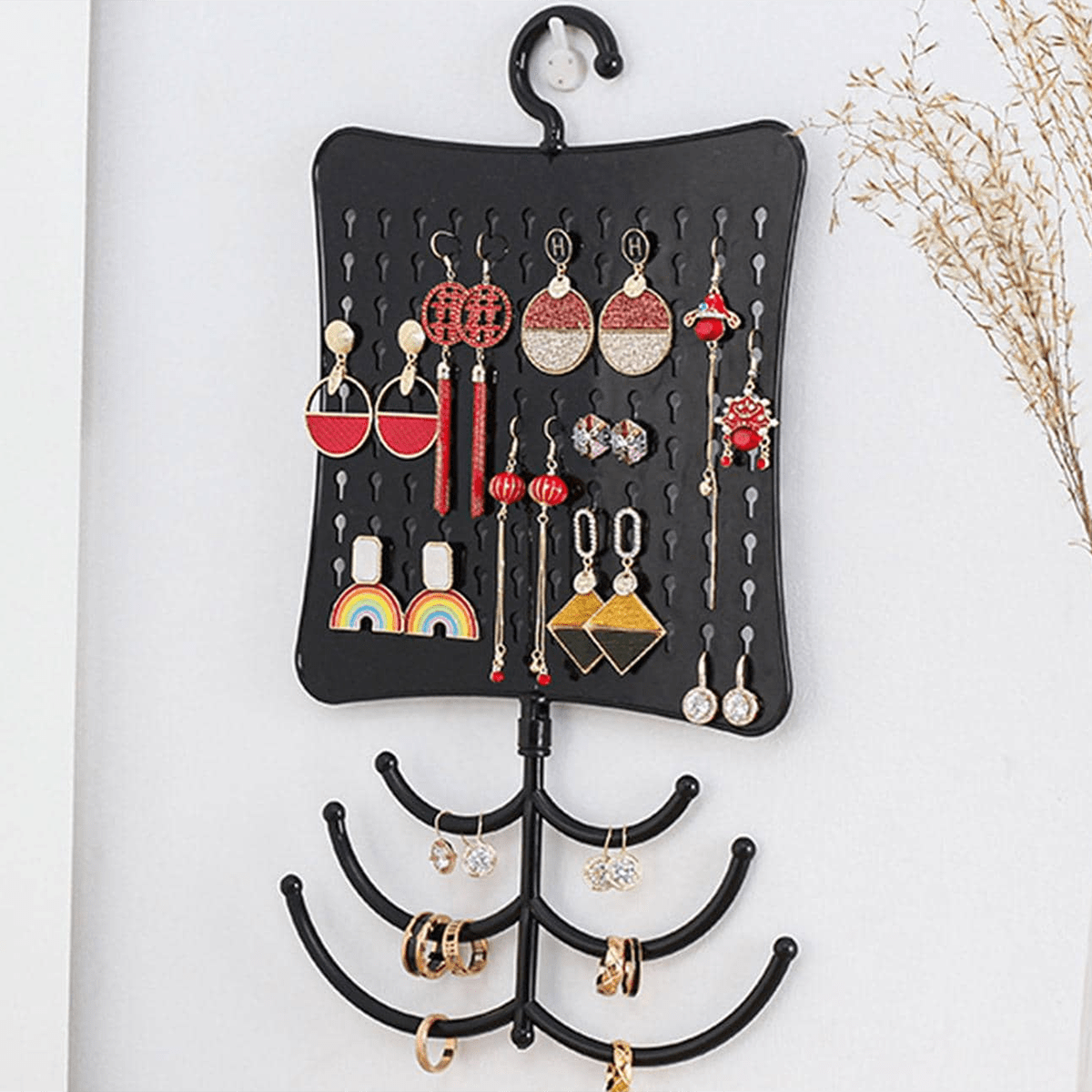 This wall mount display stand is designed to showcase earrings, rings, and necklaces. It is a stylish and practical way to organize and display your jewelry collection.