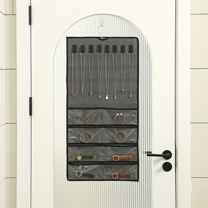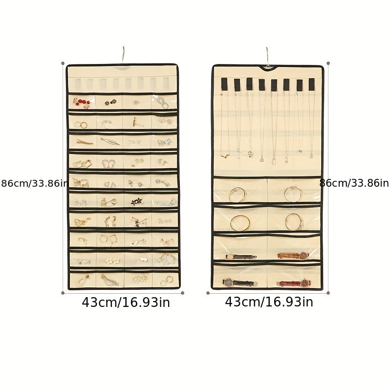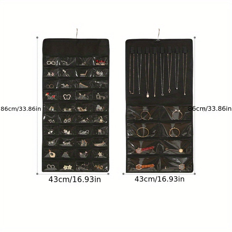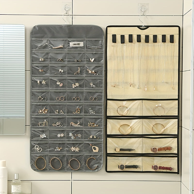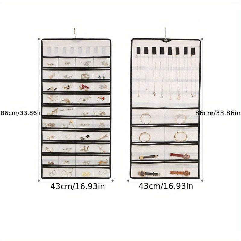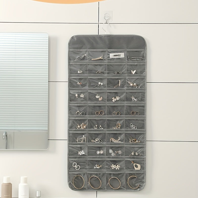 Keep your jewelry organized and easily accessible with this double-sided hanging storage bag. It features grids and pockets for earrings, small items, and prevents dust accumulation.