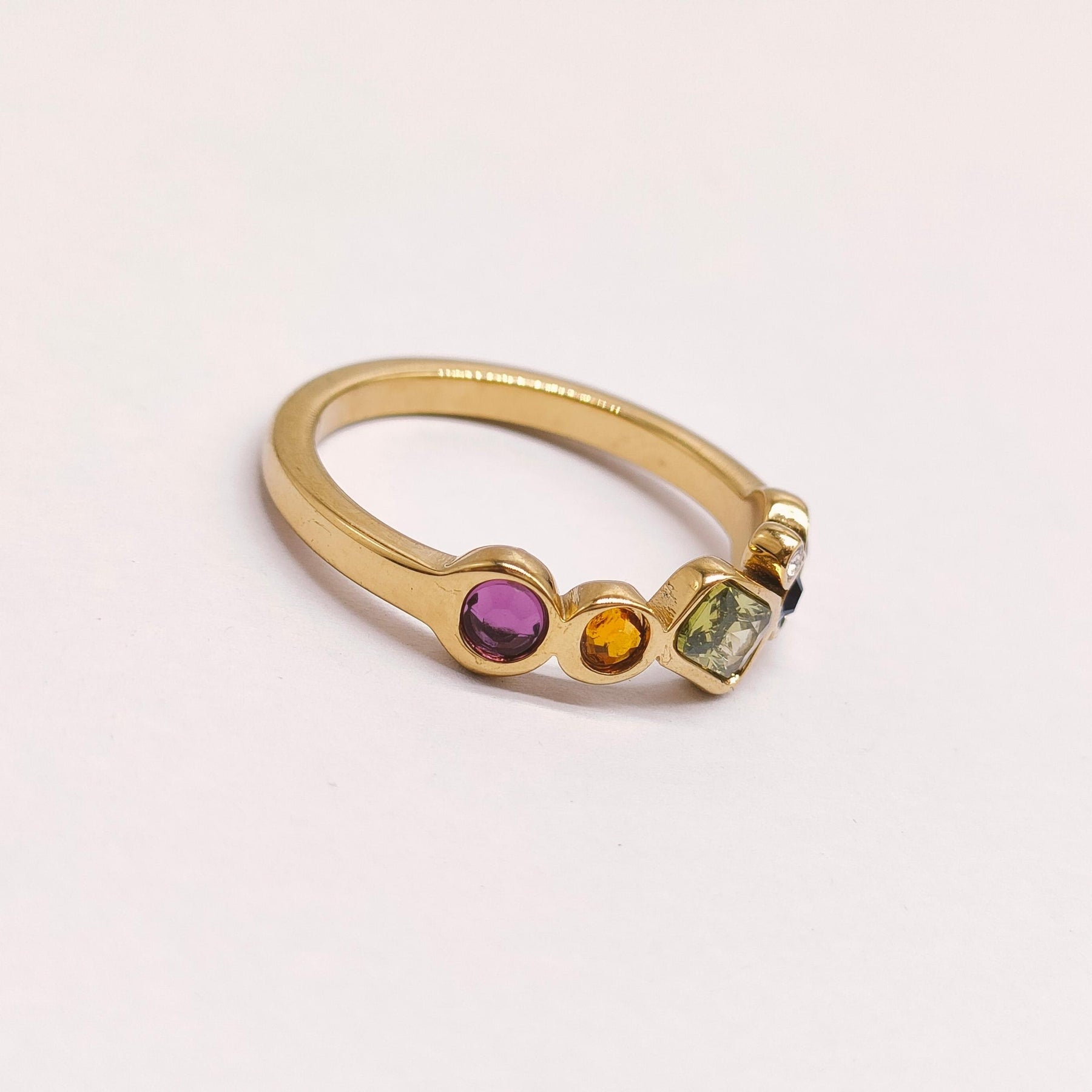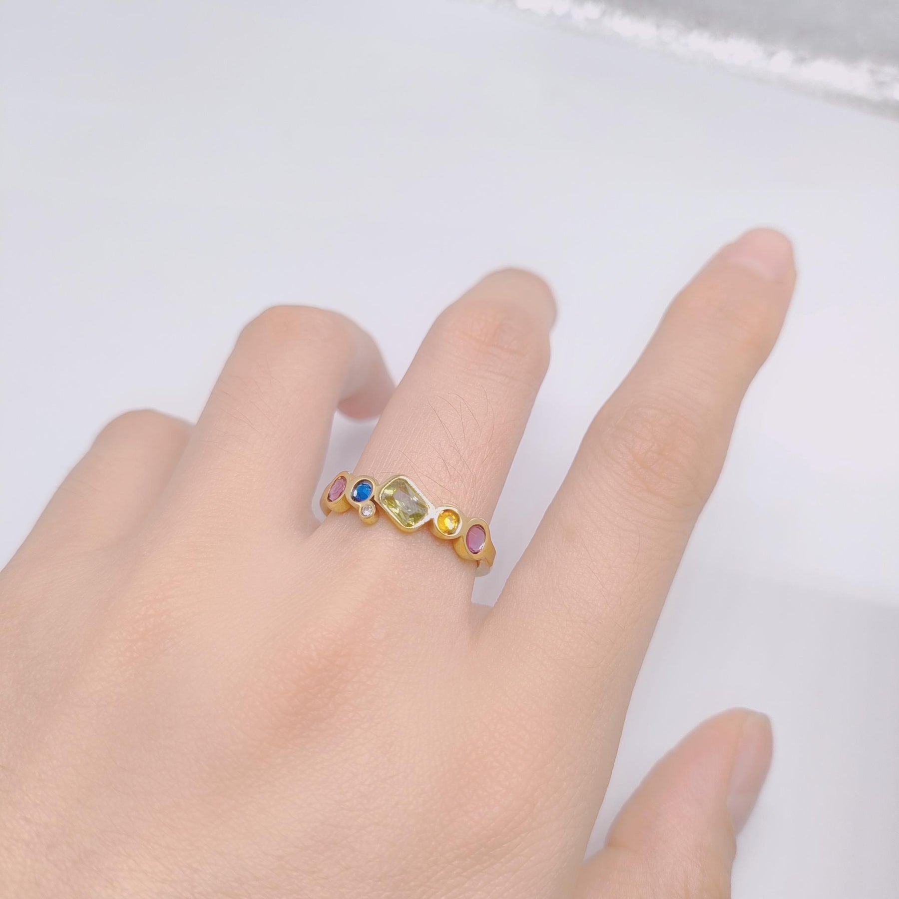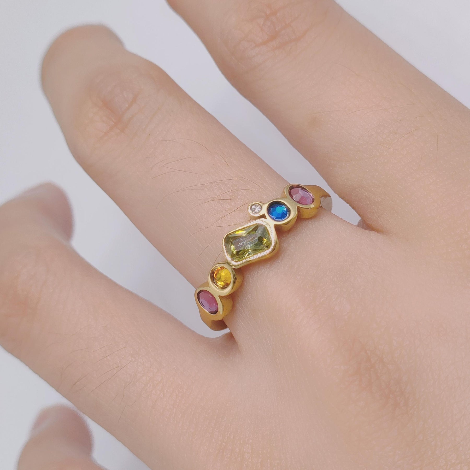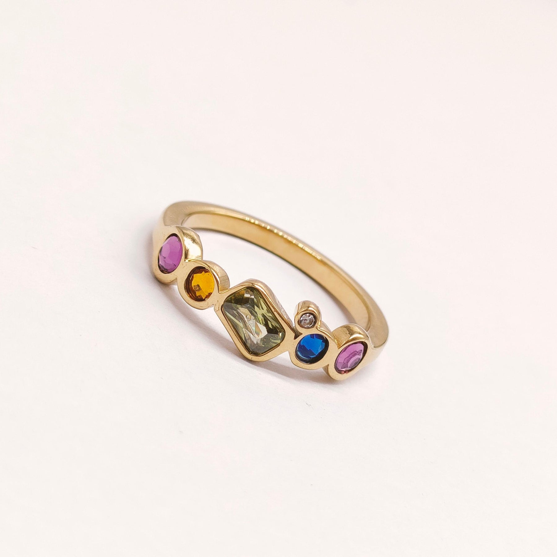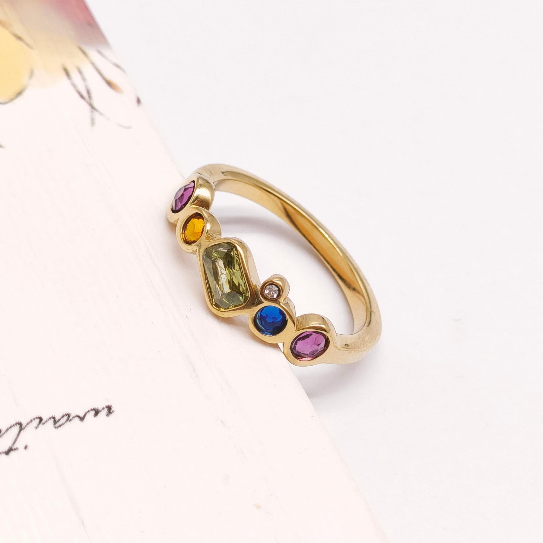 Add a touch of luxury with this stainless steel ring featuring colored zircon inlays and a golden plated finish. Perfect for everyday wear or special occasions.