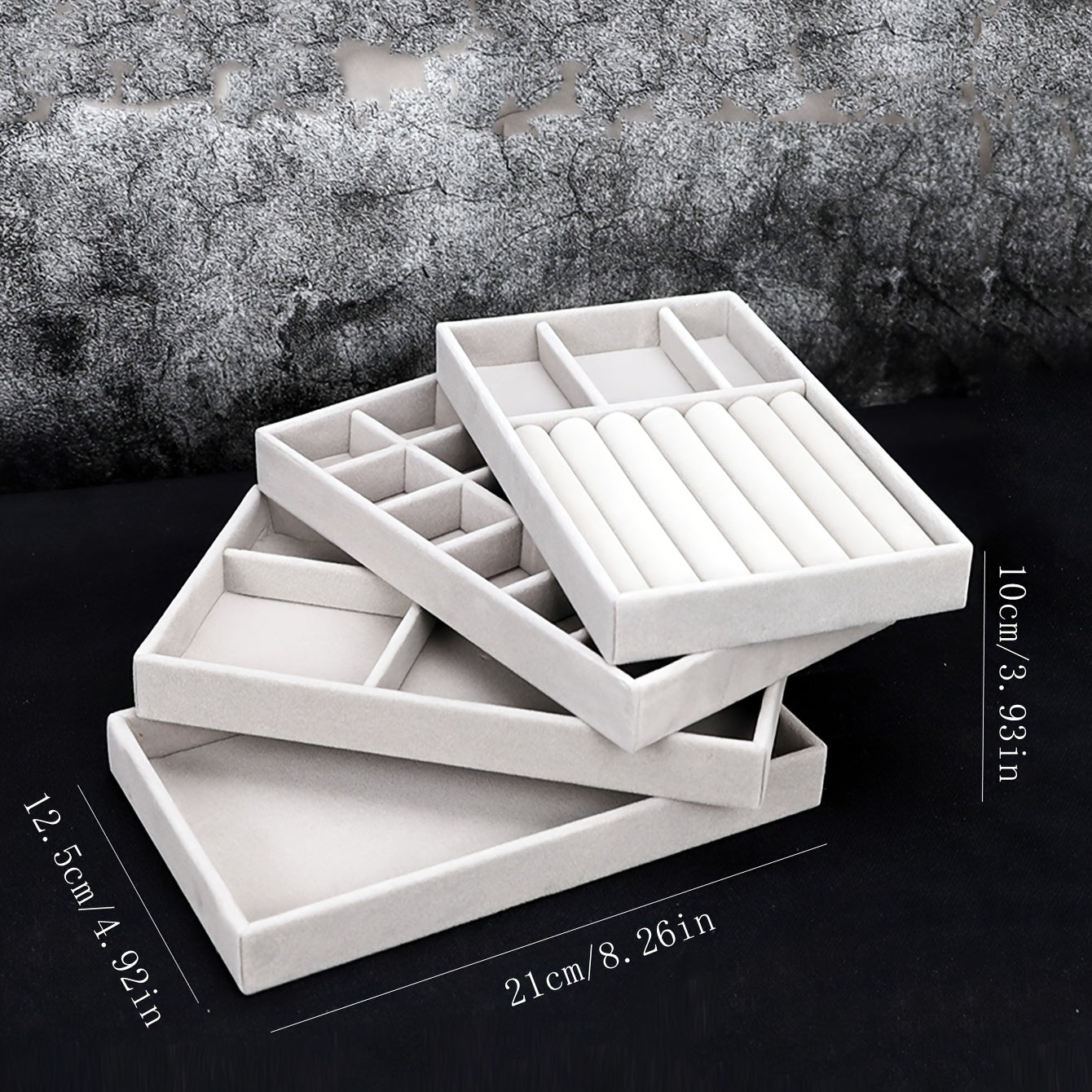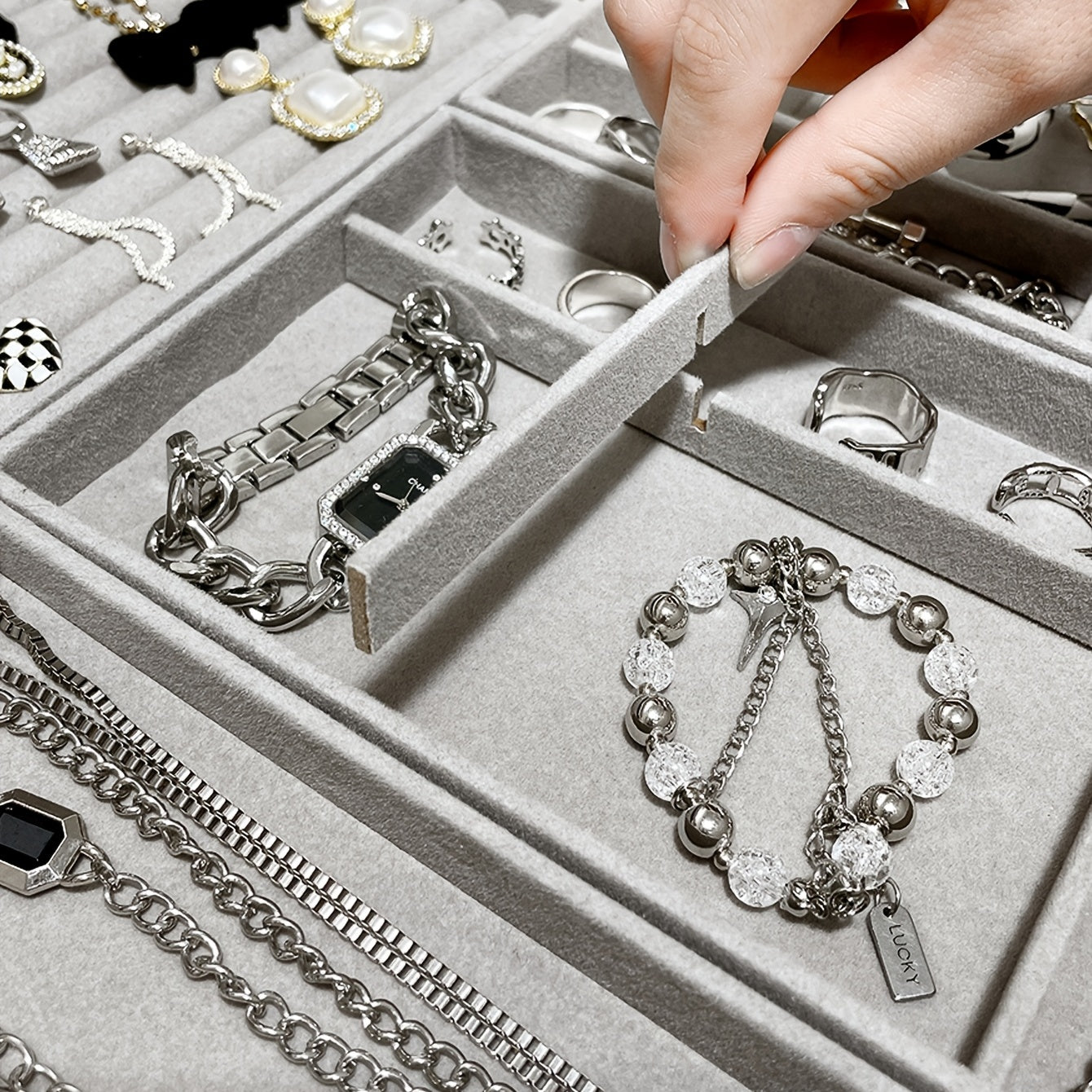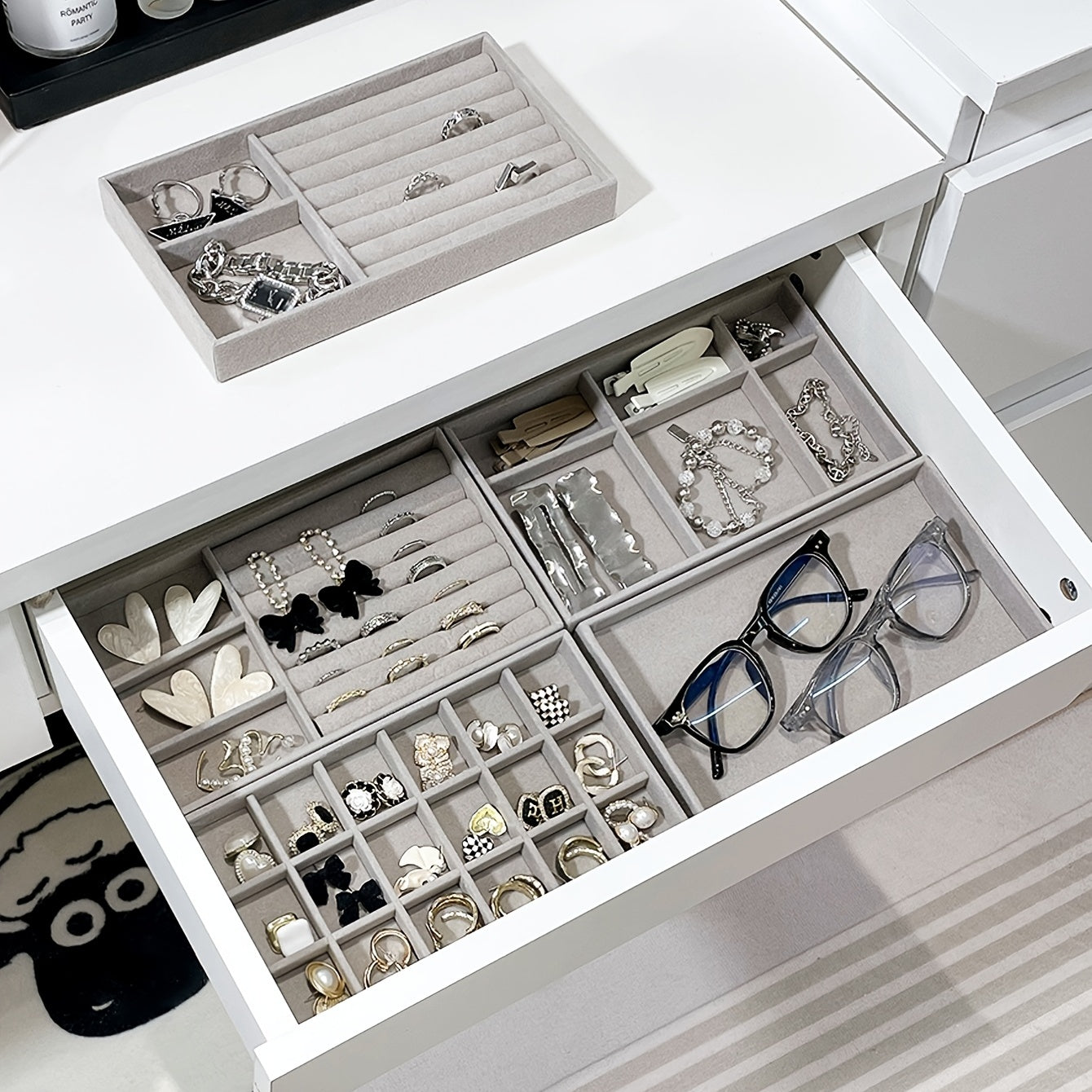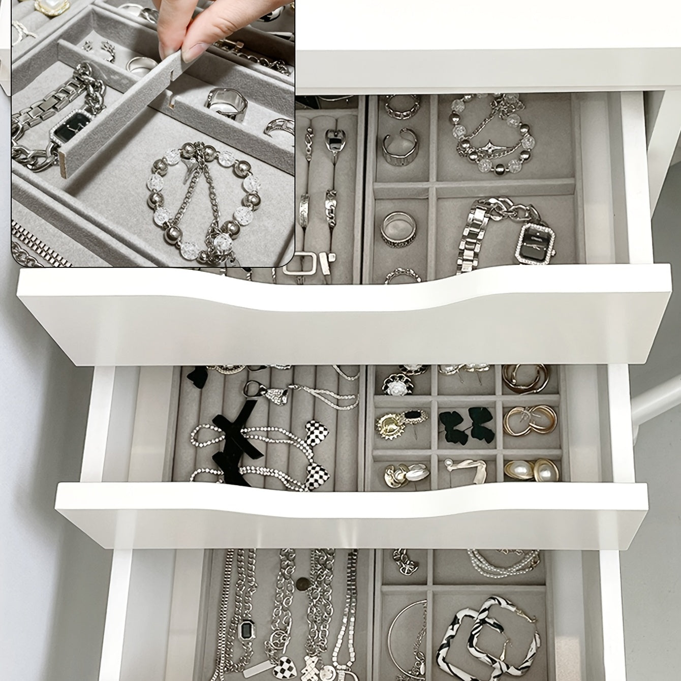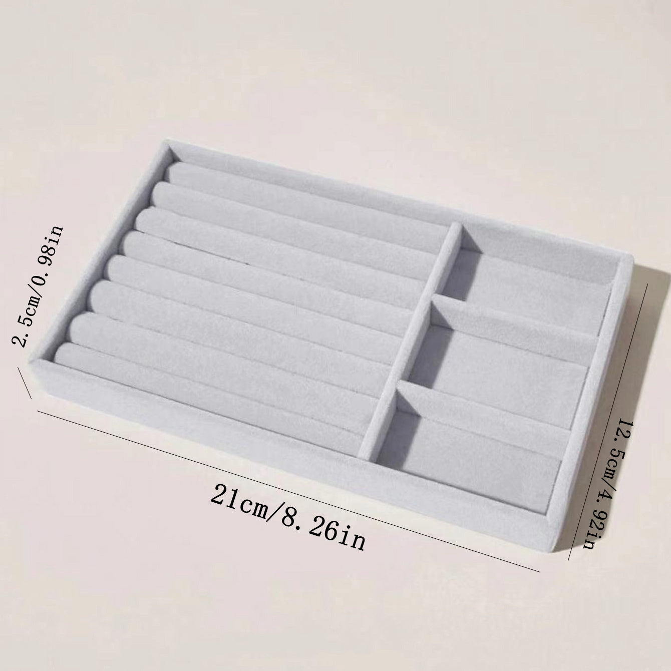 Keep your earrings, rings, necklaces, and other jewelry organized with this stylish gray beige flannel tray.