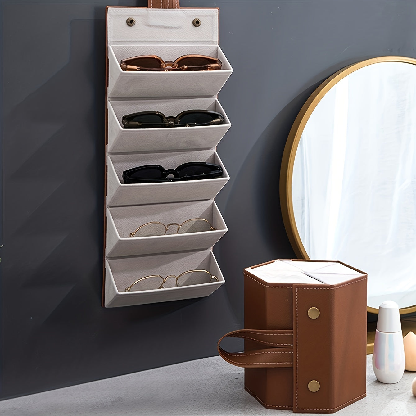 This functional grid storage box is perfect for organizing your glasses and jewelry. It features compartments for sunglasses, myopia glasses, and more. The box also includes a mirror for convenience.