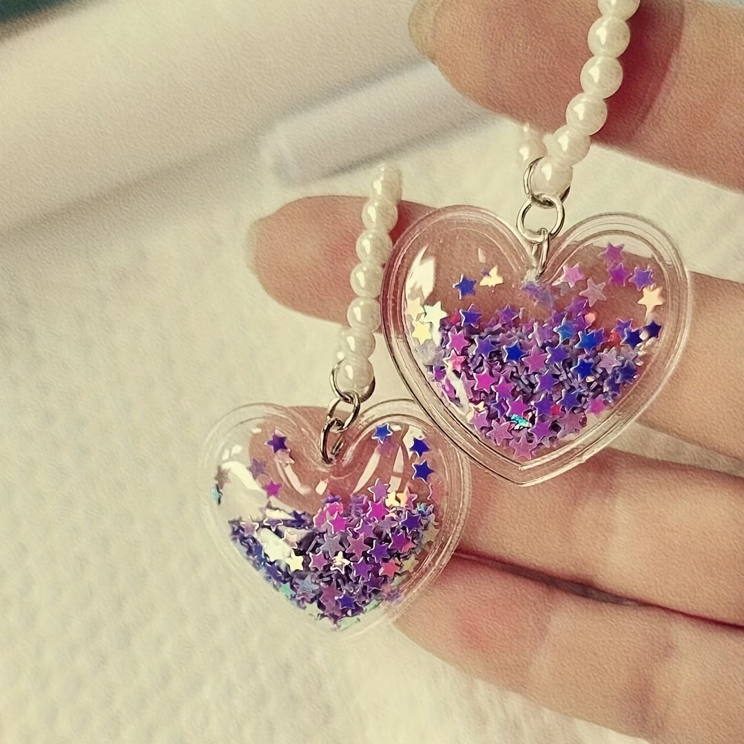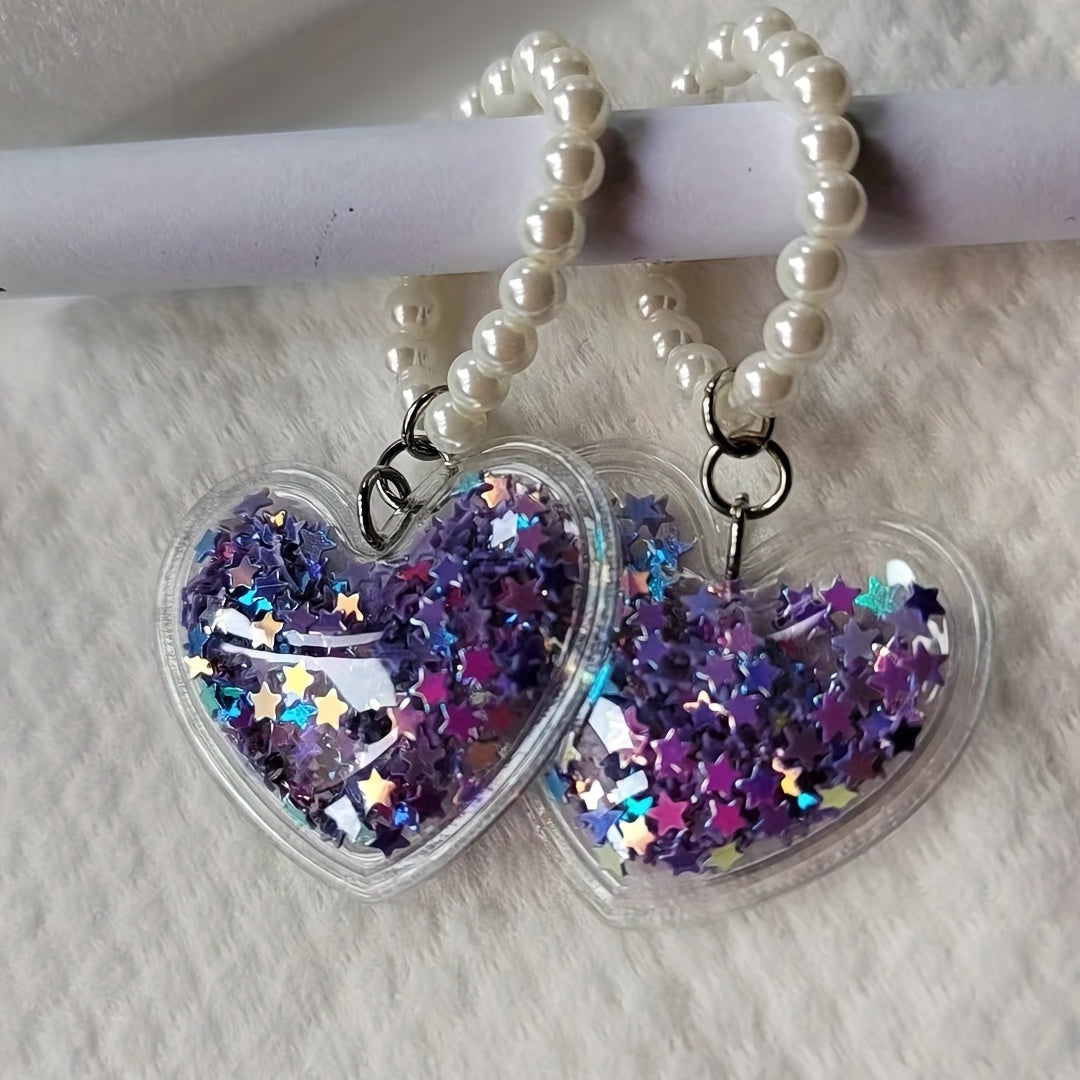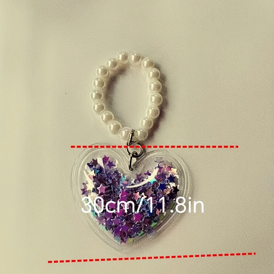 Create your own unique necklace, bracelet, or earring with this DIY pendant. The pendant features a lovely heart shape and five star design with a quicksand effect, complemented by a simulated pearl beaded chain.