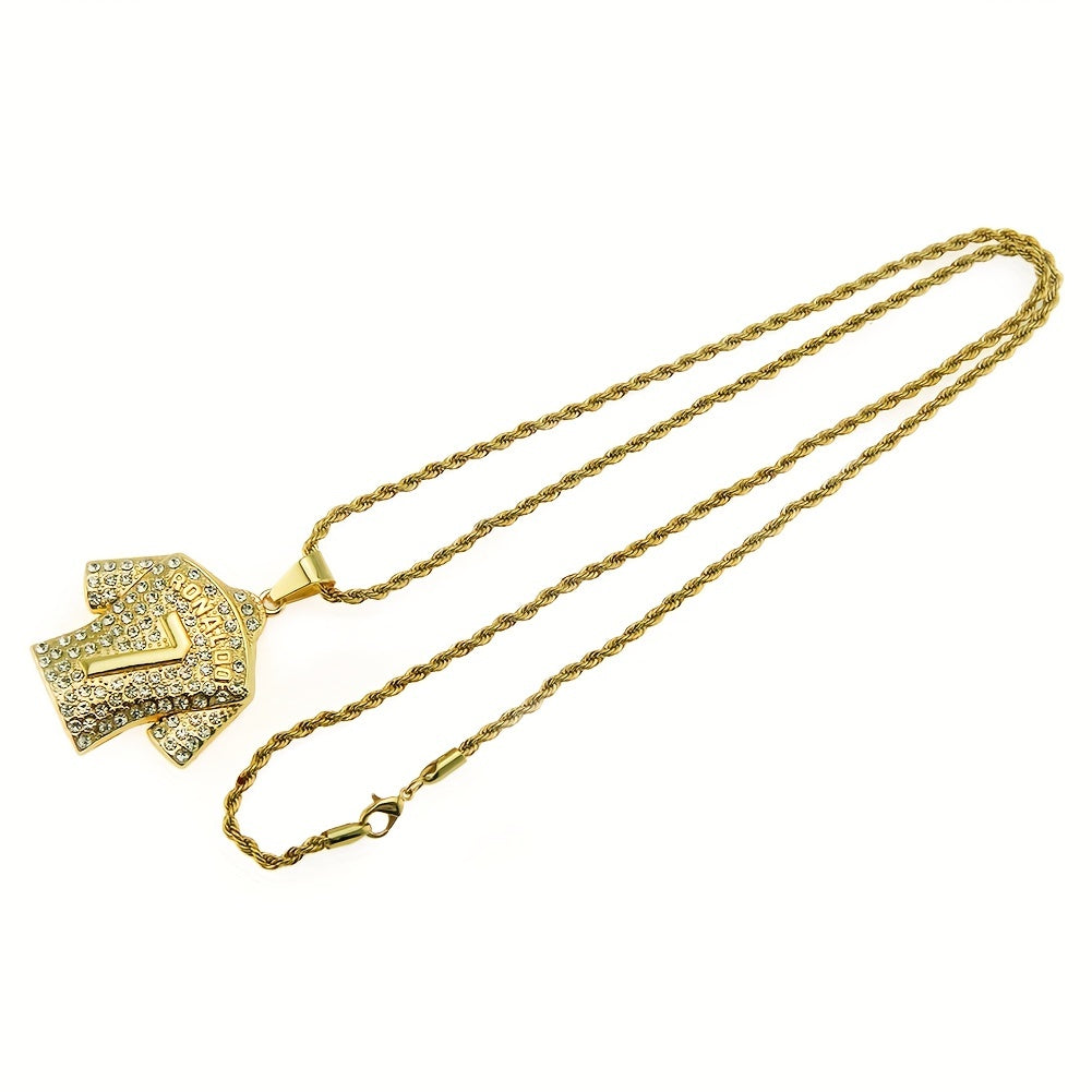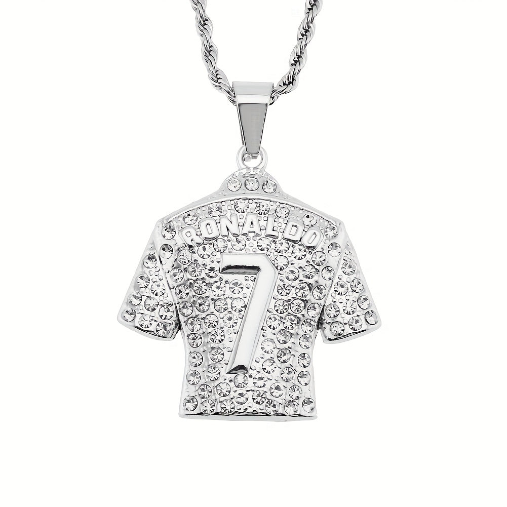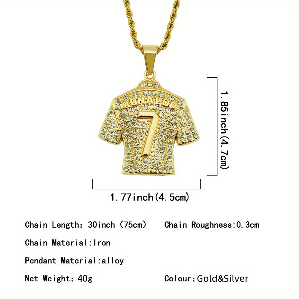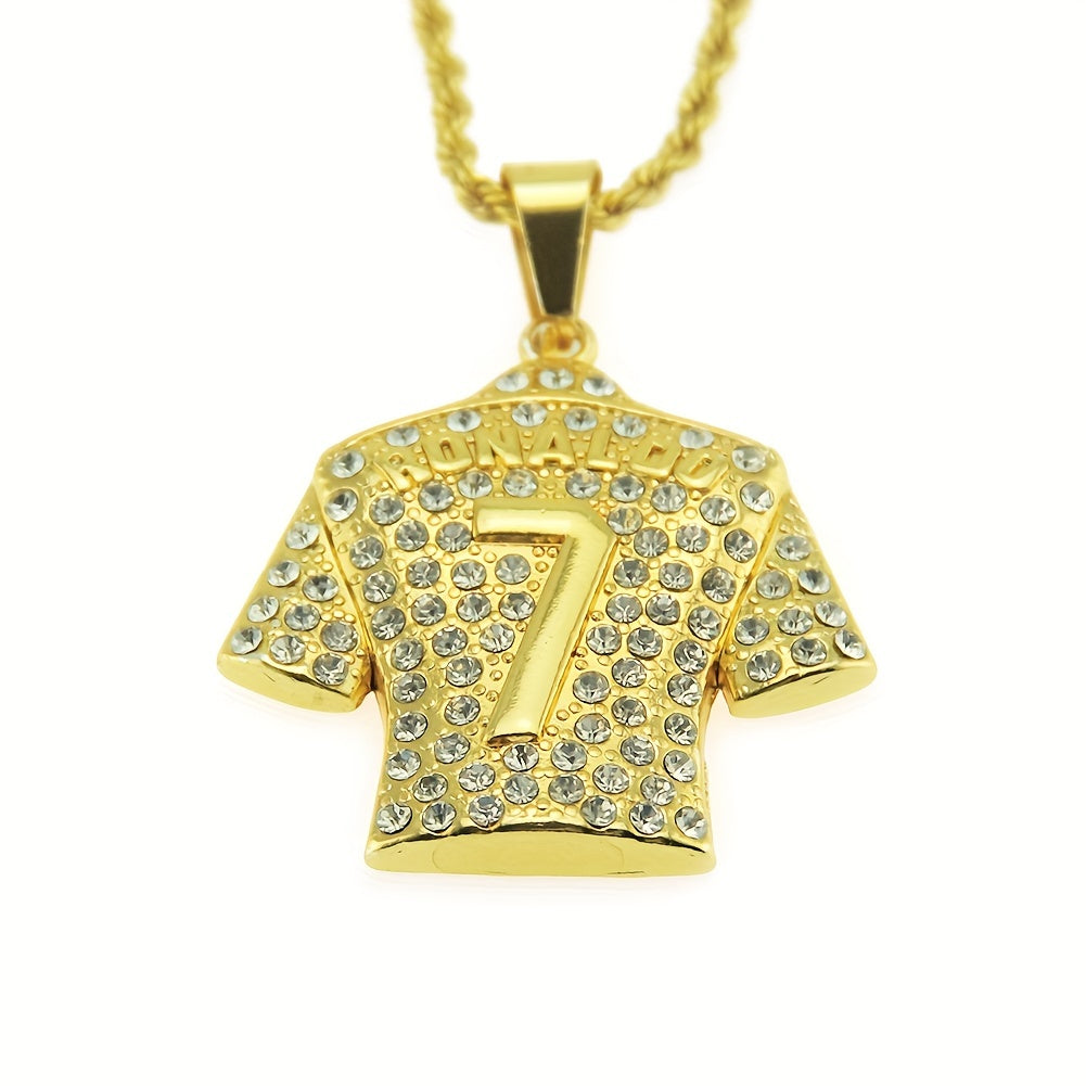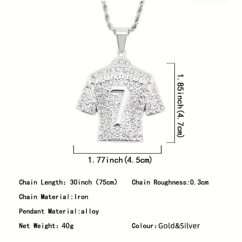 This blinged out necklace features a full rhinestone No 7 jersey pendant in a golden and silvery three-dimensional design. Perfect for hip hop enthusiasts.