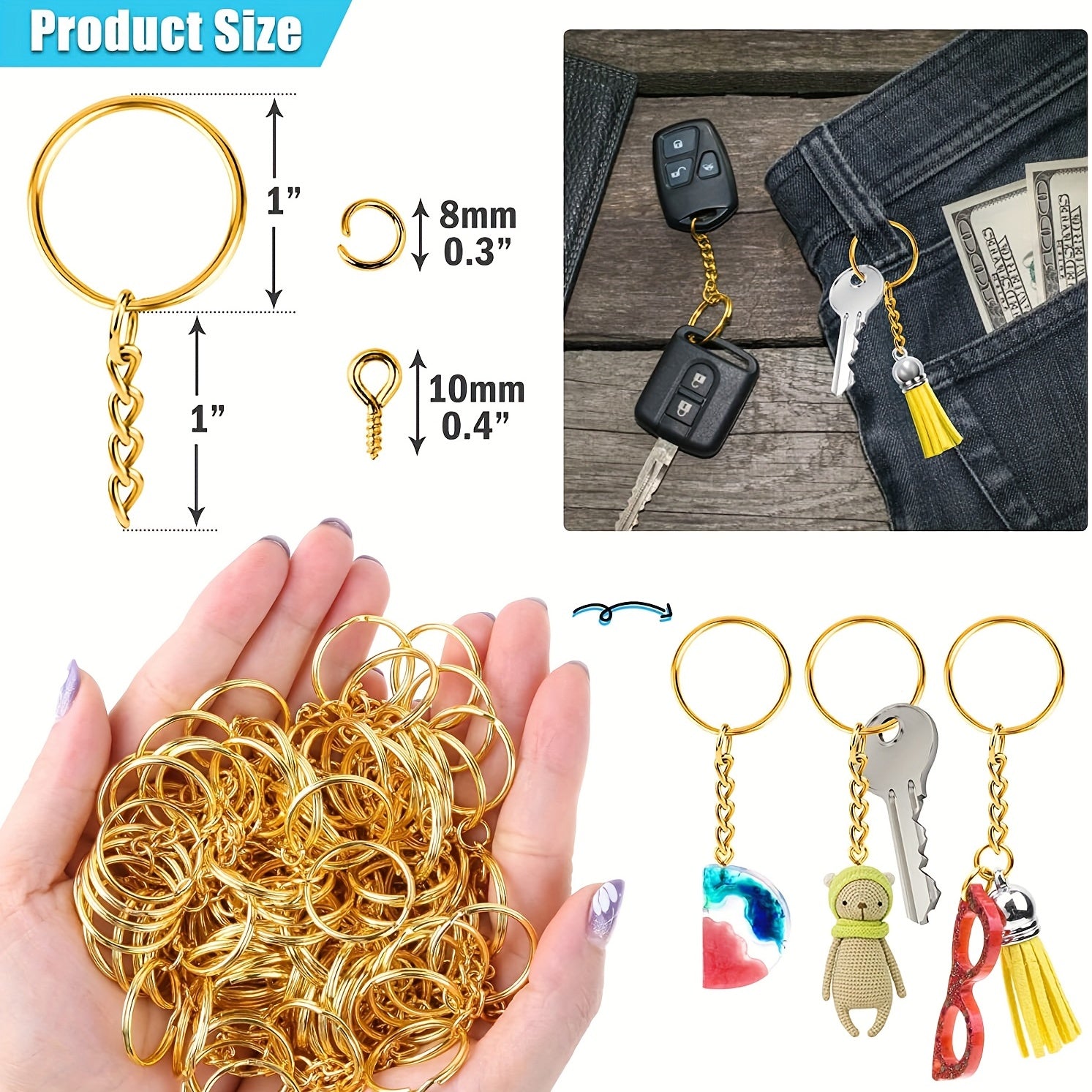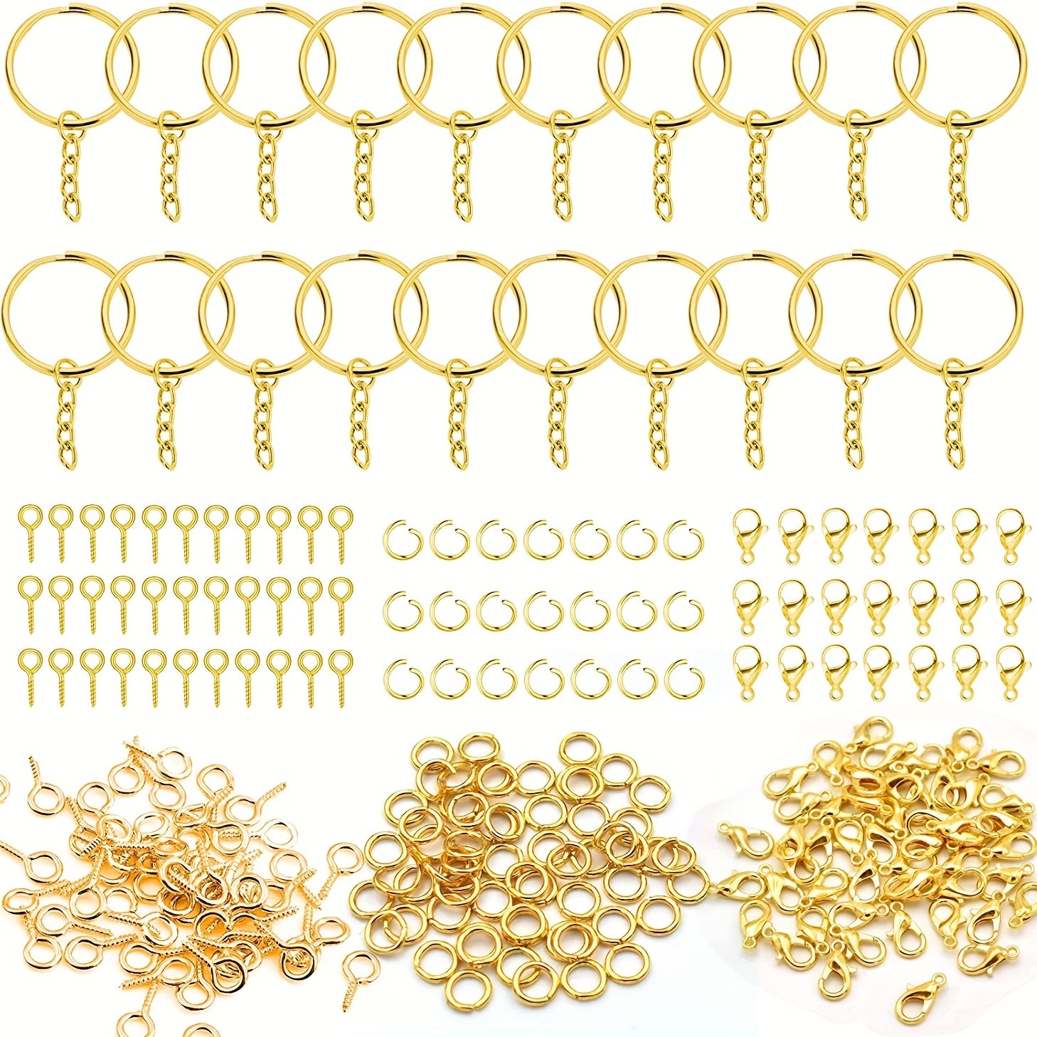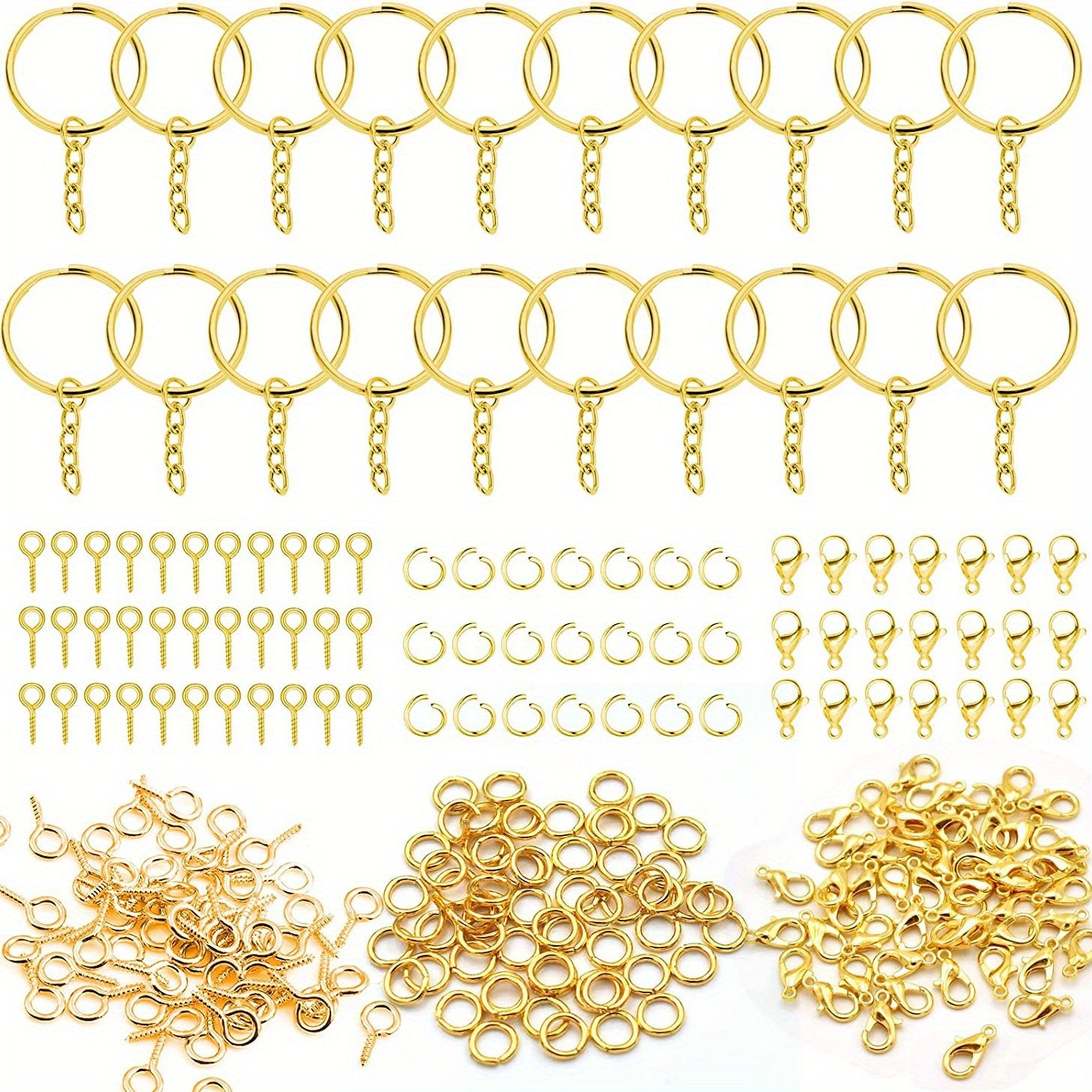 This kit includes 100 split key ring chains, 100 lobster clasps, and 100 jump rings for all your crafting needs.