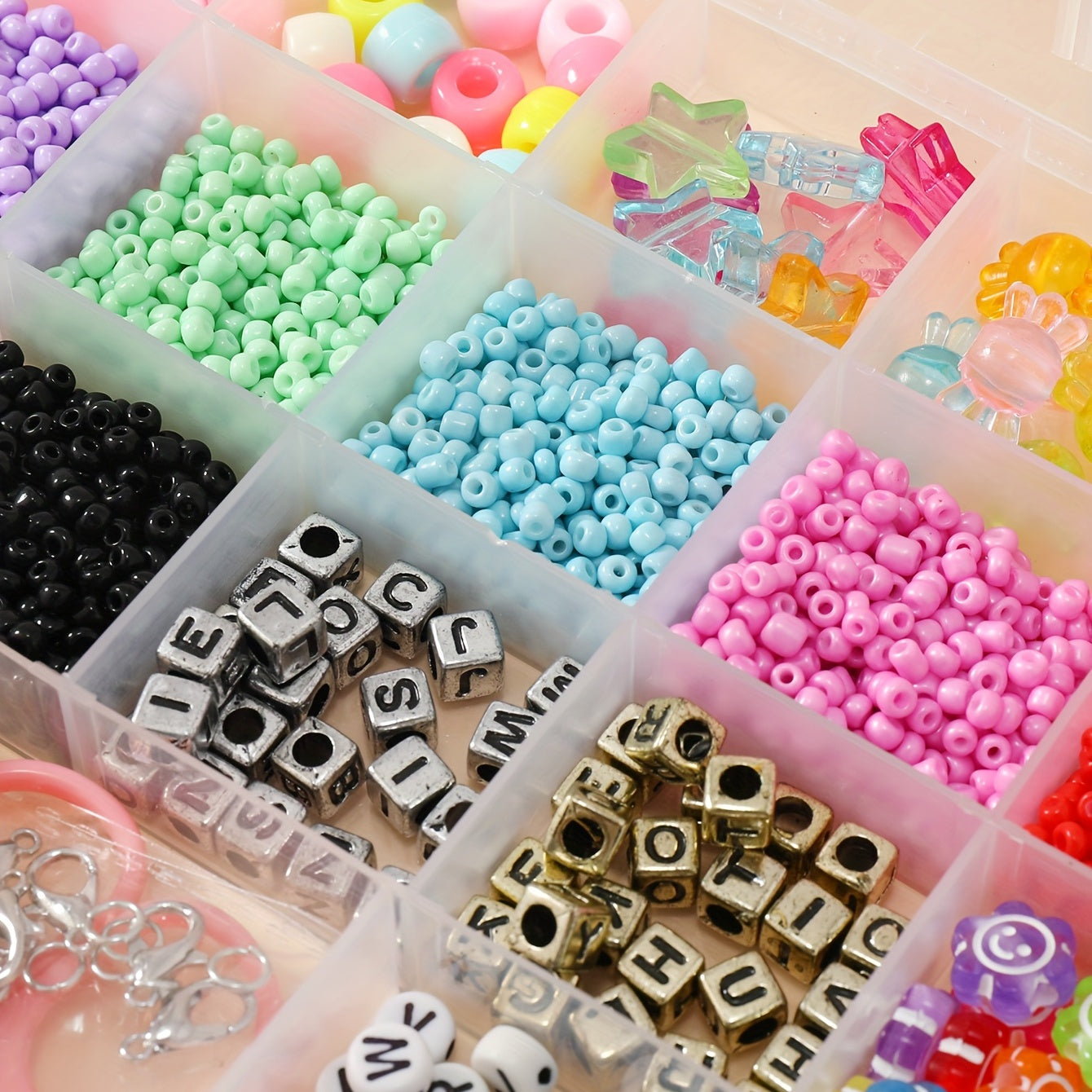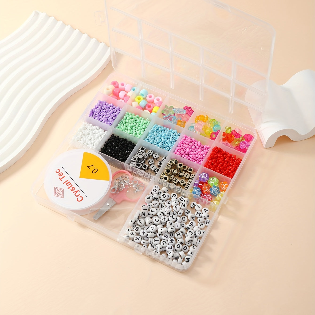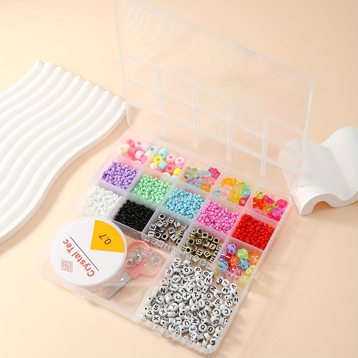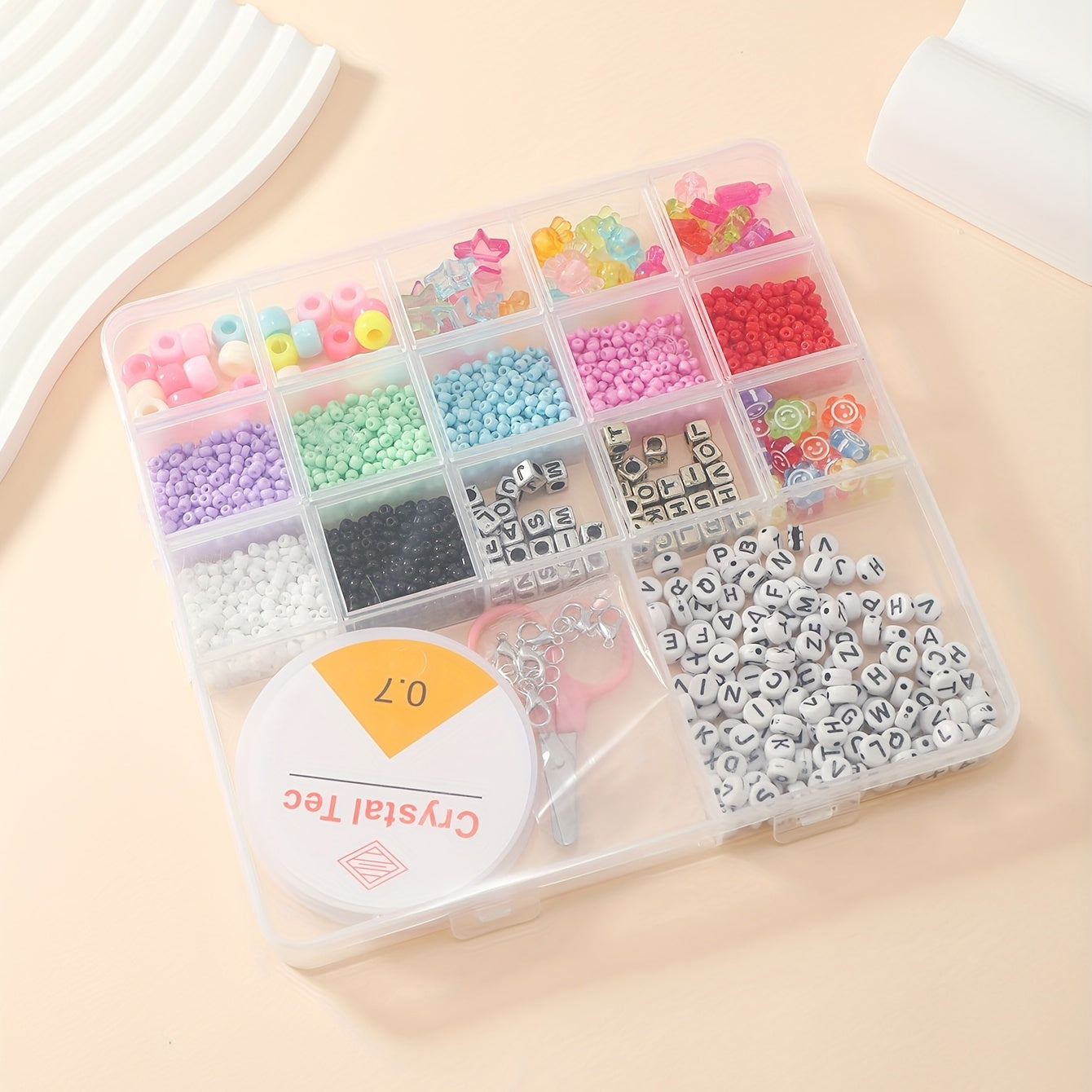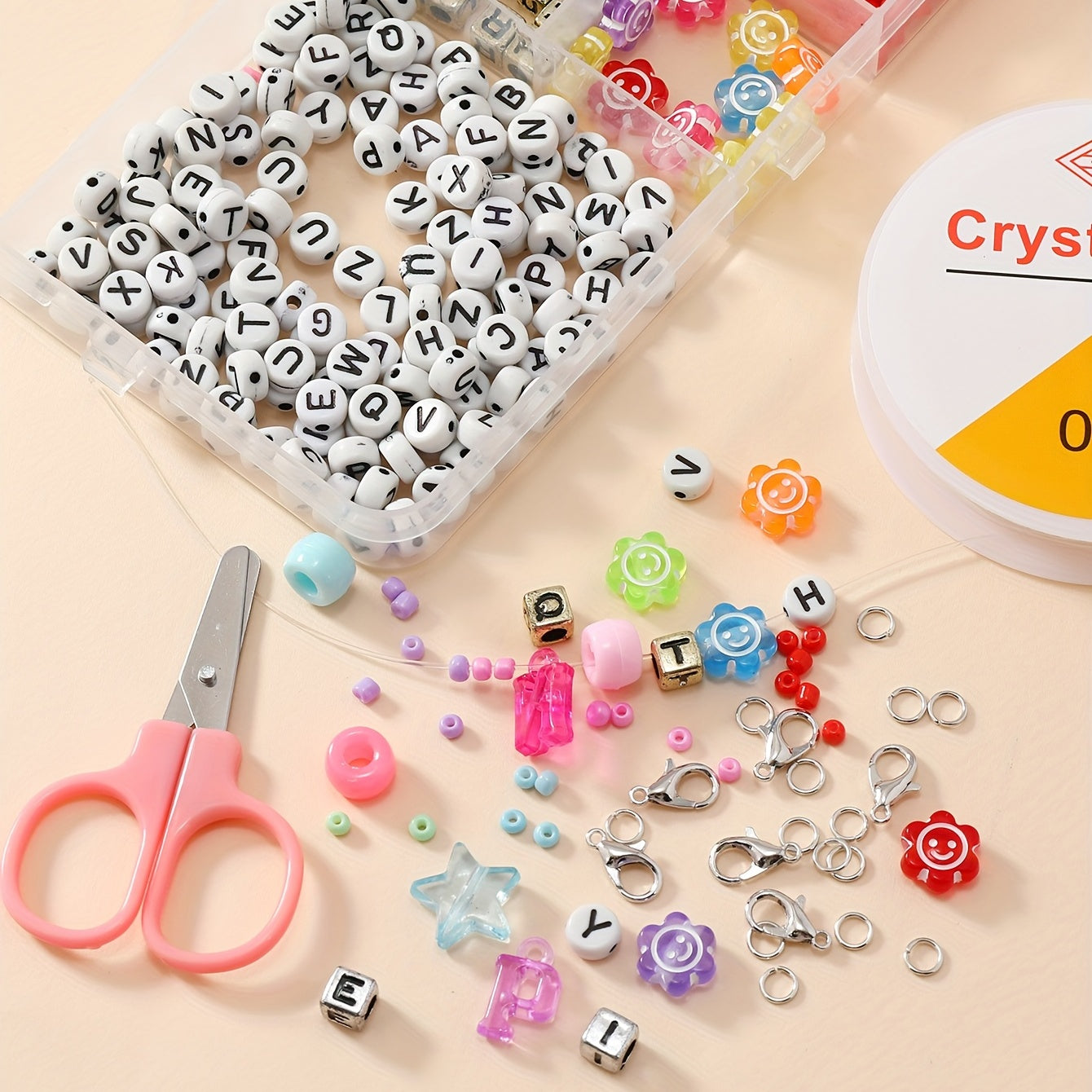 This set includes soft pottery beads, letter beads, glass rice beads, colorful plastic beads, and tools for children's creative jewelry making.