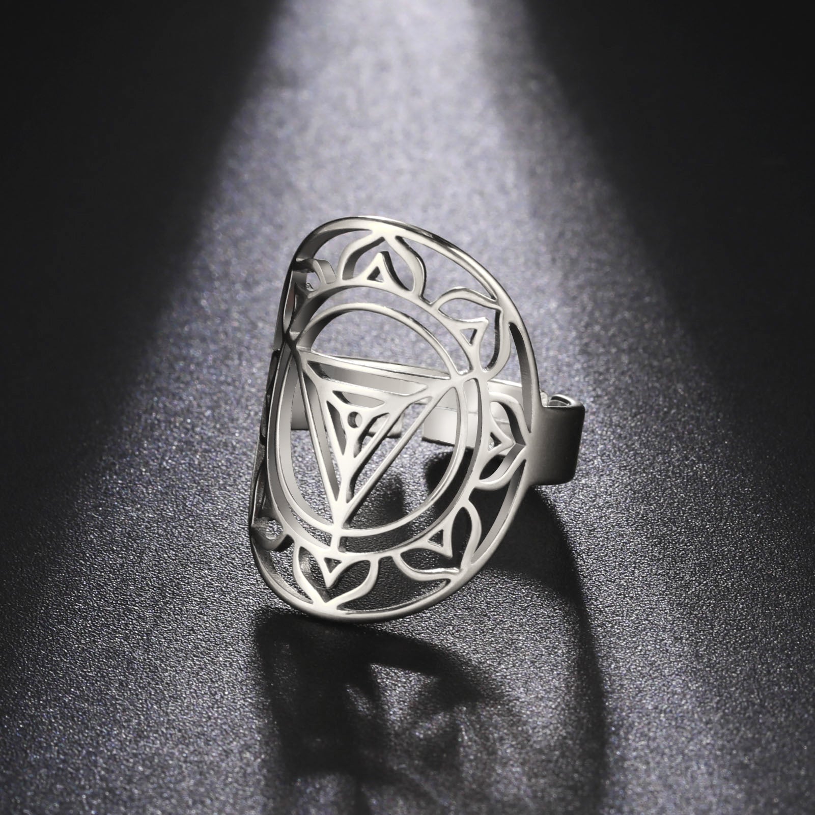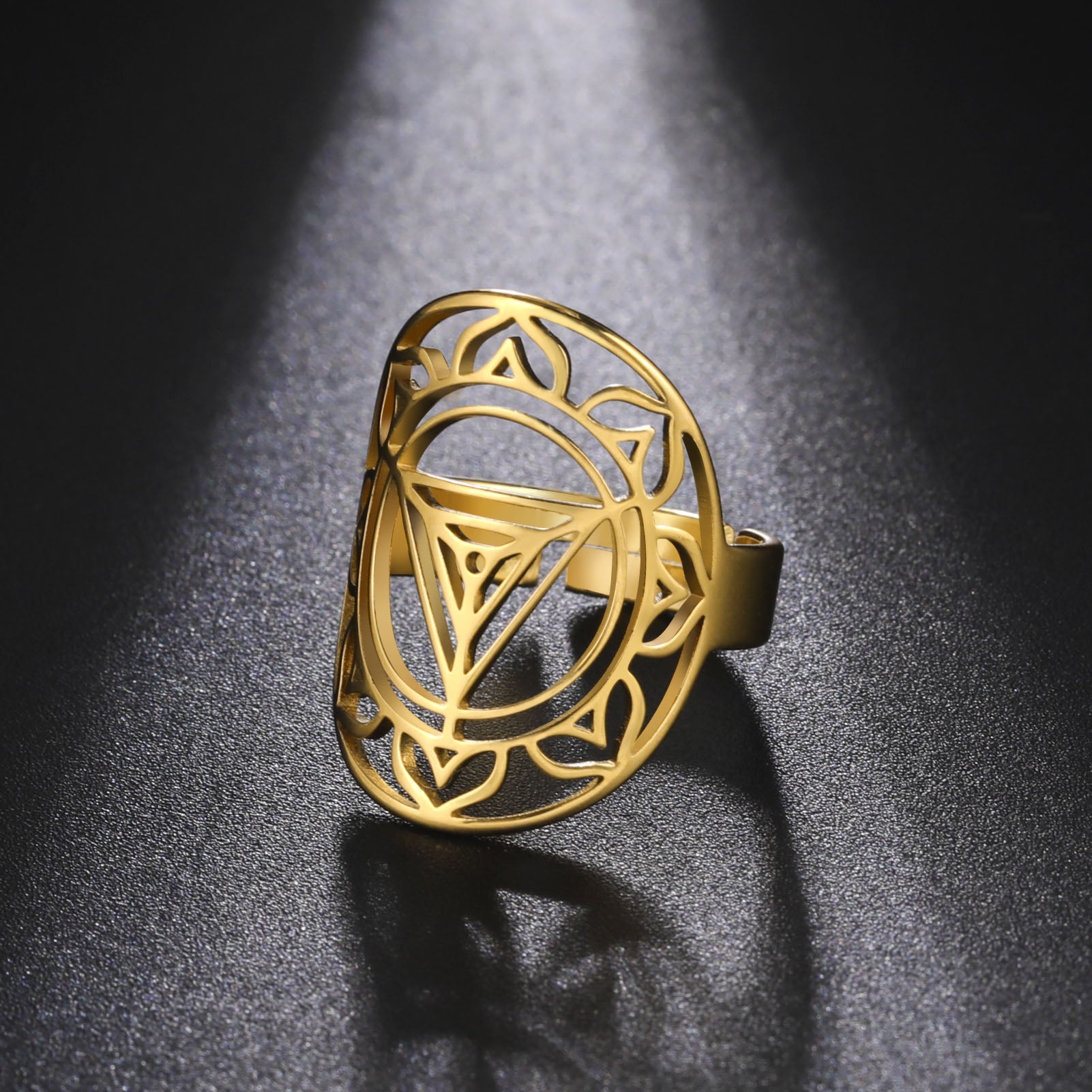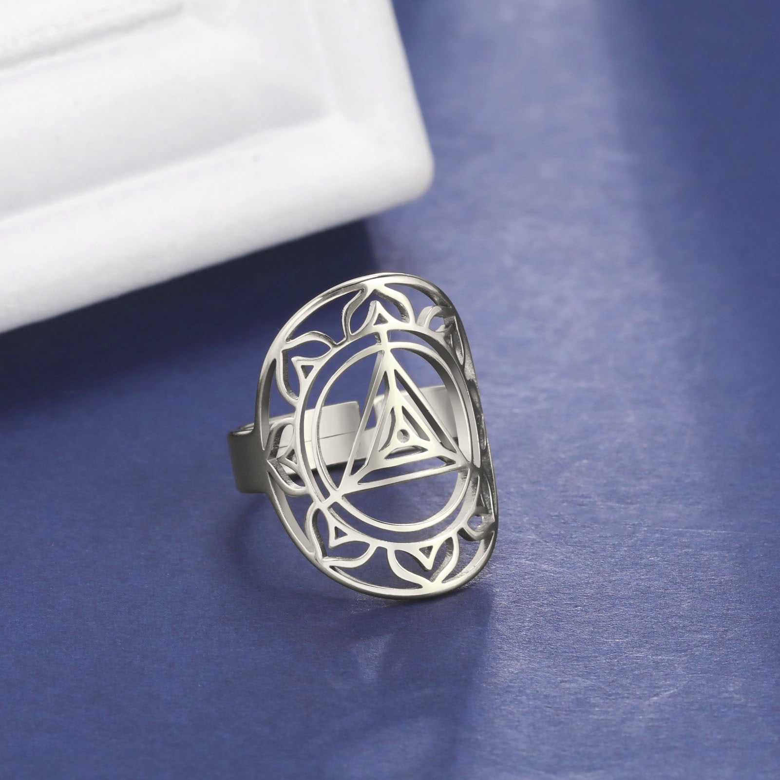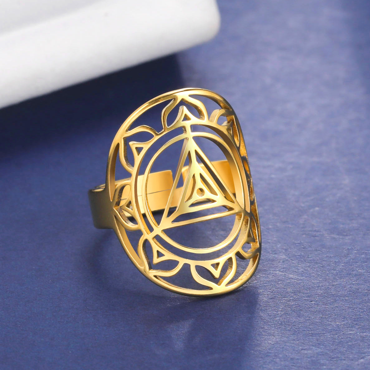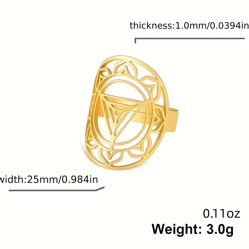 This men's meditation ring features an adjustable design with a lotus flower motif. Crafted from stainless steel, it combines a golden and silvery finish, making it a meaningful and stylish accessory for daily wear or meditation practices.