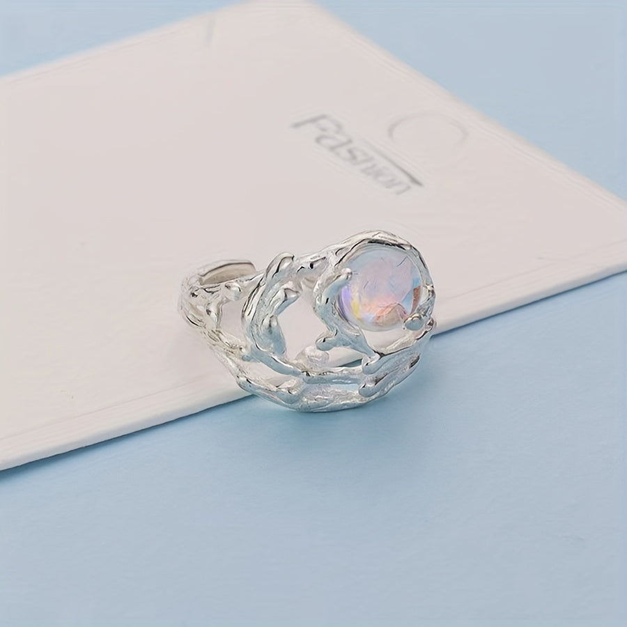 This unique men's ring features a tree texture inlaid with moonstone. It is adjustable to fit different finger sizes. Perfect for couples or as a stylish accessory.